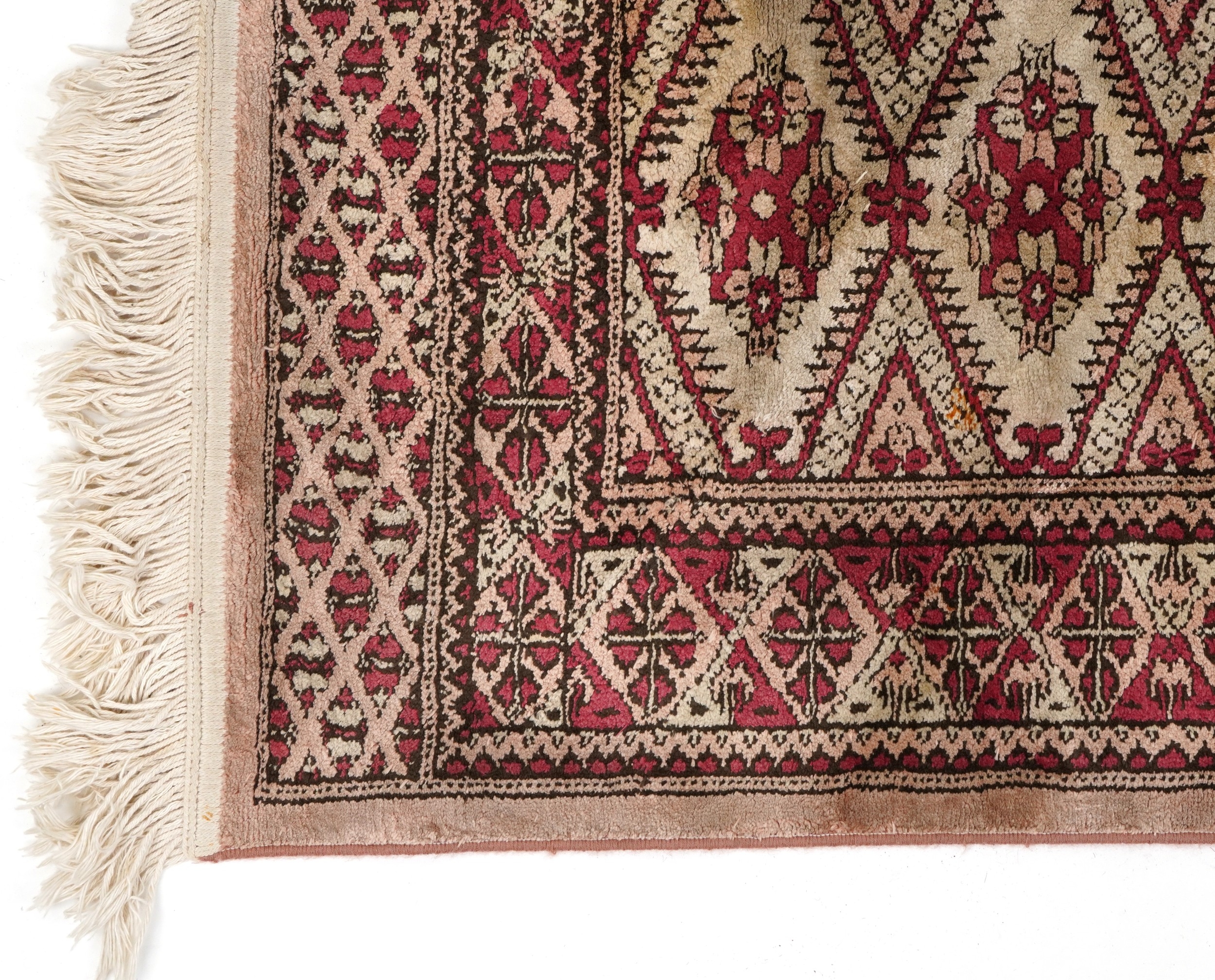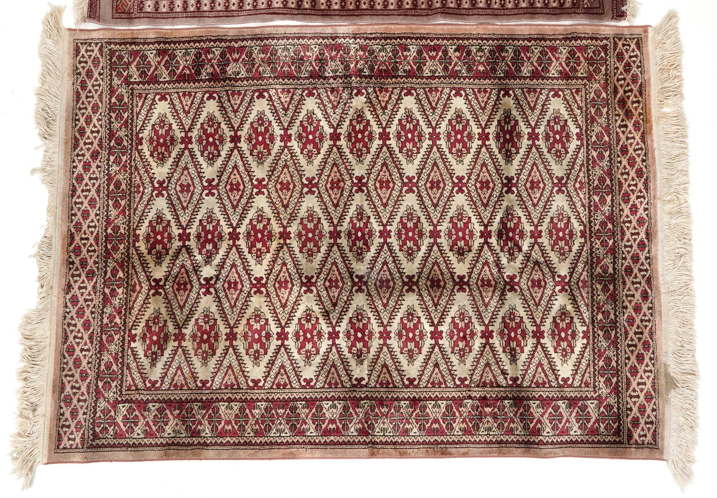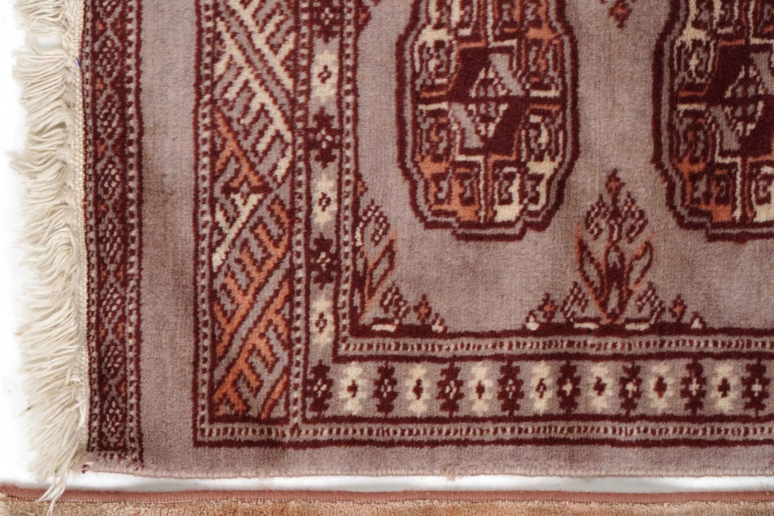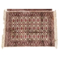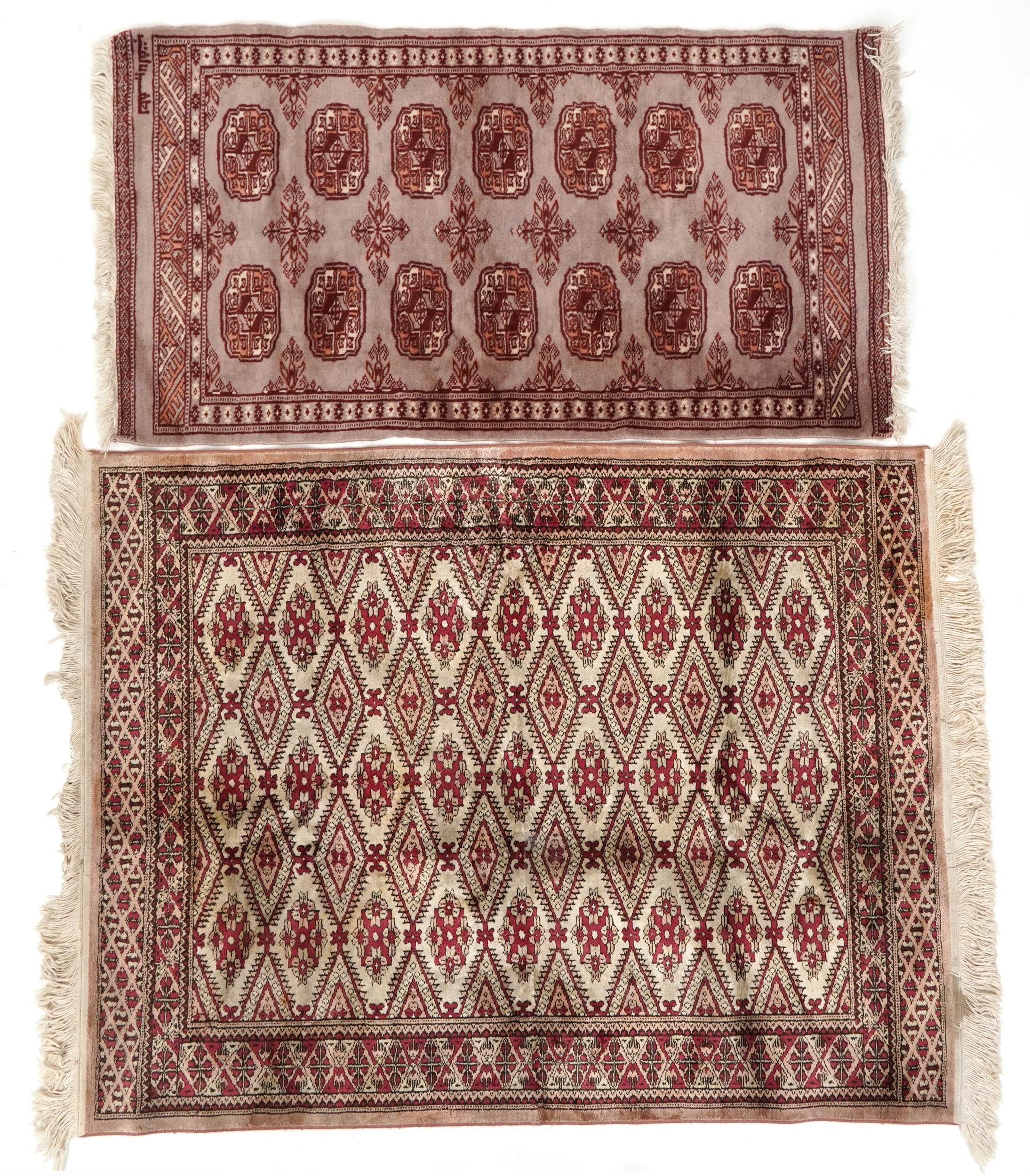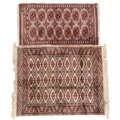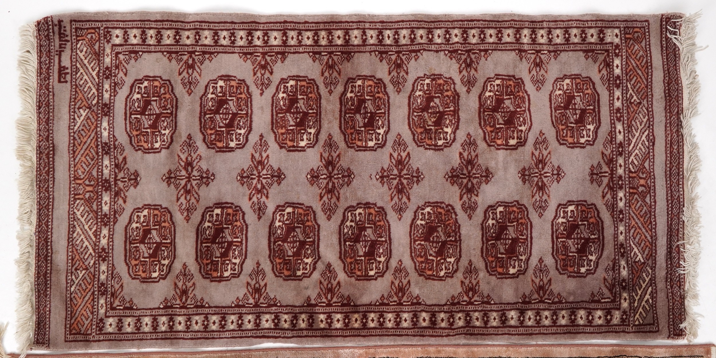 A Pakistan Bokhara rug, 20th century, the grey field with two columns of guls within a complementary border, bearing signature, 125cm x 65cm together with a similar machine made rug.