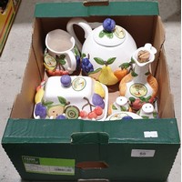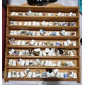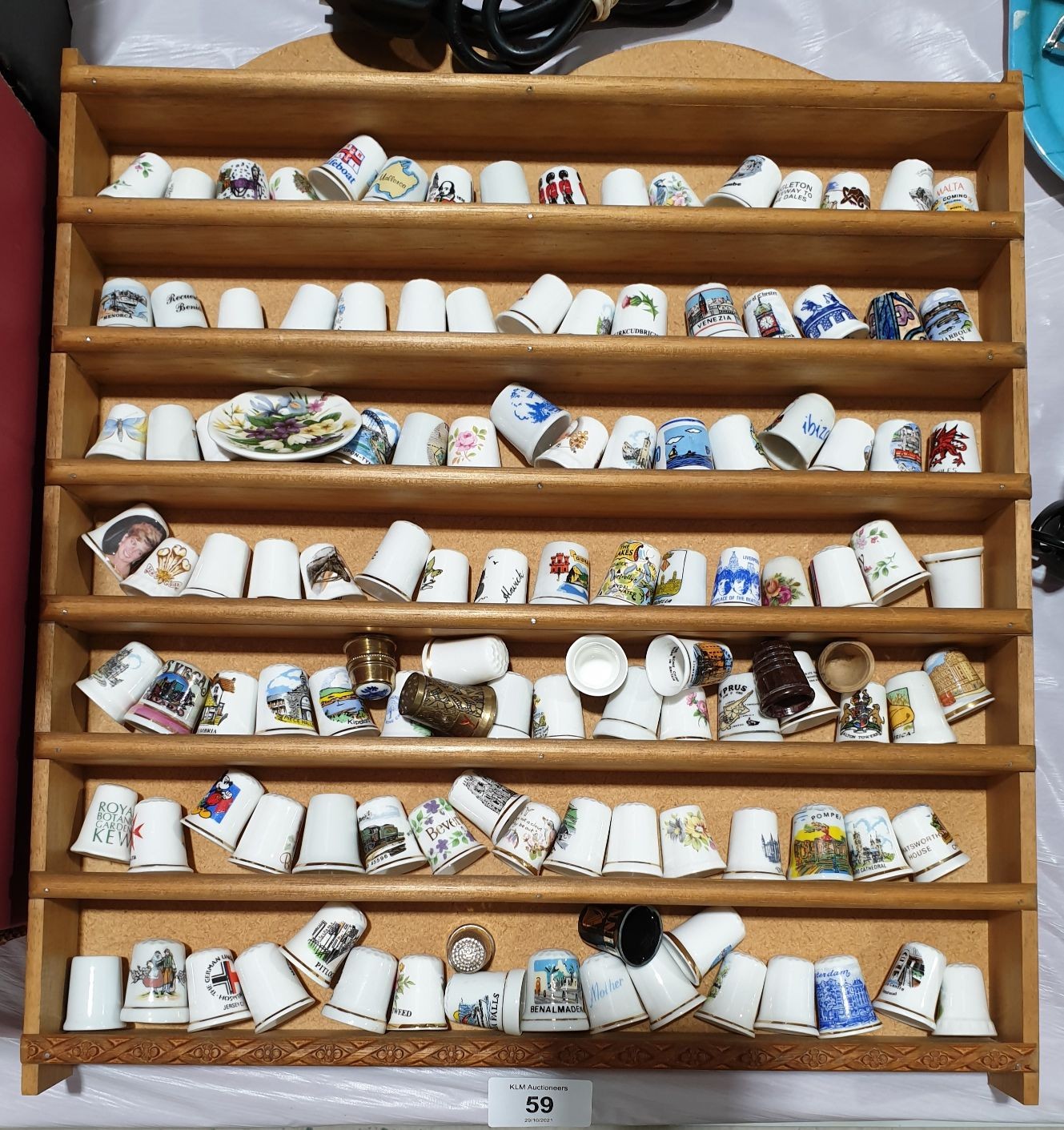A collection of ceramic thimbles in a wooden rock, height 15".