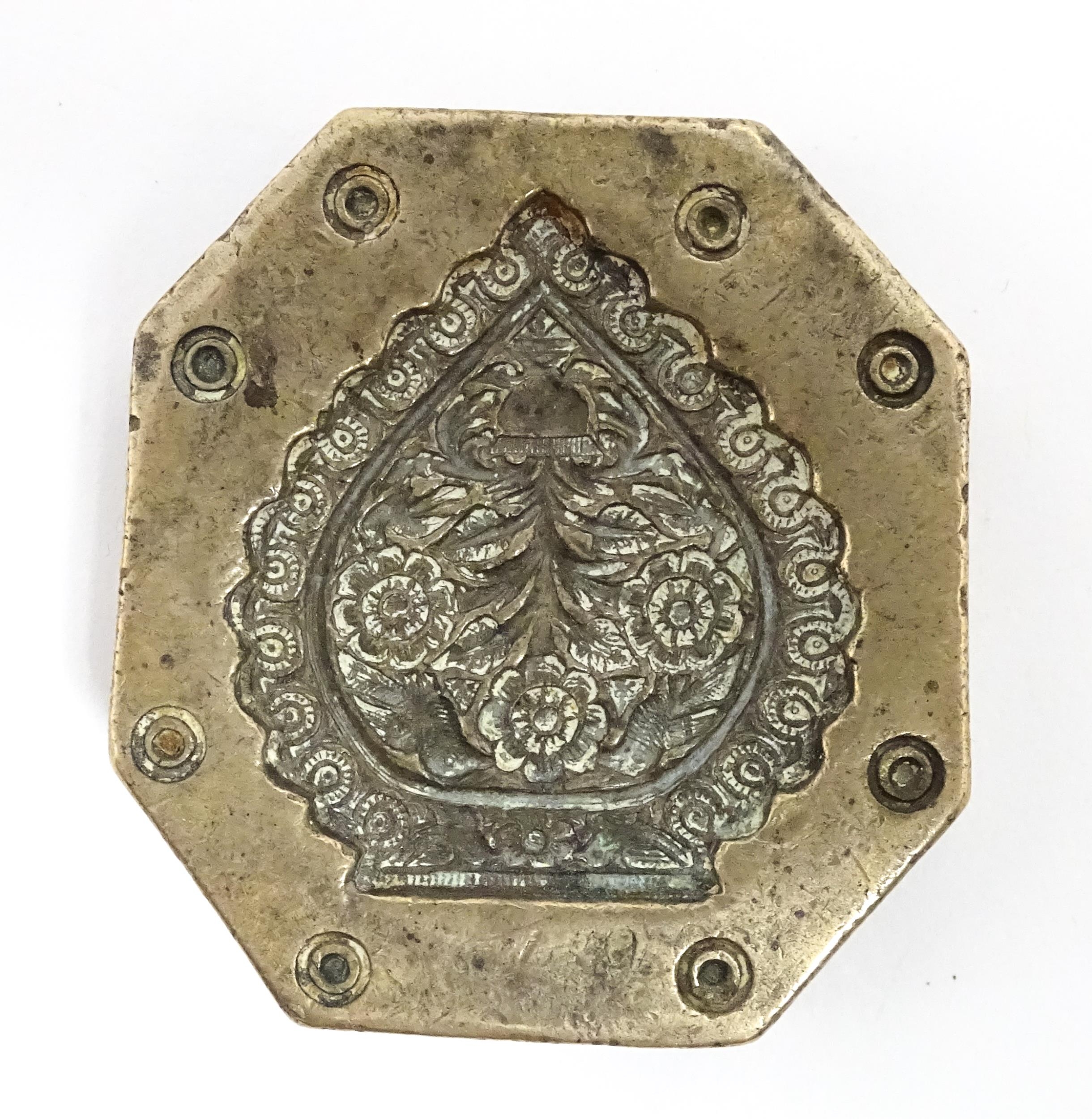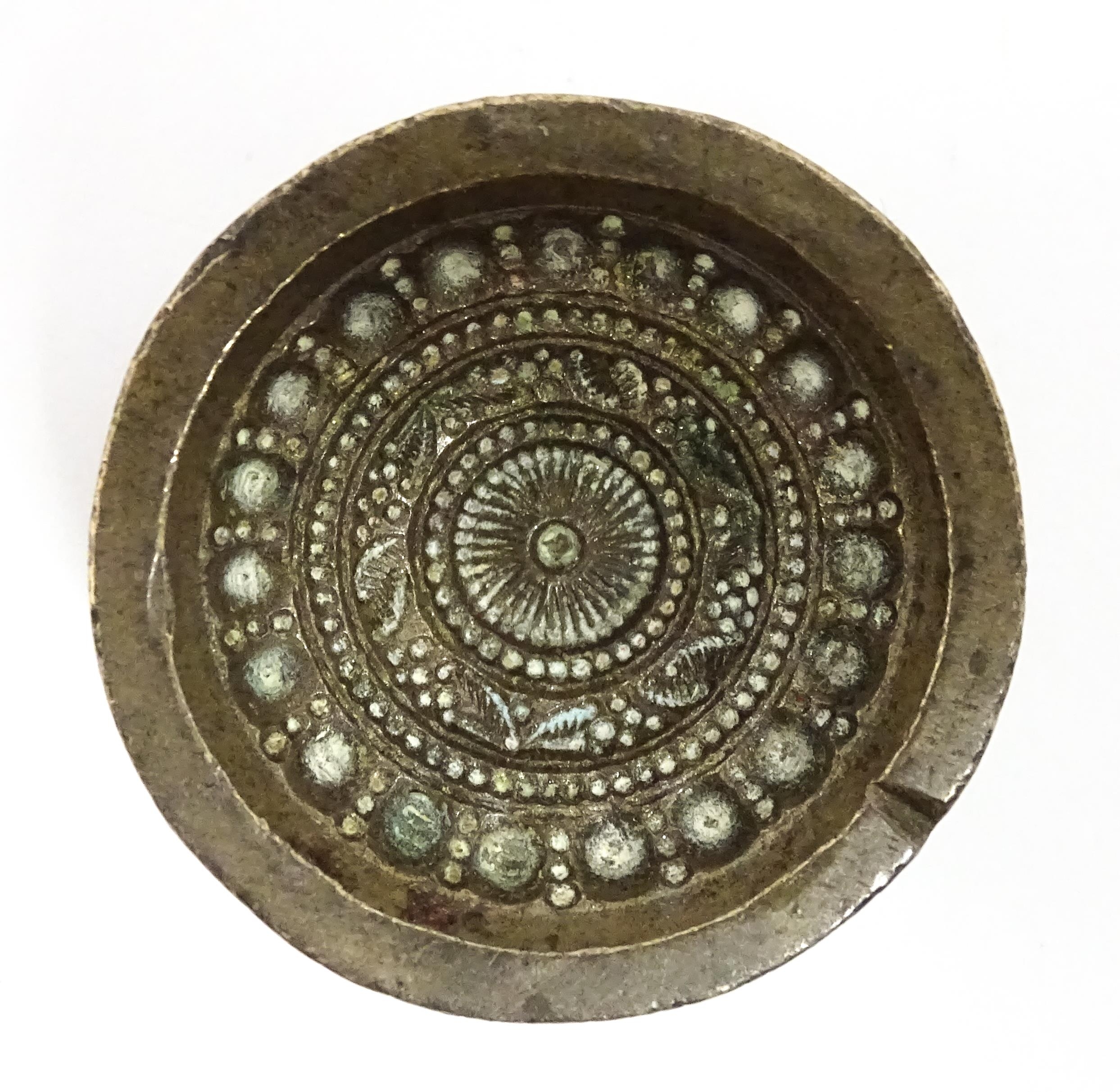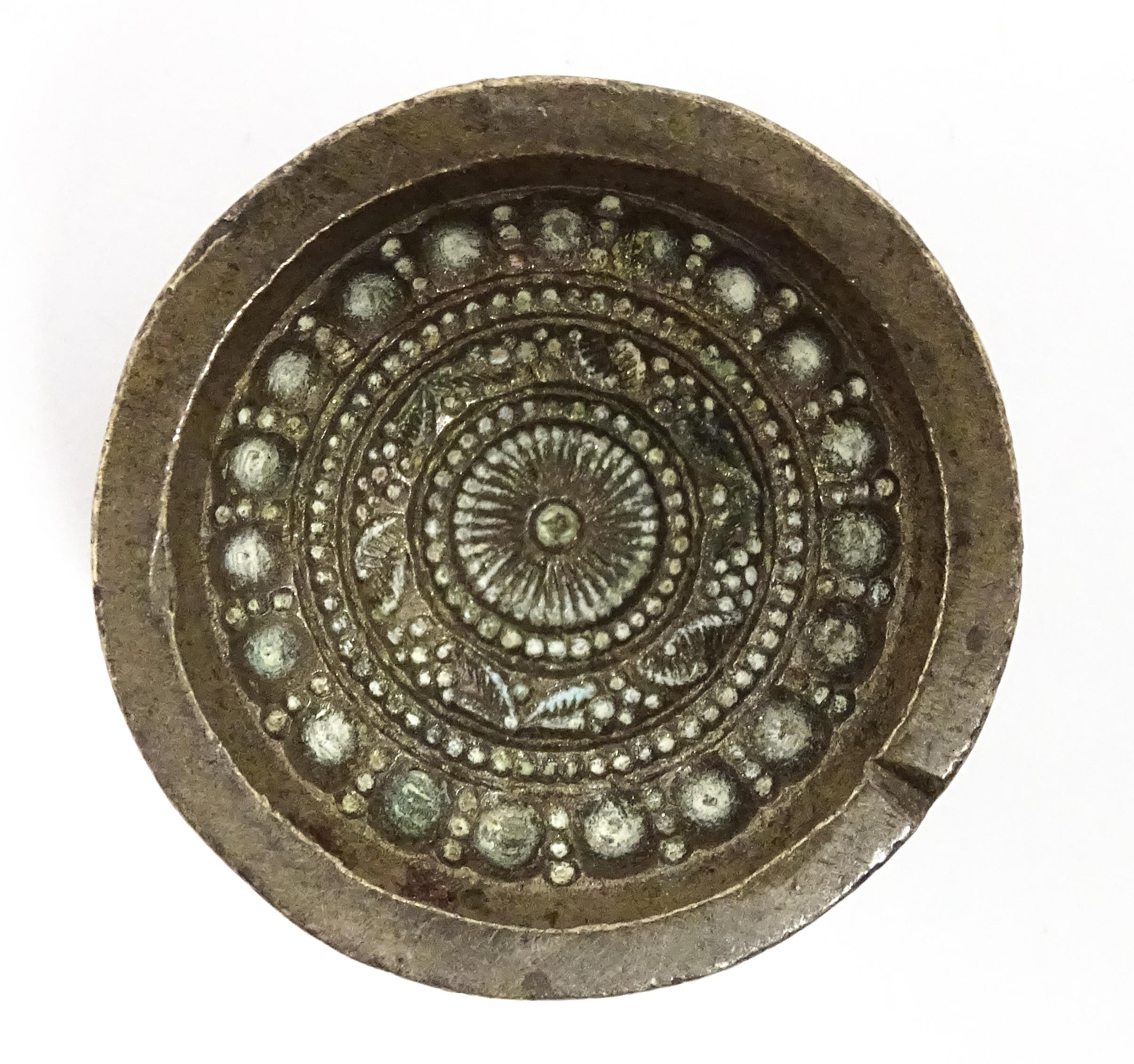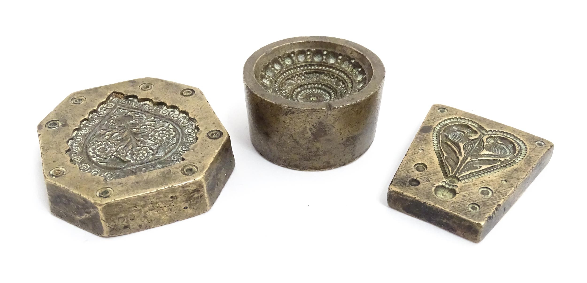 Three Indian cast bronze jeweller's moulds, two having floral and foliate detail, and one of roundel form with banded detail. Largest approx. 1 3/4" high (3)