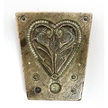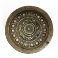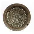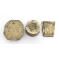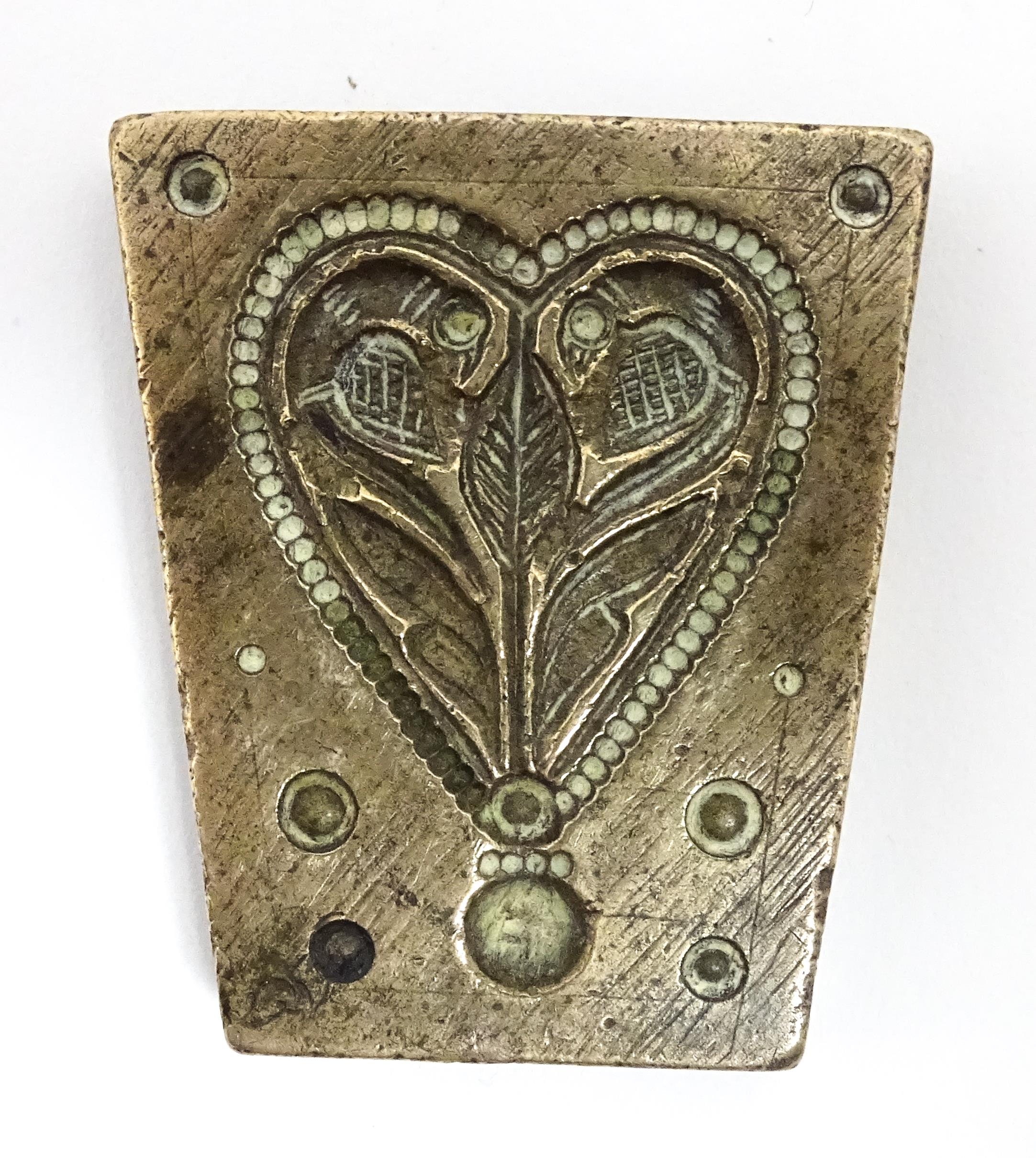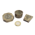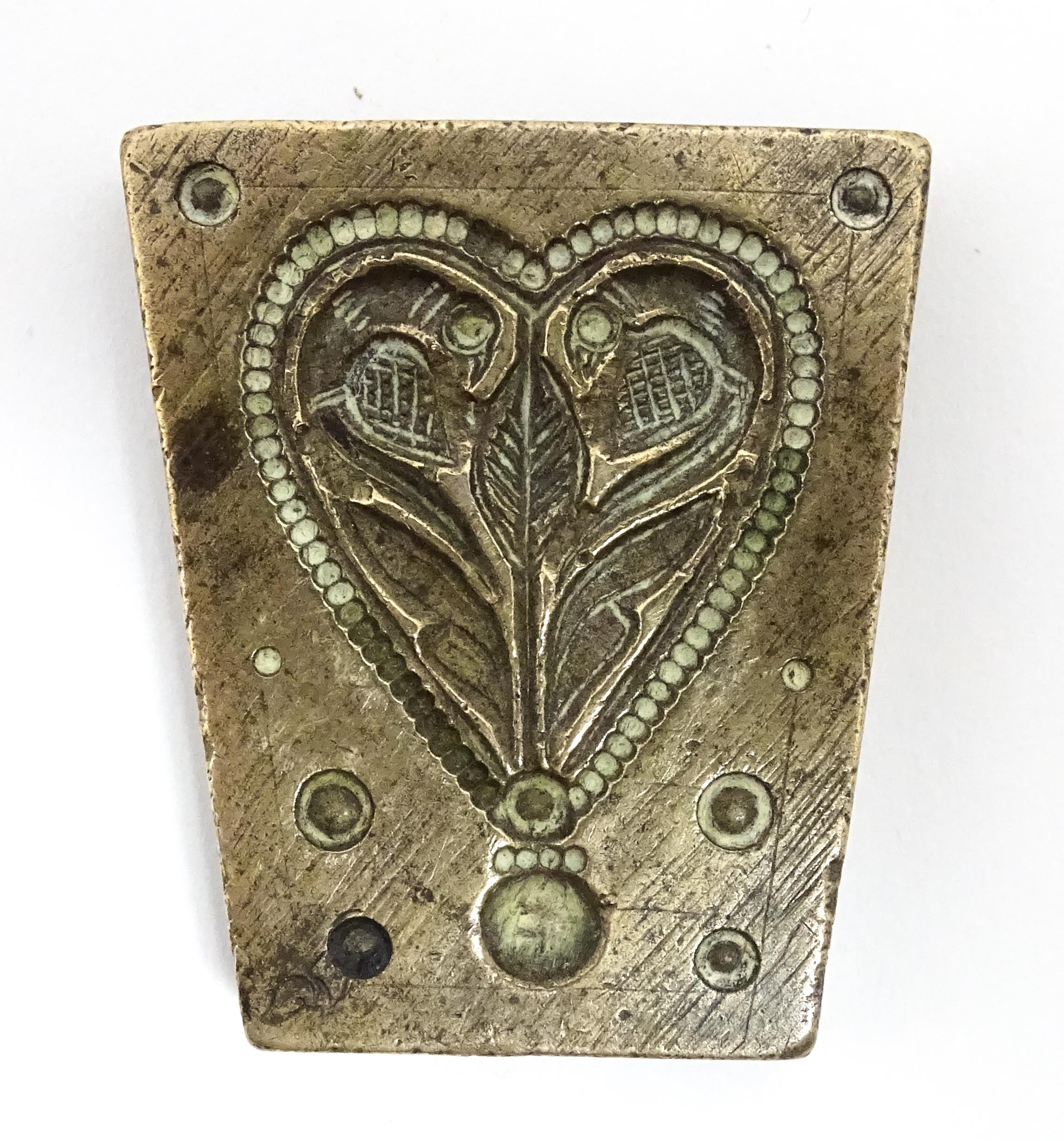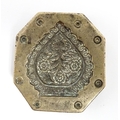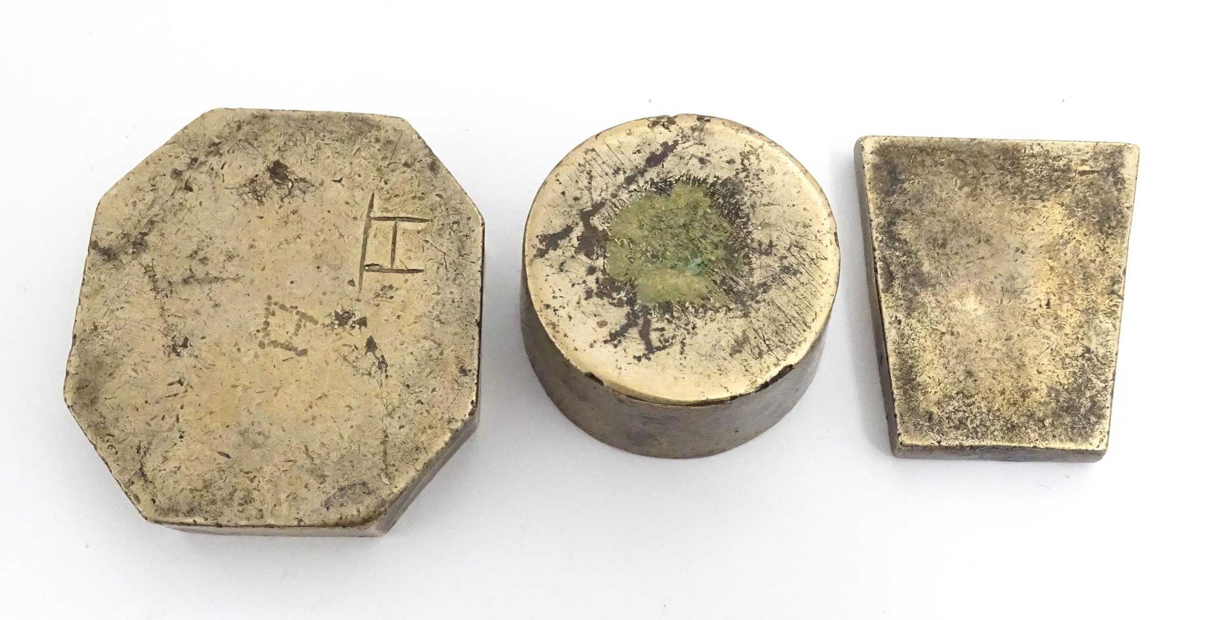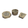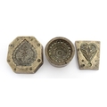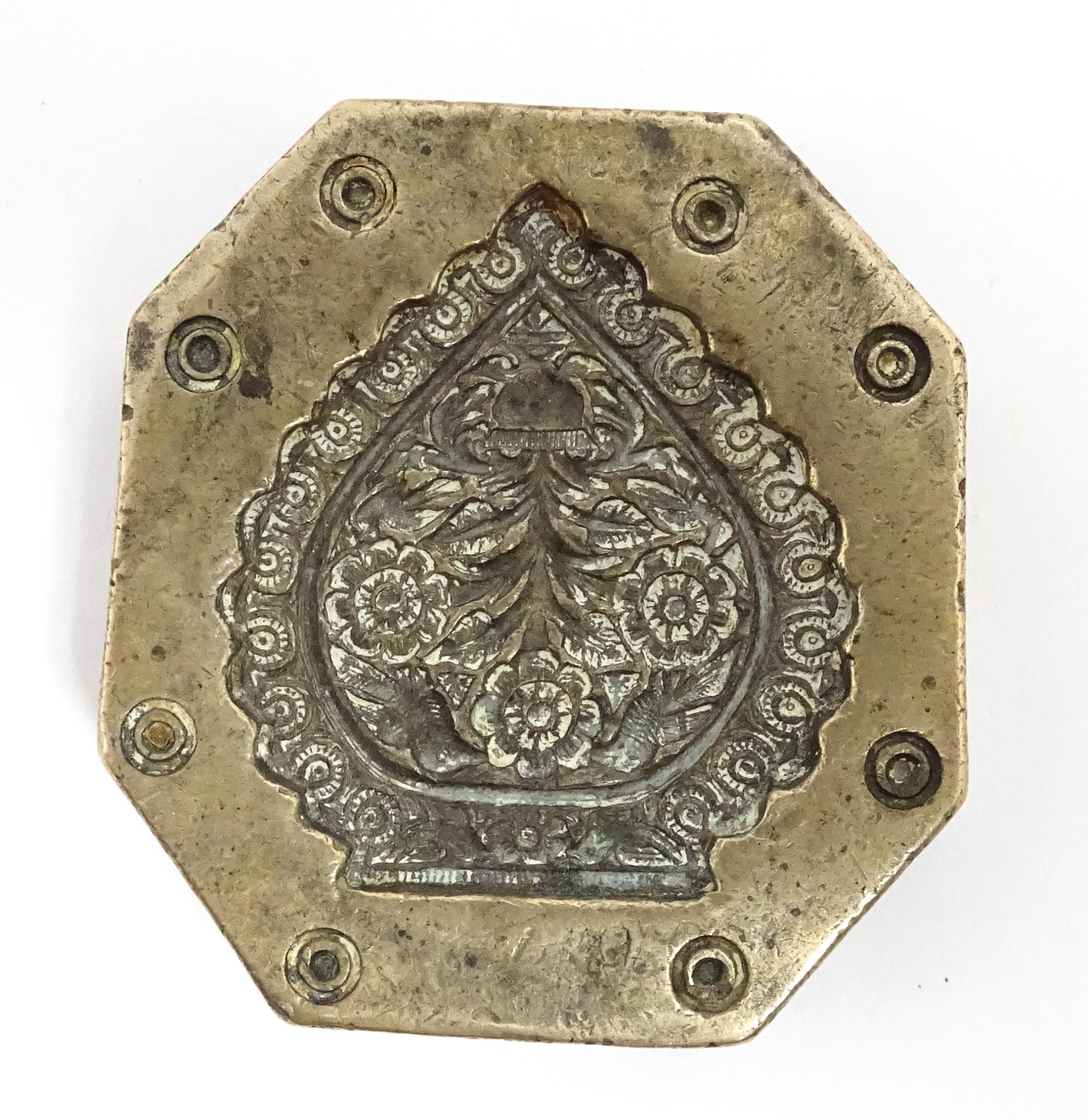 Three Indian cast bronze jeweller's moulds, two having floral and foliate detail, and one of roundel form with banded detail. Largest approx. 1 3/4" high (3)