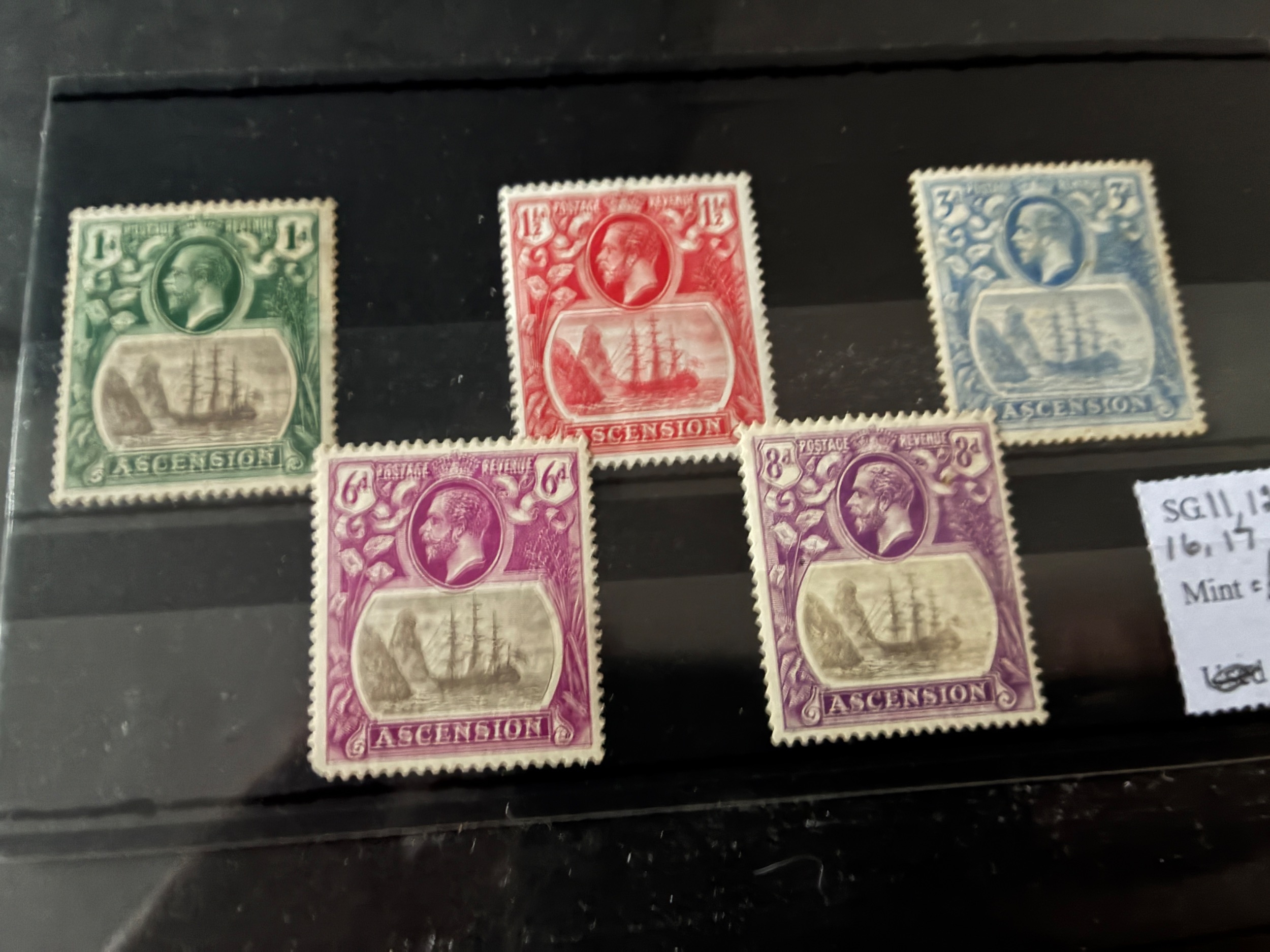 Ascension 1924-33 1d grey-black & deep blue-green, 1.5d rose-red, 3d blue, 6d grey-black & bright purple (short corner perf), 8d grey-black & bright violet, m/m. (SG 11, 12, 14, 16/17). Cat £108