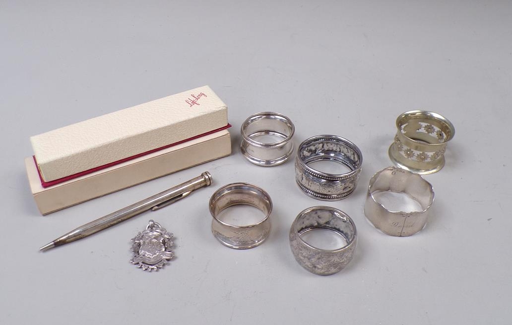SILVER NAPKIN RINGS, SILVER PENDANT, SILVER PROPELLING PENCIL - 3ozt