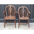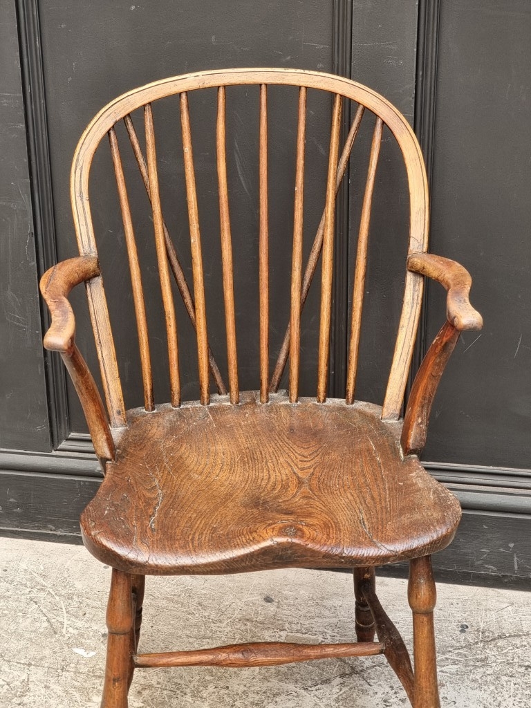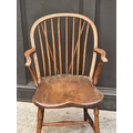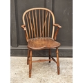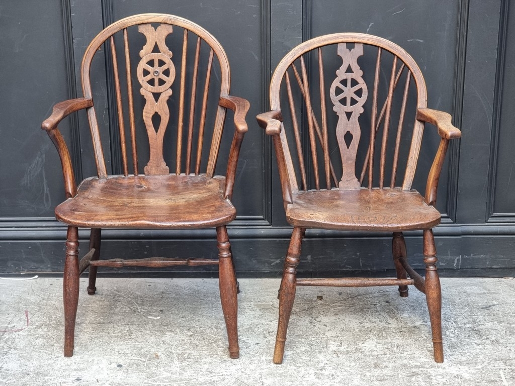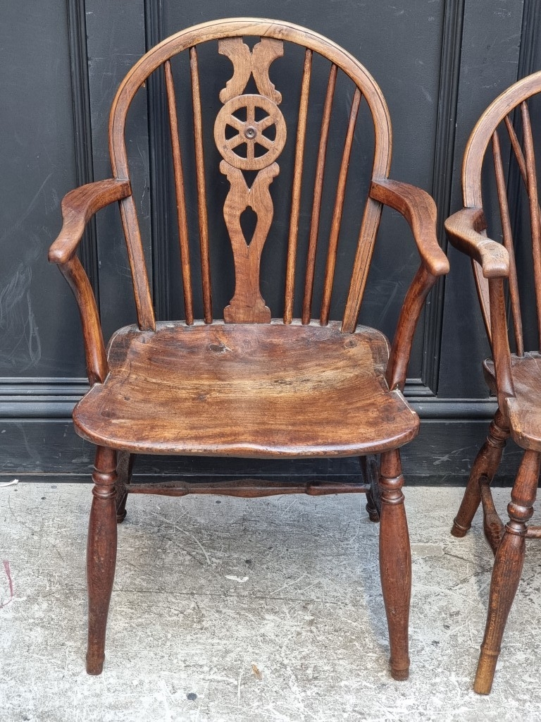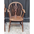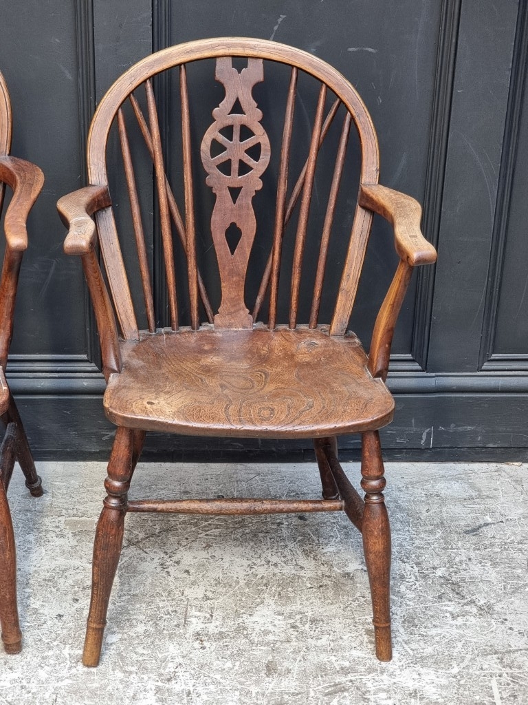 A 19th century ash, elm and beech stickback Windsor armchair; together with two similar wheelback examples, (one or both reduced in height). (3)