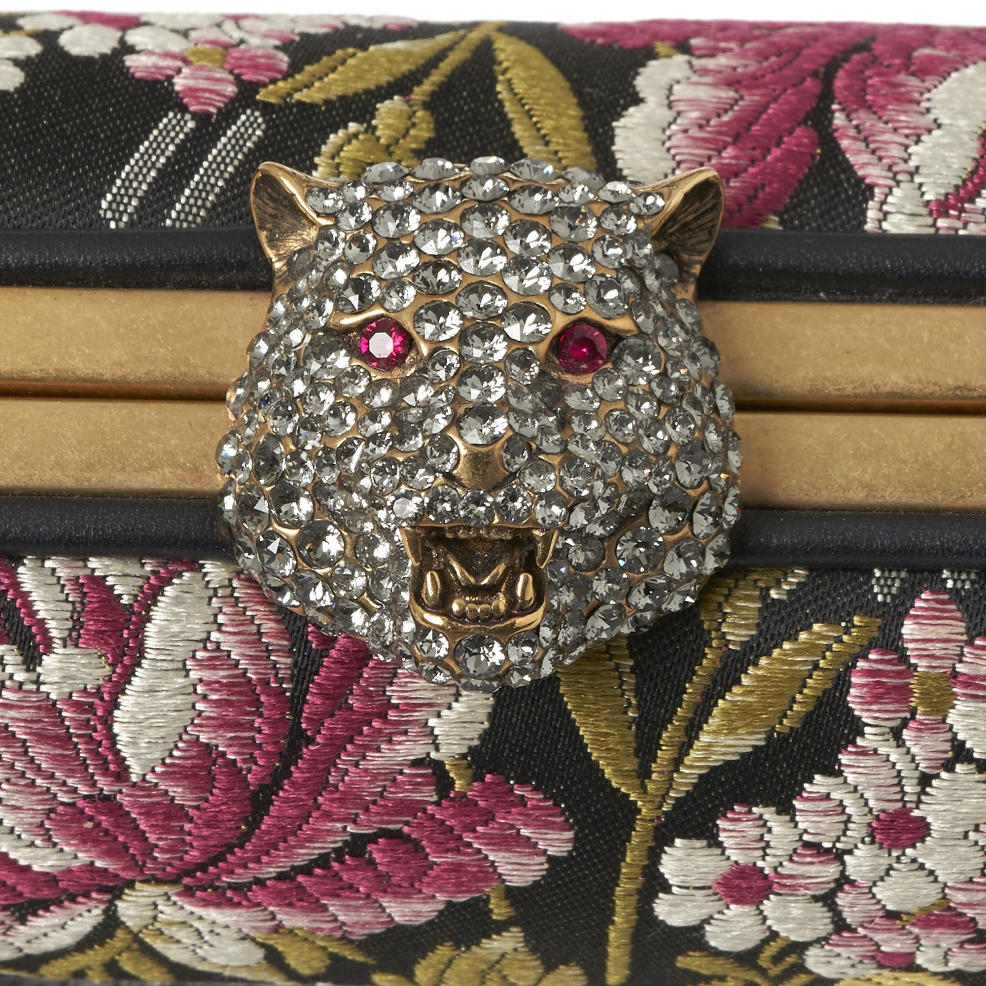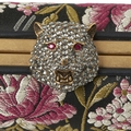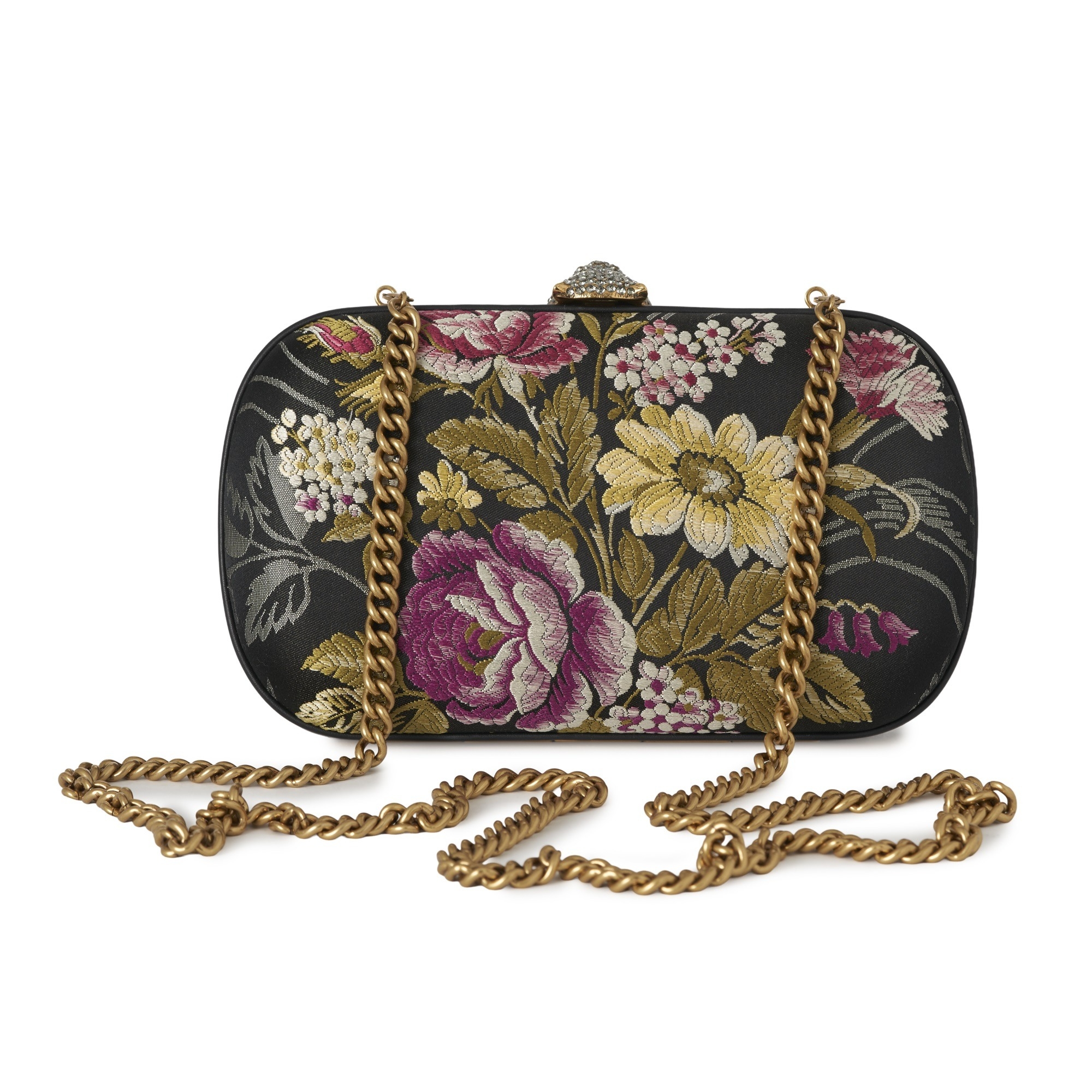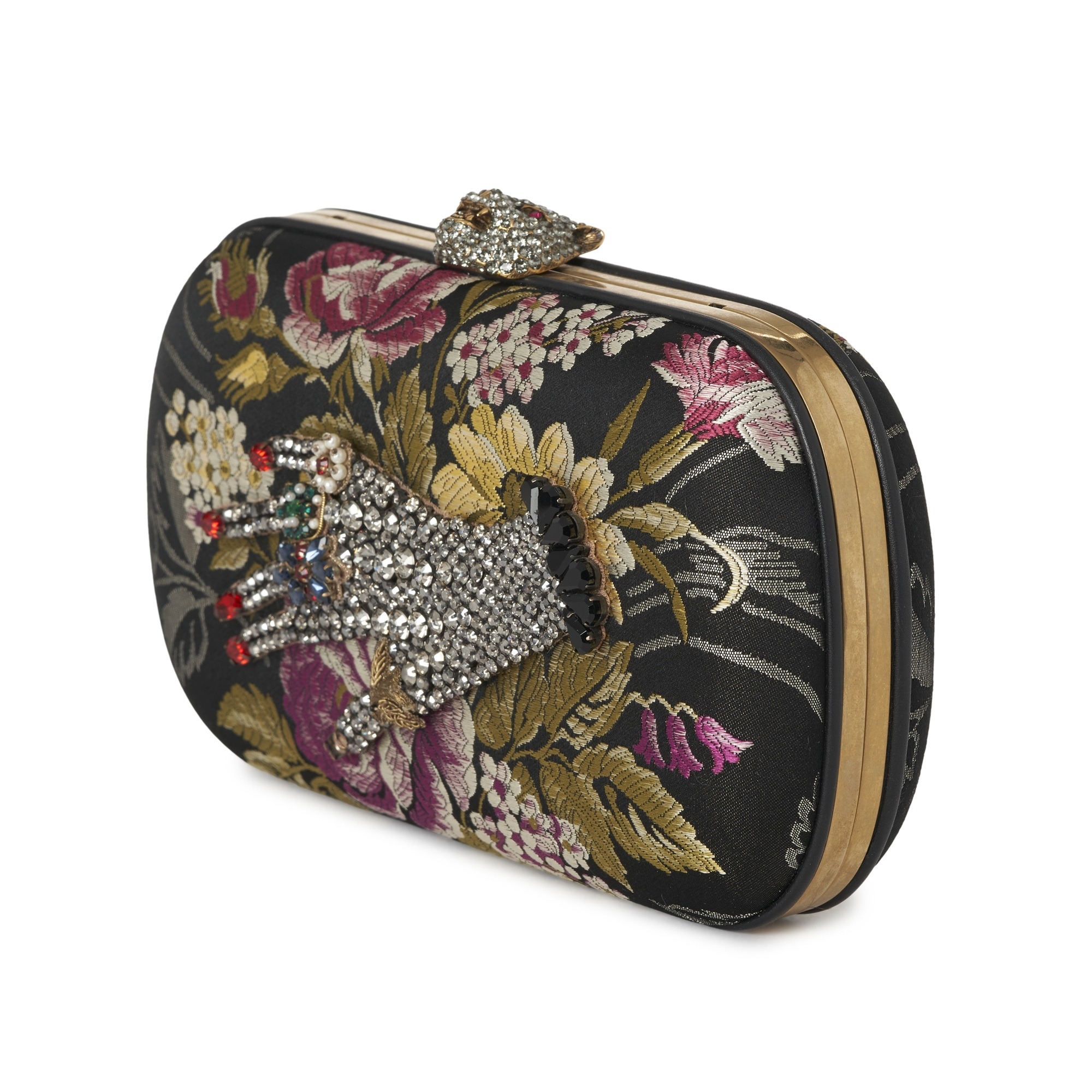 Gucci, an embellished Broadway box clutch bag, designed with a multicoloured floral brocade fabric exterior, featuring a crystal-embellished hand to the front, detachable chain-link crossbody strap, a crystal-encrusted feline clasp fastening, and a pink leather-lined interior, measuring 6 by 12 by 20cm