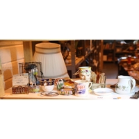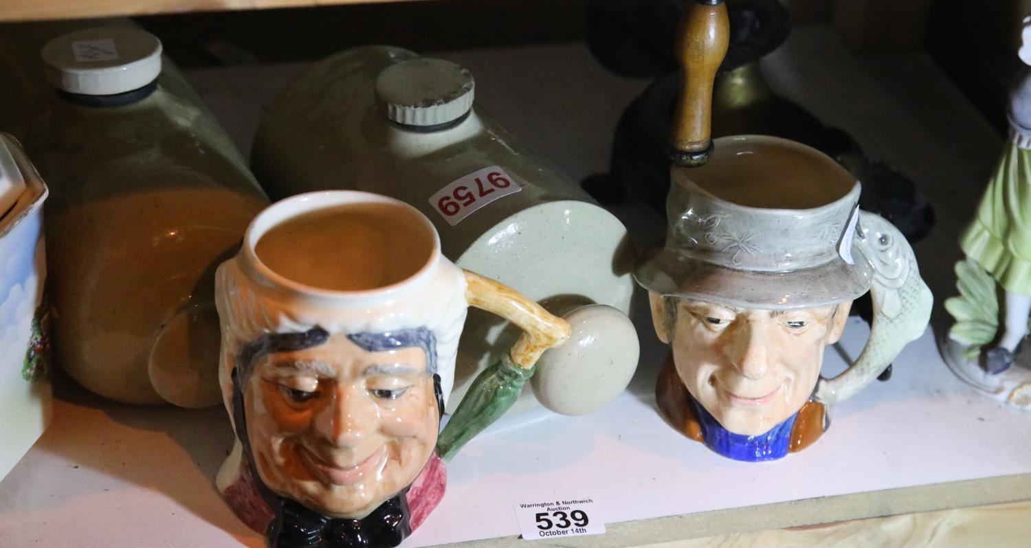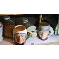 Box of mixed ceramics including Toby jugs, biscuit barrel and hot water bottles. Not available for in-house P&P.