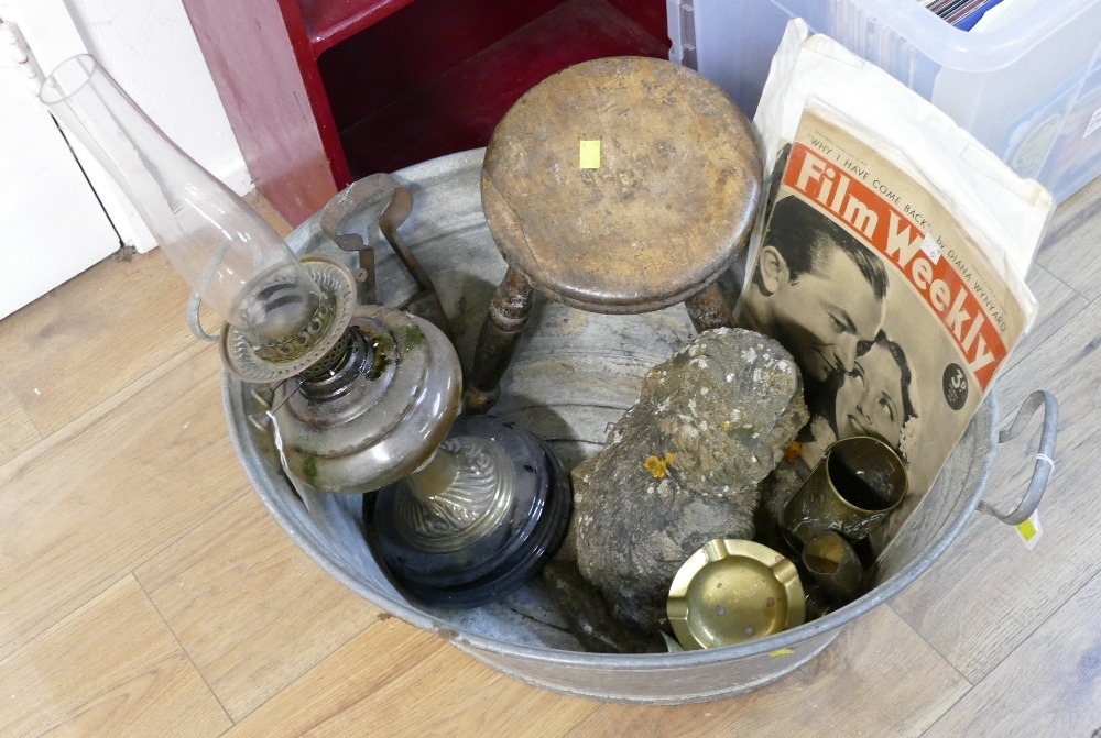 Vintage galvanised tin bath, stone cat garden ornament, oil lantern, wooden footstool, antique shears etc