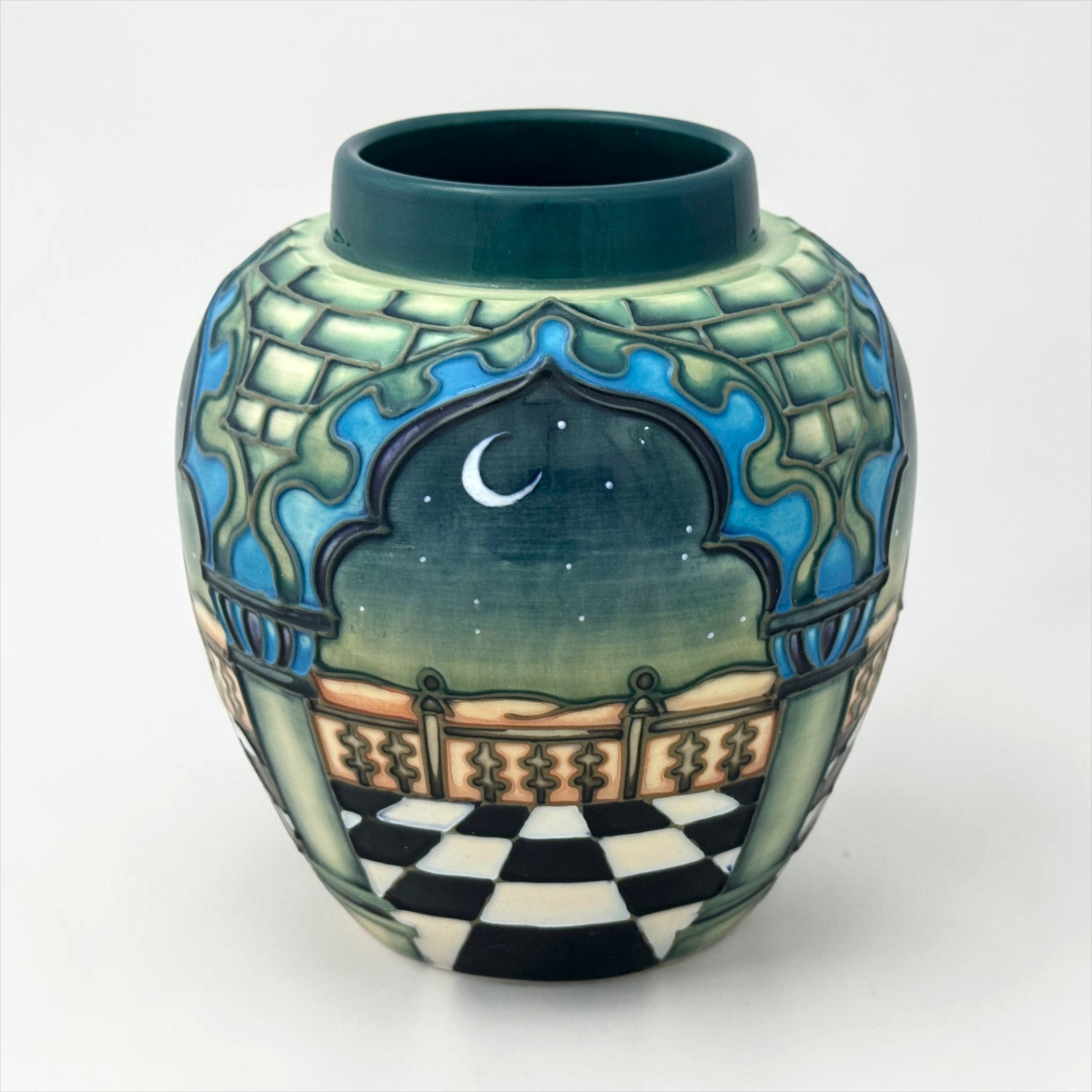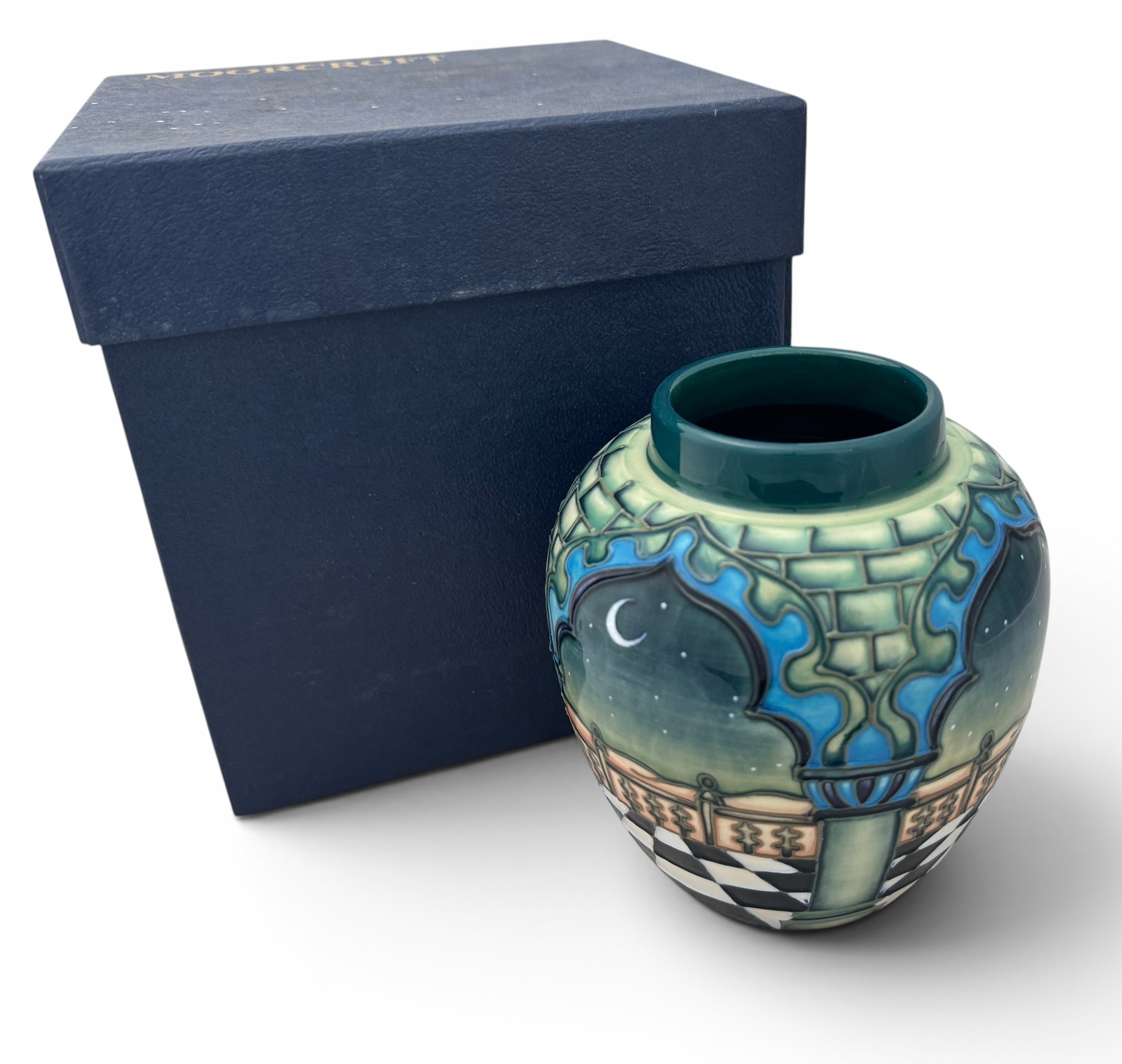 Moorcroft - Jumeriah ginger jar, designed by Beverley Wilkes and and dated 29.5.00. Decorated with an Arabian nightime desert sky view with stars and a crescent moon.