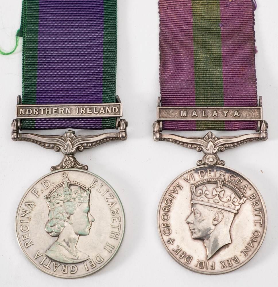A George VI General Service medal with Malaya clasp to 'T/14440446 Cpl. F E Gwynn RASC': and an Elizabeth II General Service Medal with Northern Ireland clasp to '24509821 Tpr C R Ward RTR' (3)