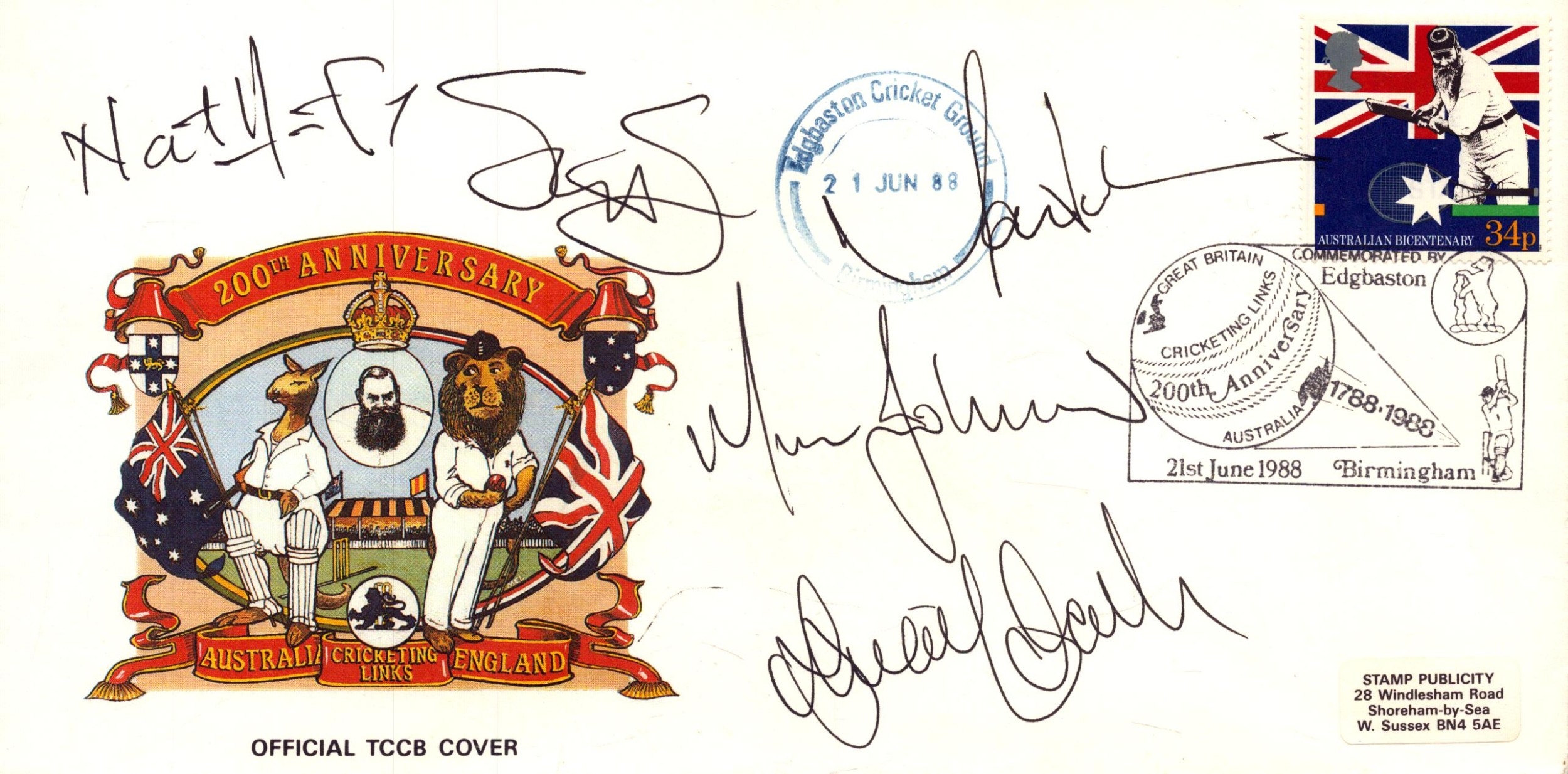Nathan Hauritz, Shane Watson, Marcus North and others signed 200th Anniversary Australia Cricketing Links England stamped June 1988 FDC.
