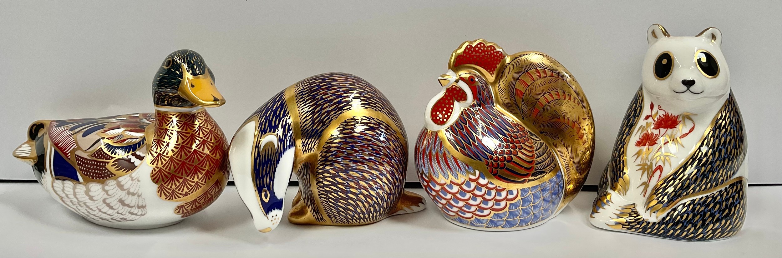 A Royal Crown Derby paperweight, Panda, silver stopper, 10.5cm; others, Badger, silver stopper, 8cm; Duck, silver stopper, 13cm long; Cockerel, silver stopper, 10cm high (4)