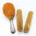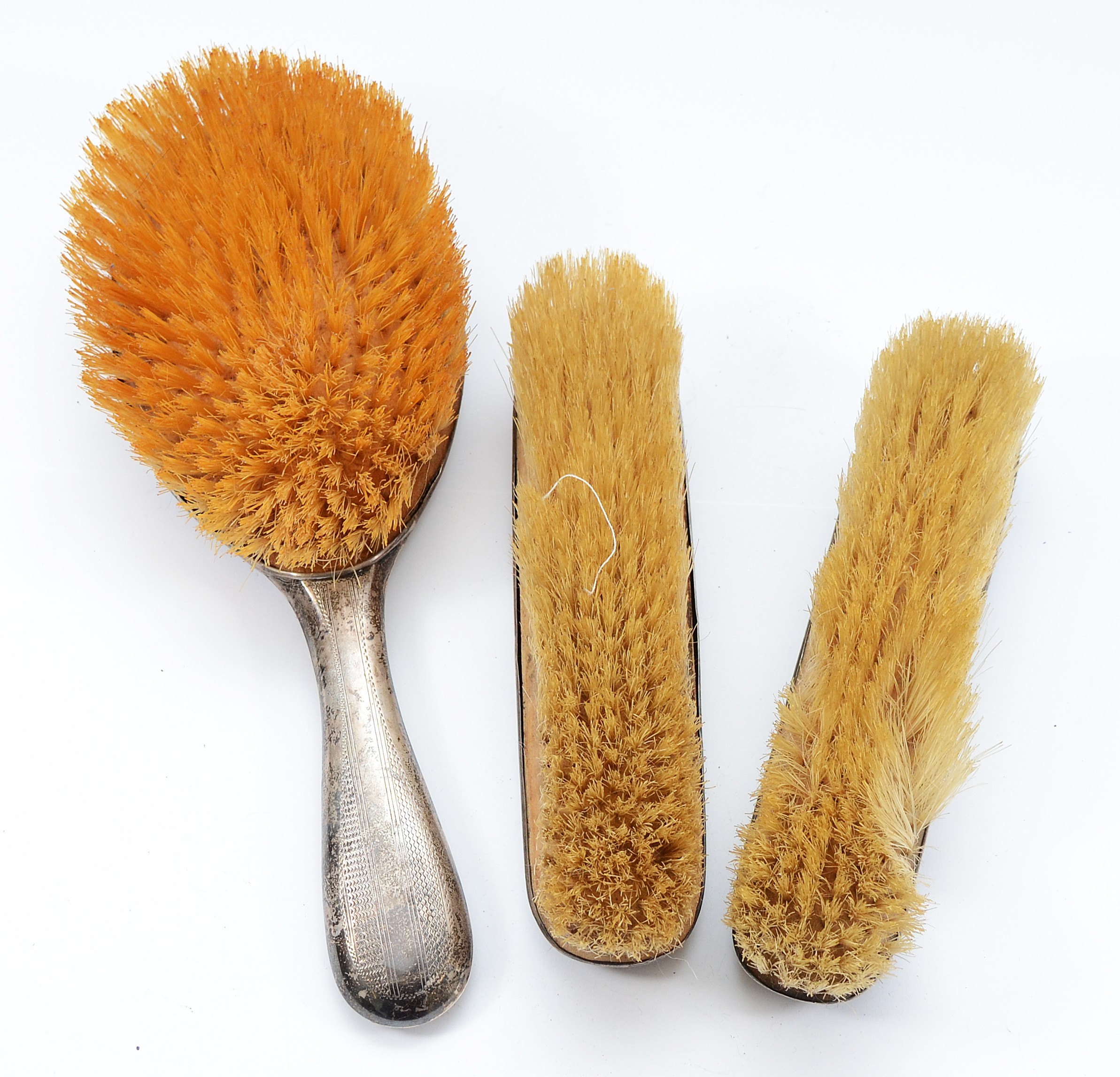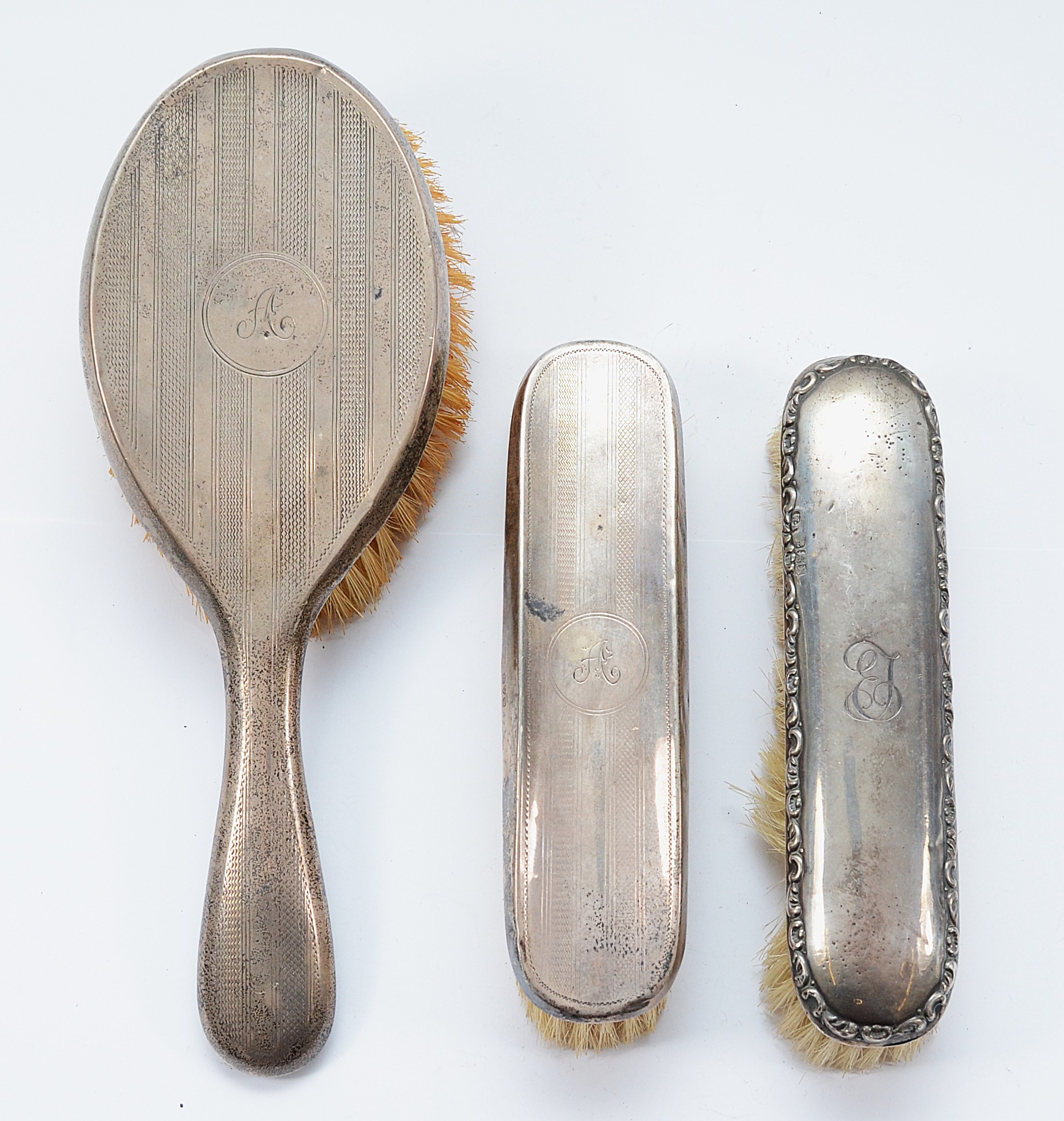 A silver dressing table hair brush, Chester 1919, with engraved 'A' to the back together with a matching silver clothes brush, Chester 1920, and another silver clothes brush, Birmingham 1916.