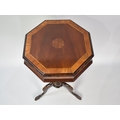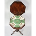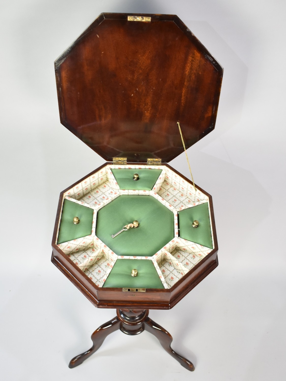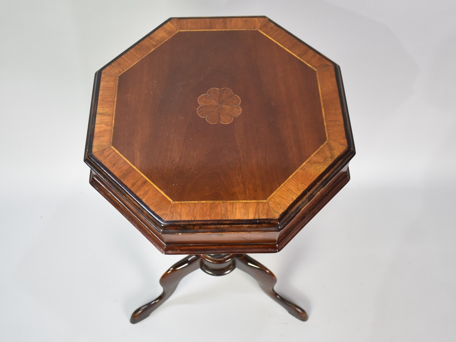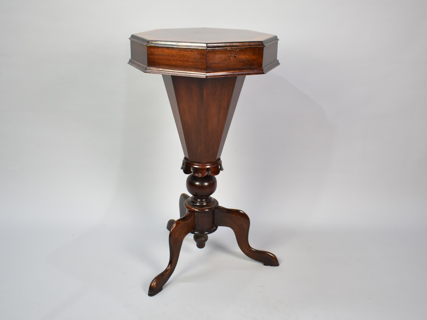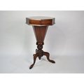 A Late Victorian Mahogany Ladies Octagonal Work Table of Trumpet Shape with Hinged Crossbanded and Inlaid Lid to Fitted Interior and Inner Wool Well, Tripod Support, 74cms High