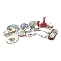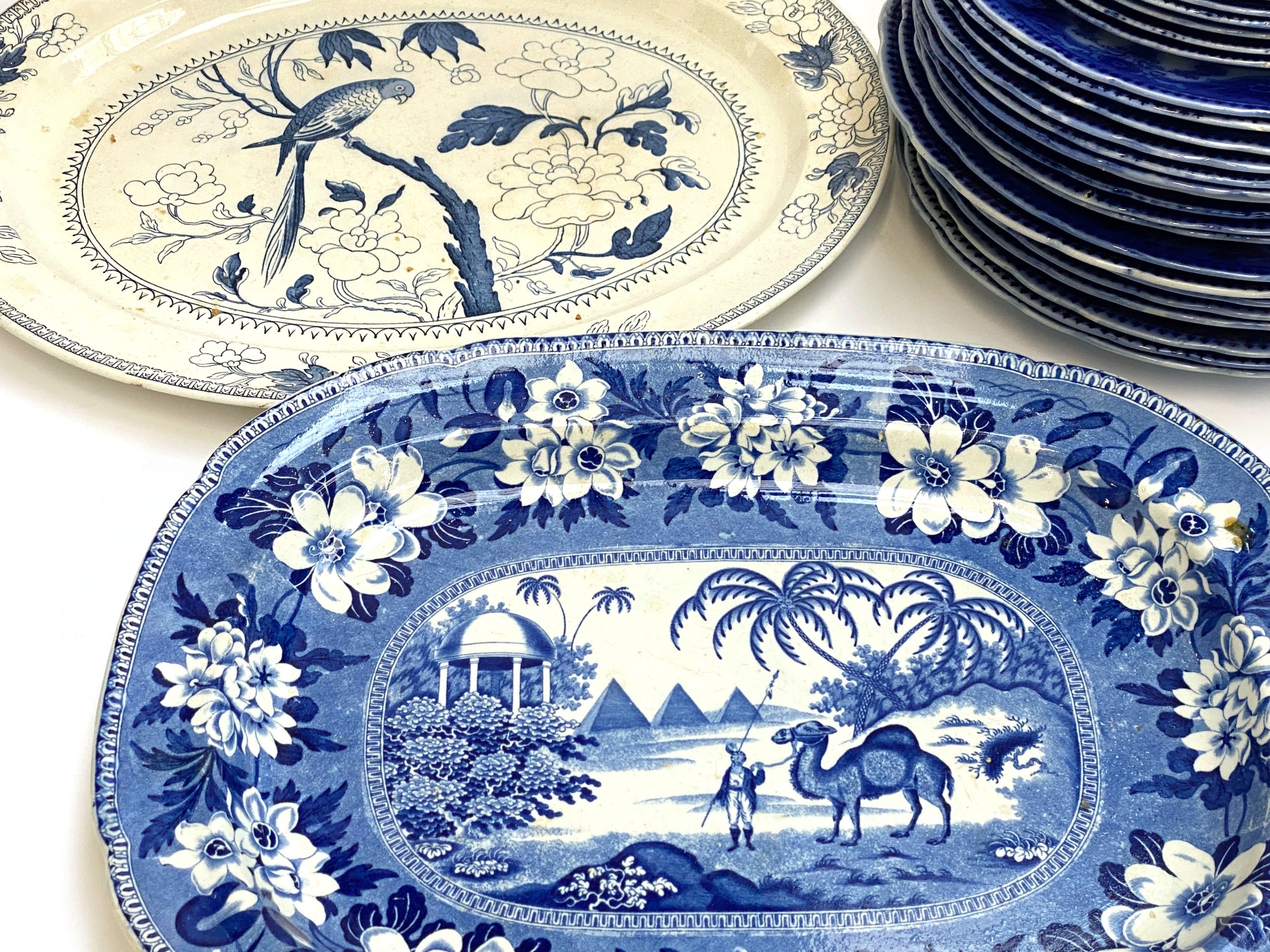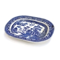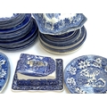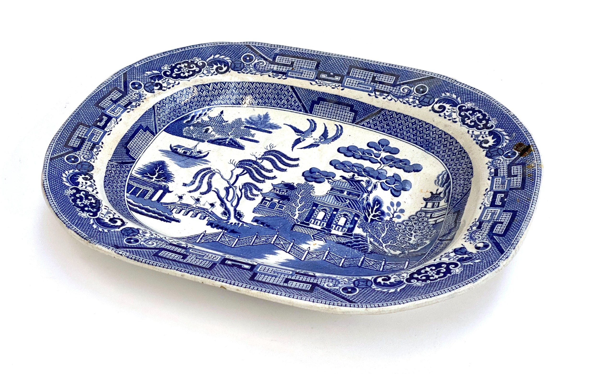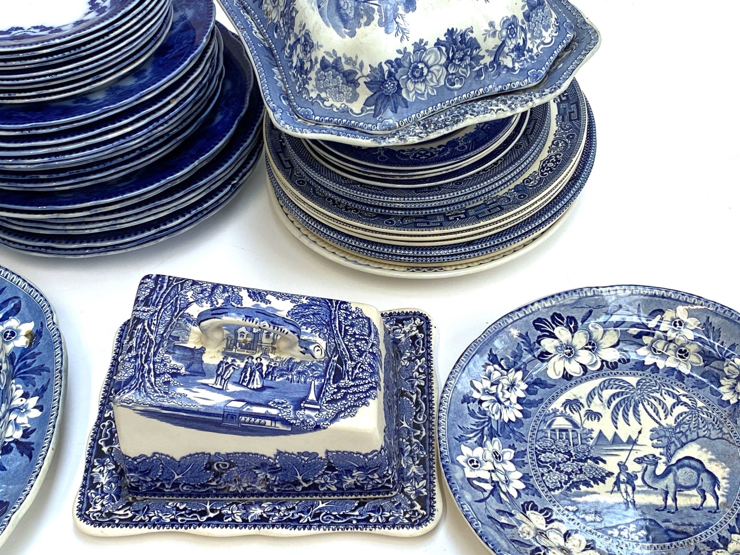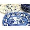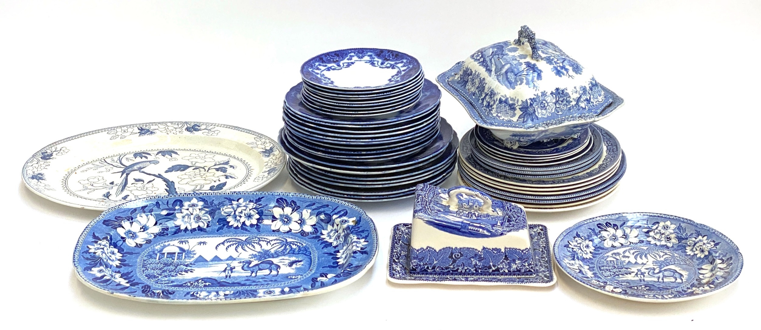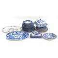 A quantity of blue and white ceramics to include Burslem, Wedgwood Willow pattern, Masons 'Vista' cheese cloche, etc, the largest meat plate 23cmW