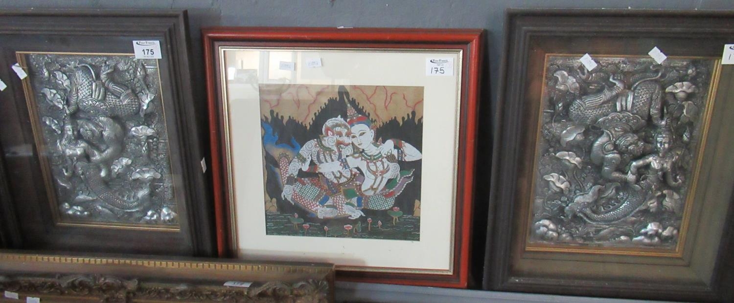 Two White Metal Thai repousse studies of Mermaids together with a print on fabric of a woman with immortal figure. (3)