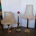 Three very tall brass toned table lamps including one Corinthian column example and two with cream linen shades.