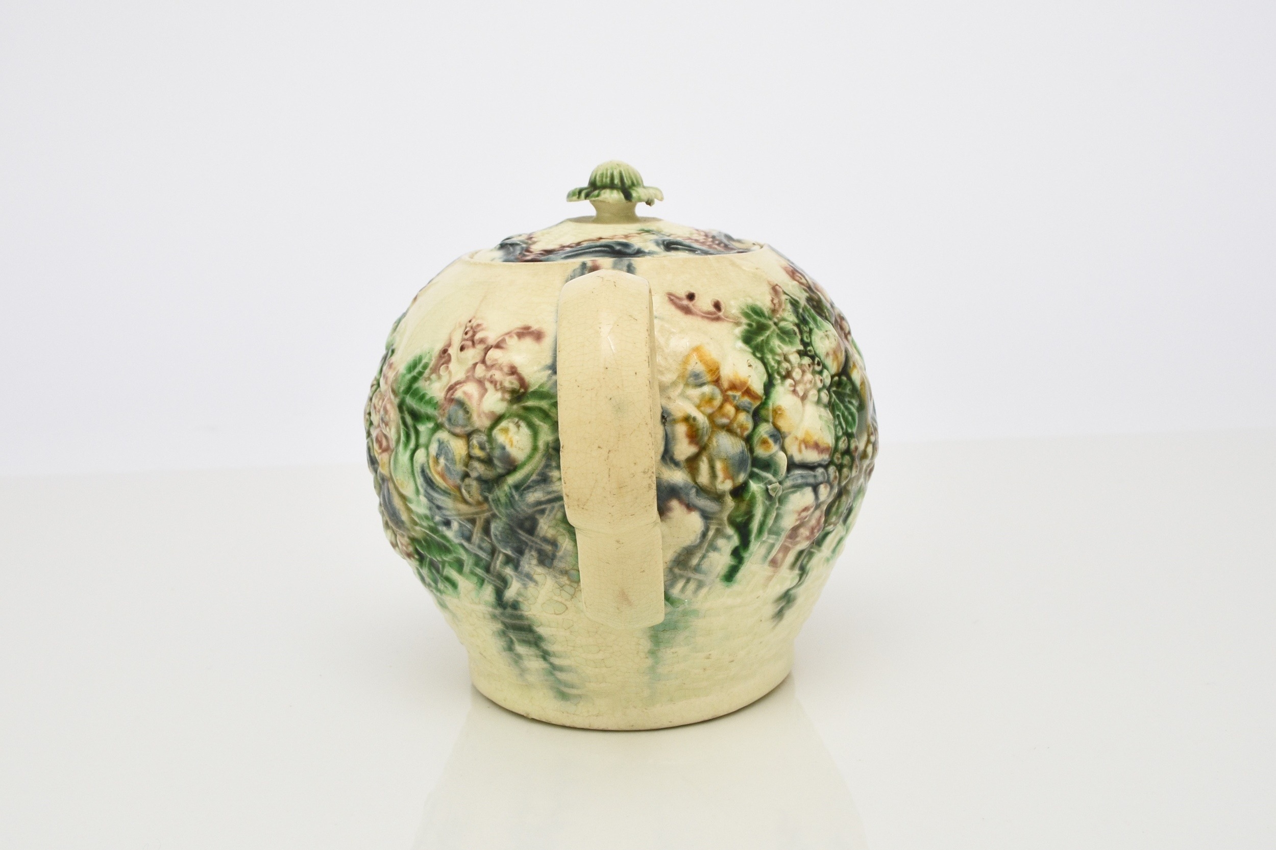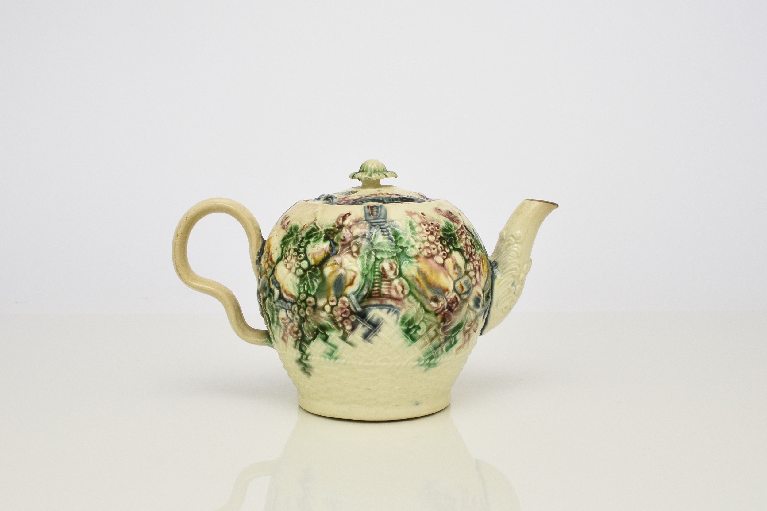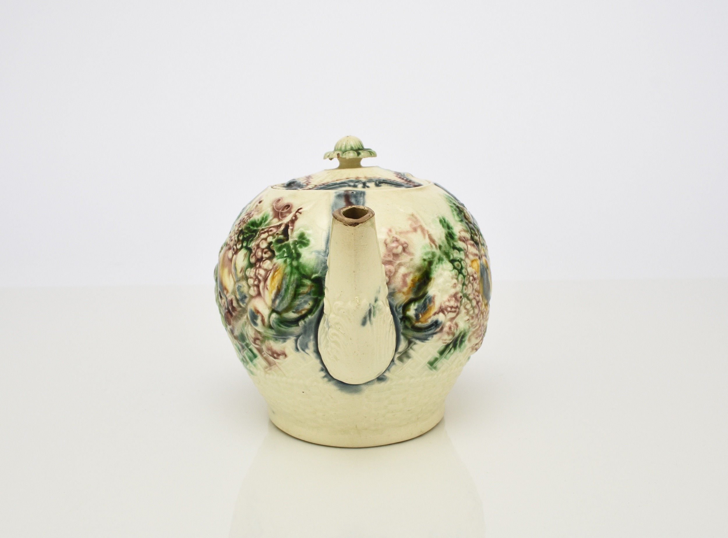A William Greatbatch creamware 'Fruit Basket' teapot and cover, circa 1770, of globular form, moulded in the relief with baskets of fruit and foliage above a basket-work band, the moulding picked out in ochre, green, purple and grey, impressed 'V' mark, 11.5cm high (spout reduced, chips to underside of cover)