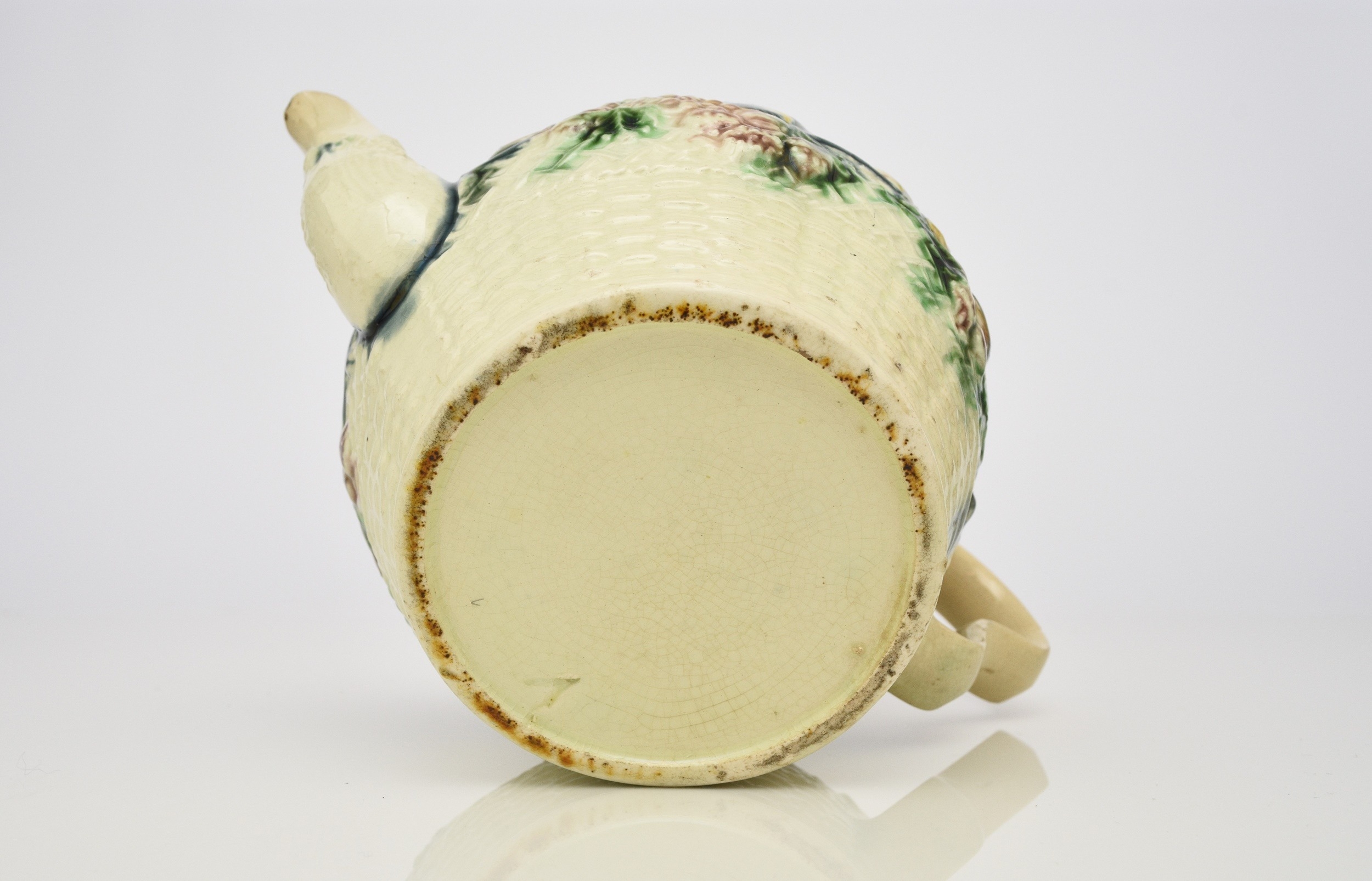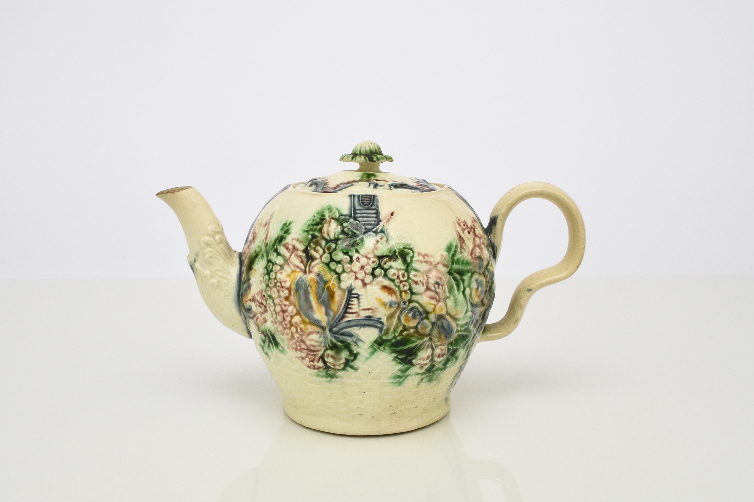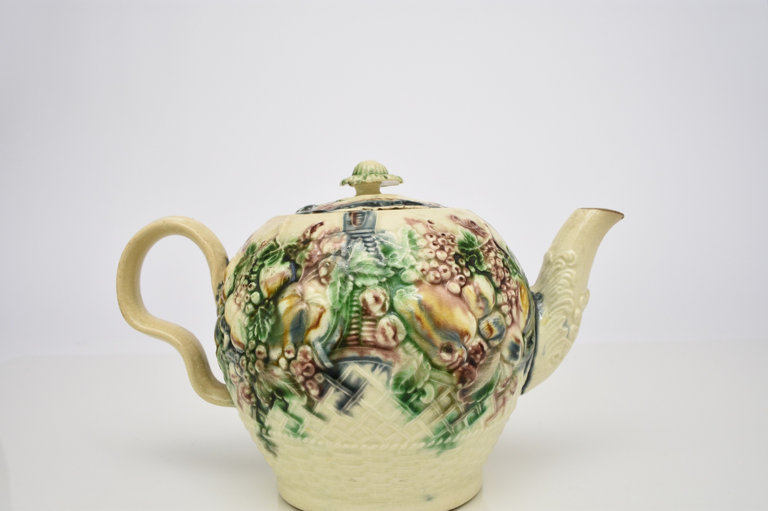 A William Greatbatch creamware 'Fruit Basket' teapot and cover, circa 1770, of globular form, moulded in the relief with baskets of fruit and foliage above a basket-work band, the moulding picked out in ochre, green, purple and grey, impressed 'V' mark, 11.5cm high (spout reduced, chips to underside of cover)