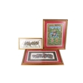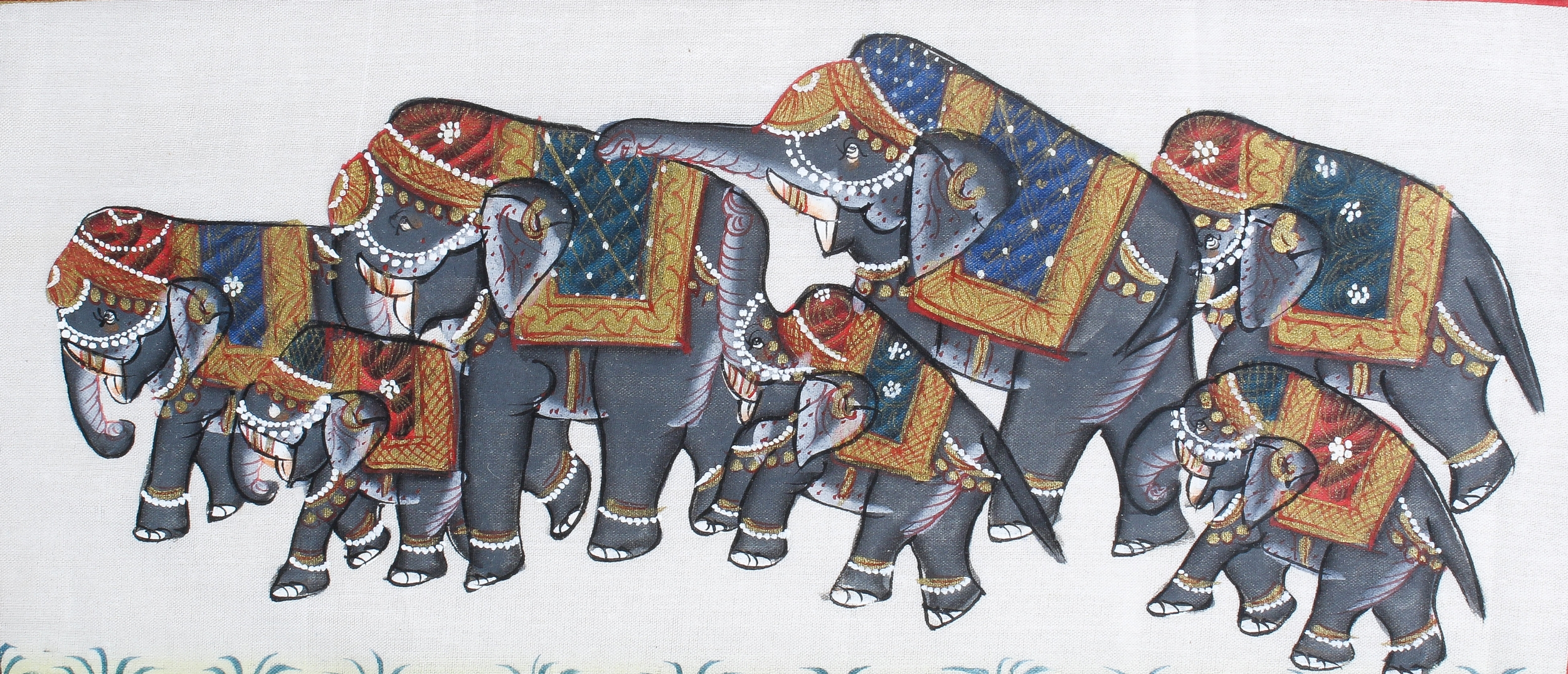 A group of three assorted Eastern gouache paintings. Two depicting elephants the other camels. Framed and glazed, Max. 47cm x 31cm.