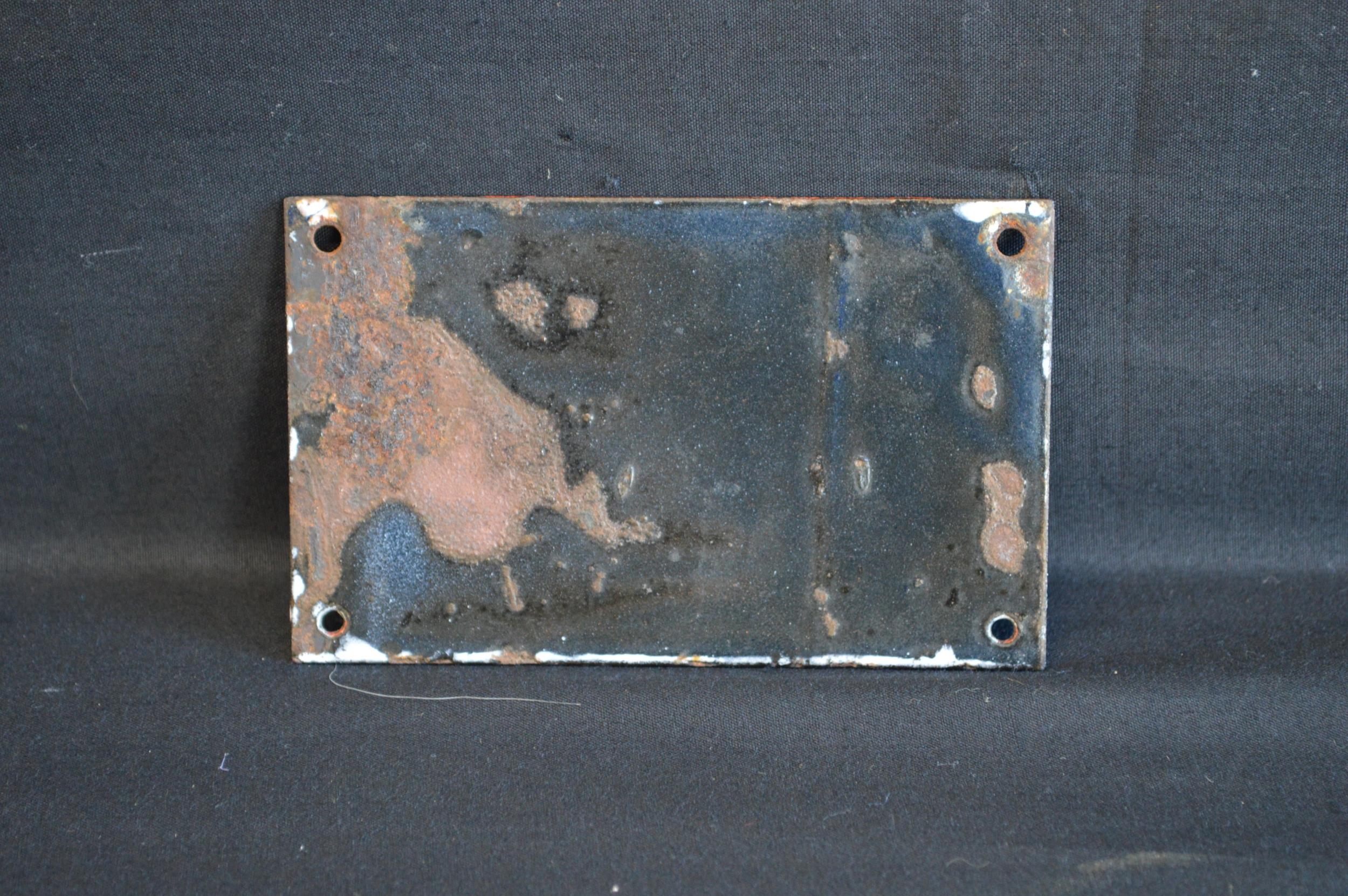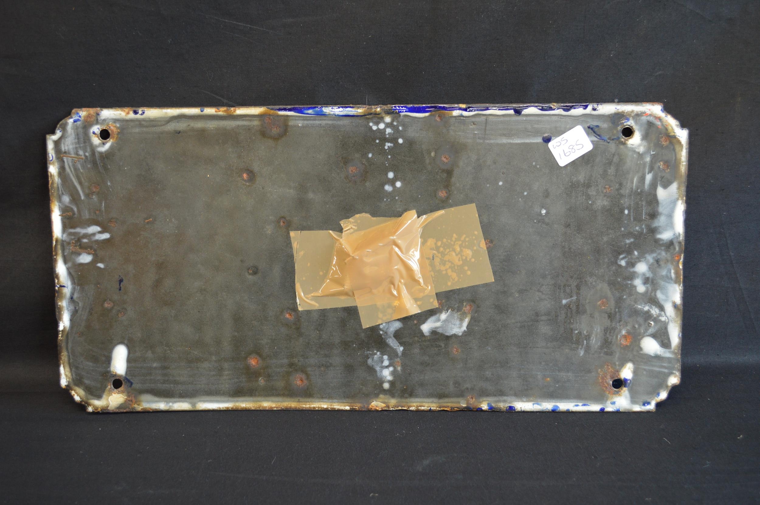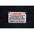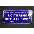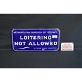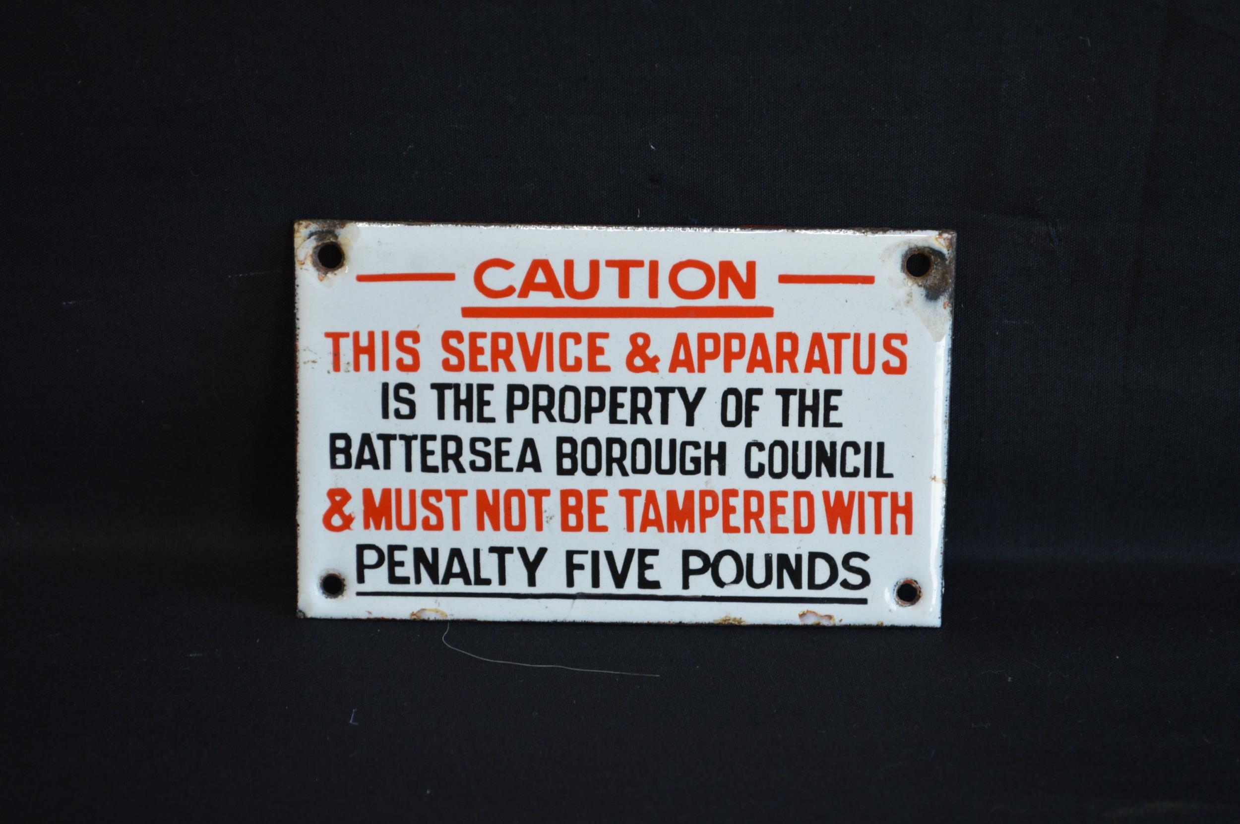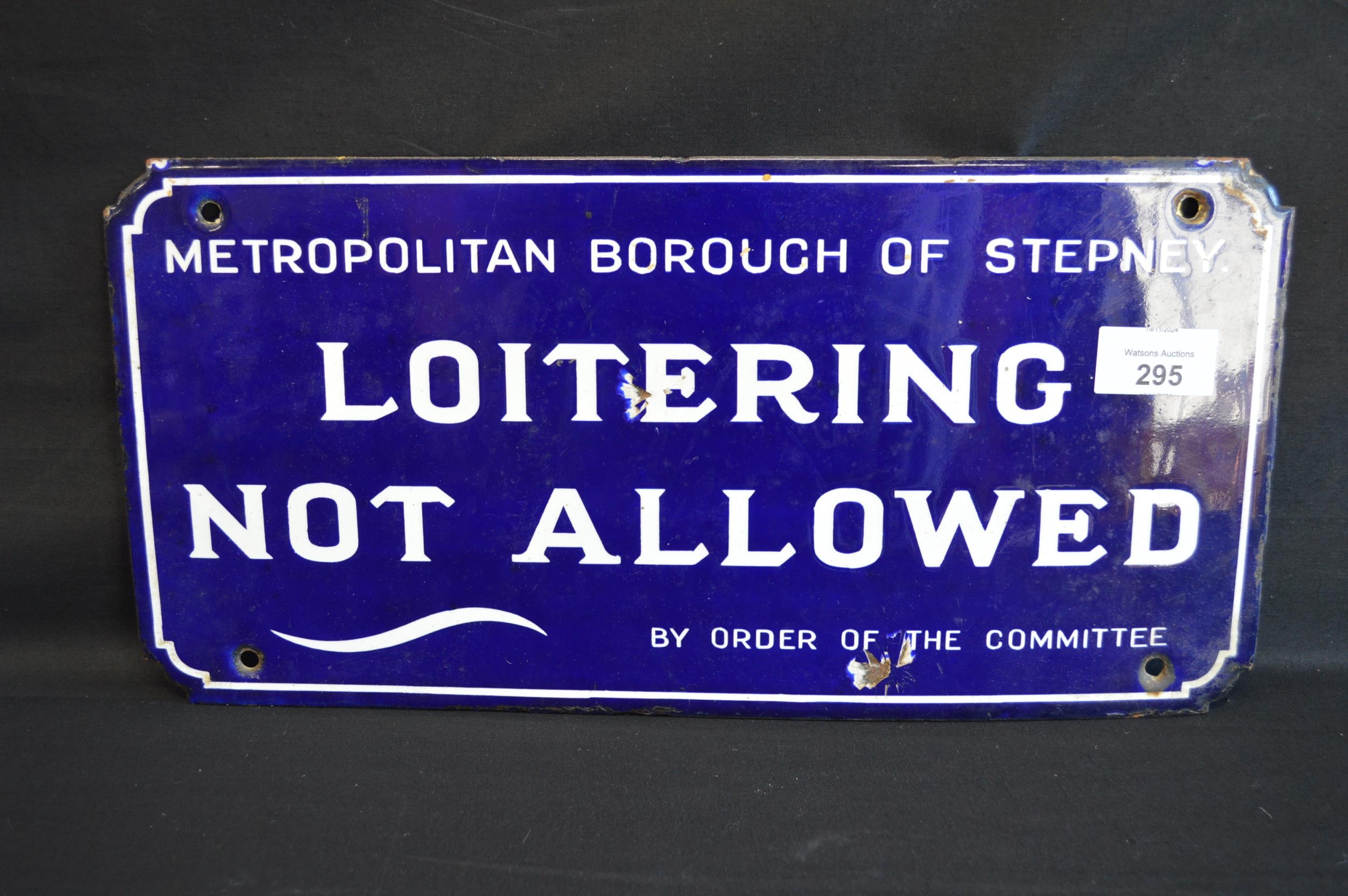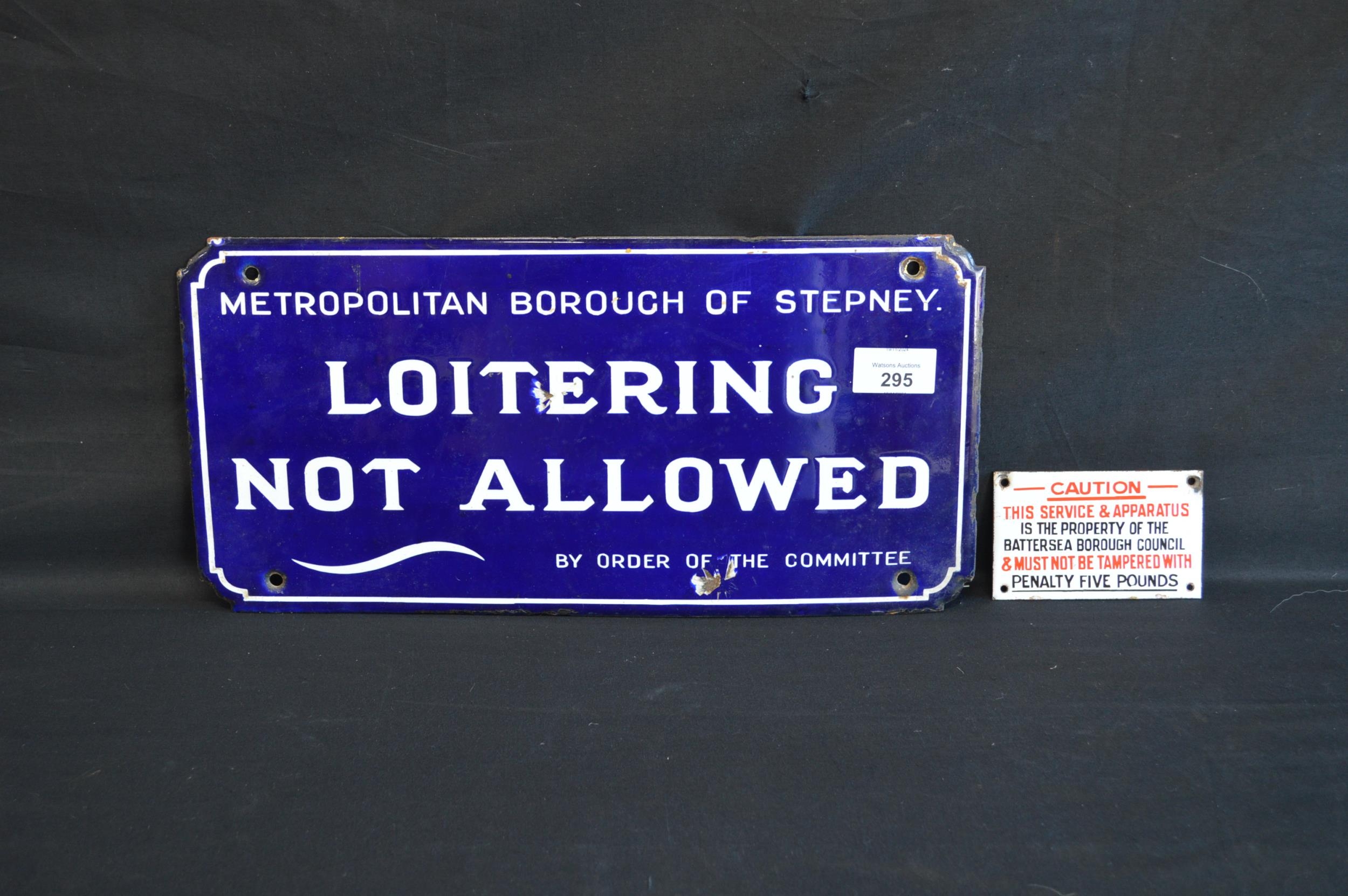 Enamel sign for Metropolitan Borough Of Stepney, Loitering Not Allowed By Order Of The Committee having white lettering on a blue ground - 37.5cm x 18.5cm together with a small enamel Caution This Service & Apparatus Is The Property Of Battersea Borough Council And Must Not Be Tampered With, Penalty Five Pounds sign having red and black lettering on a white ground - 10cm x 6.5cm