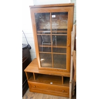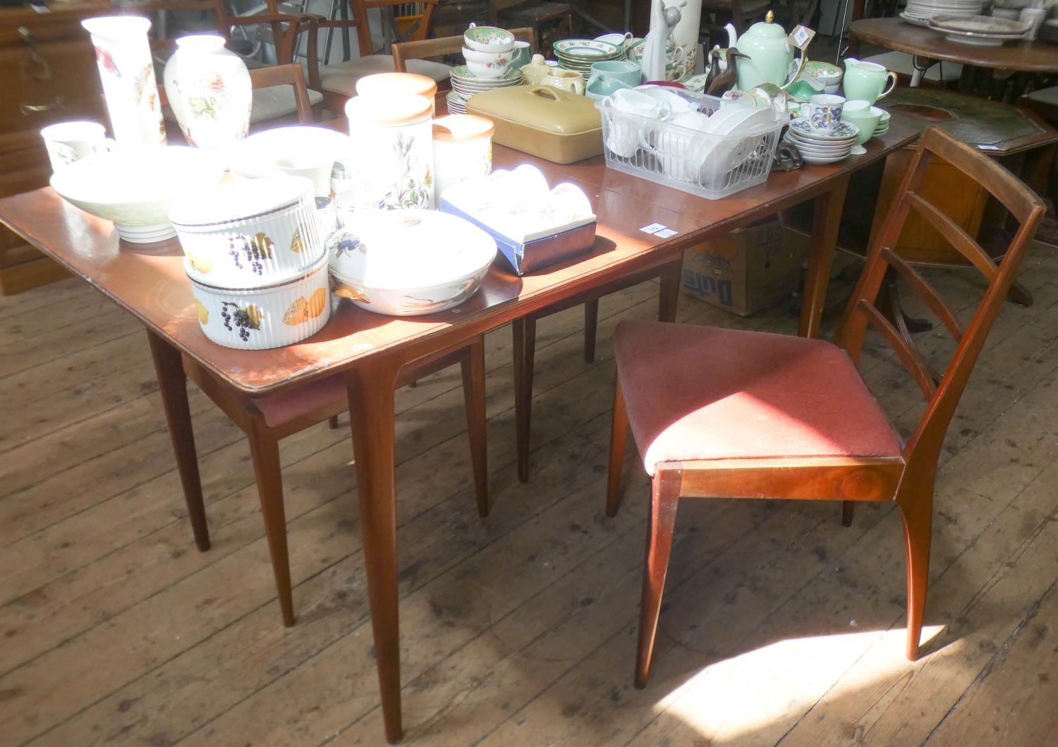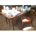 A Macintosh teak extending dining table with centre leaf and three similar ladder back style dining chairs with upholstered seats