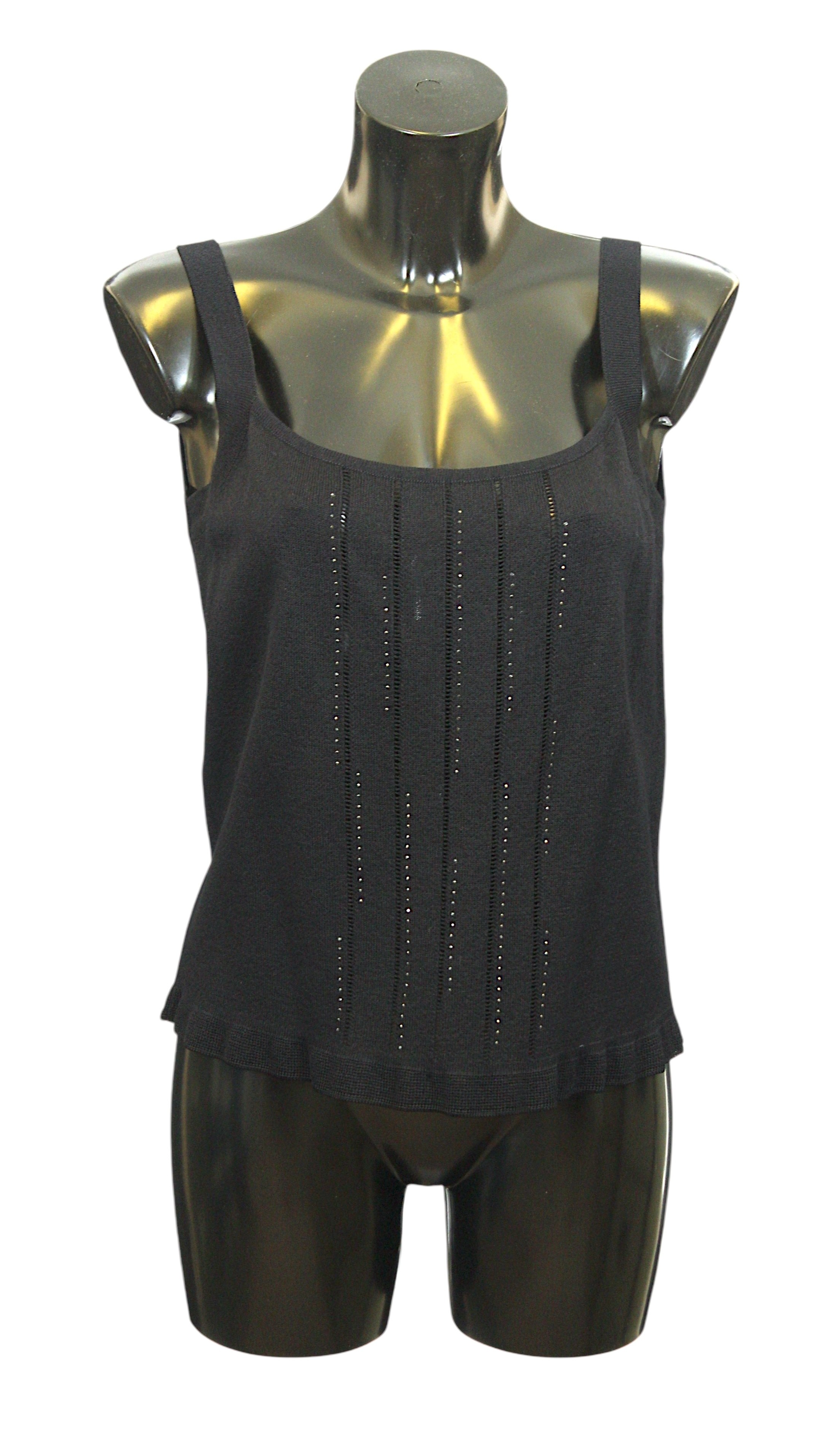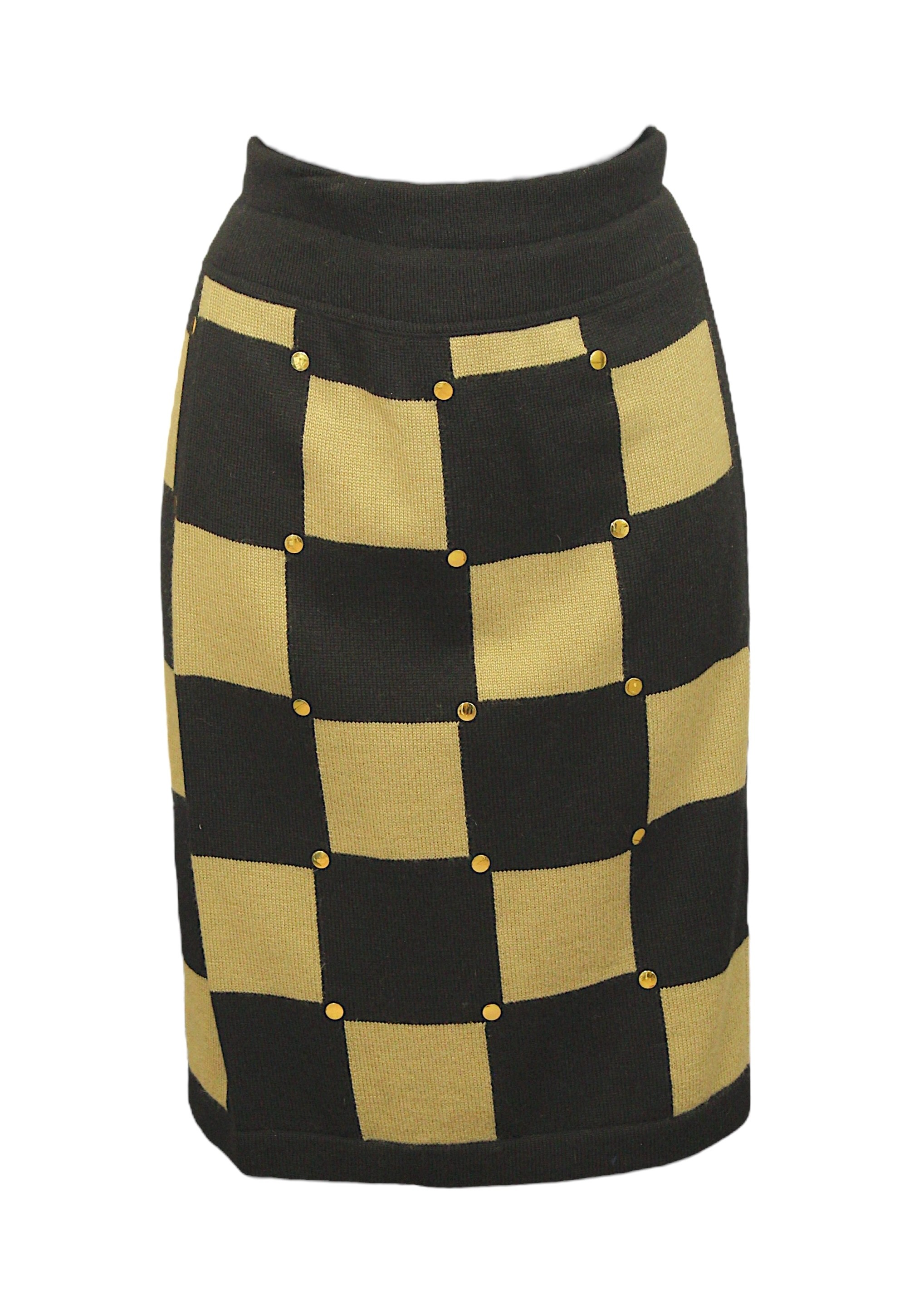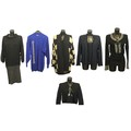 including: a Jones New York Dress black knitted cardigan, mohair synthetic mix, size M; a DKNY black dress, with grey lower skirt, polo neck, size M; an Escada matching black cardigan and vest set, with silver thread, both size 40; an Anne Fontaine Paris black cardigan with tweed trimmed collar, size 3; an Escada by Margaretha Levy matching longline cardigan and skirt set, in black and camel checkerboard pattern, with gold sequin detail, cardigan size 40; and a Gianni Versace electric blue jumper dress, with metallic thread, rhinestone and silver bead appliqué top front (8)