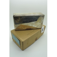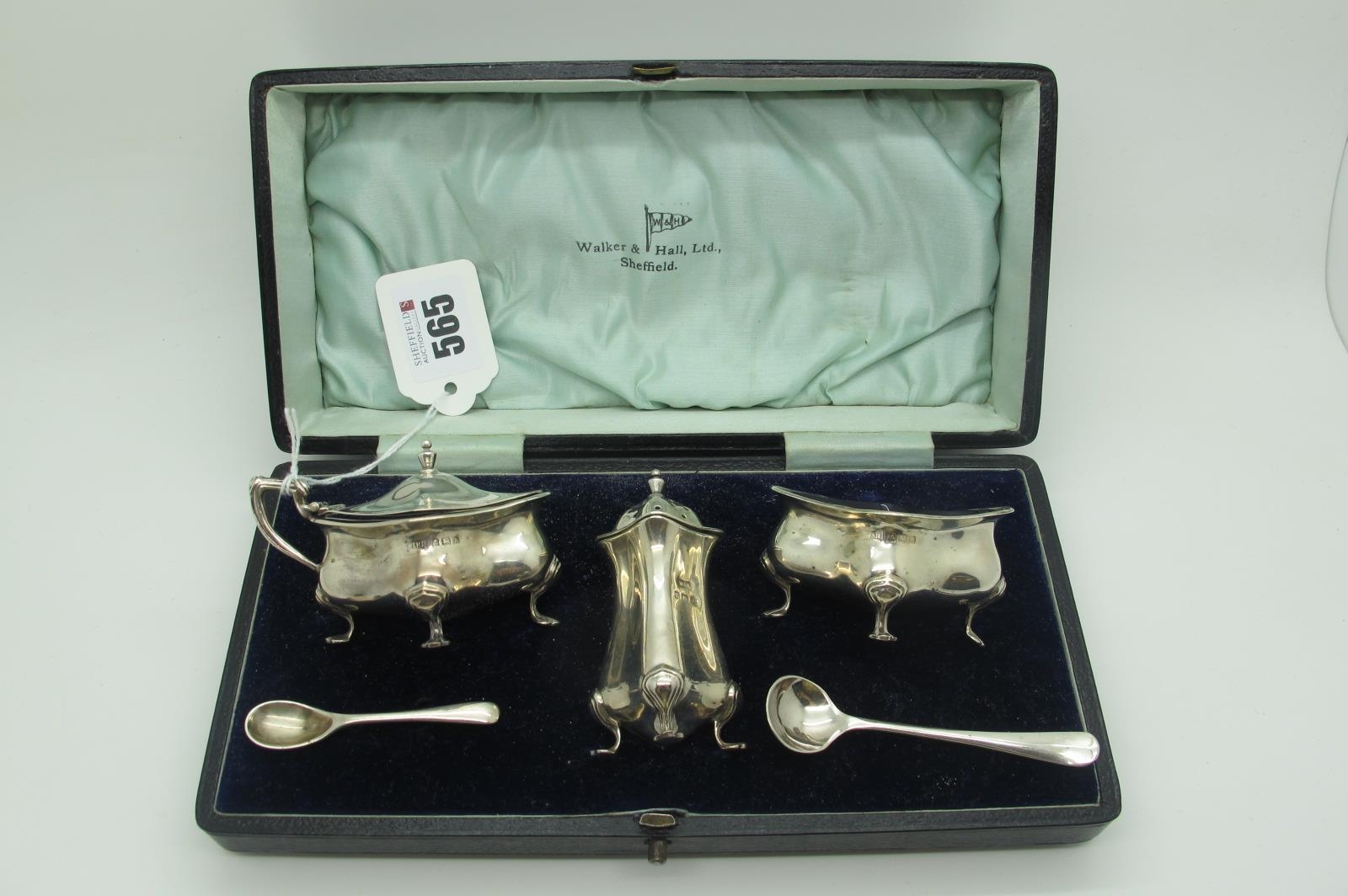 A Hallmarked Silver Three Piece Cruet Set, in original Walker & Hall fitted case, with two associated spoons.
