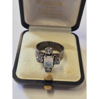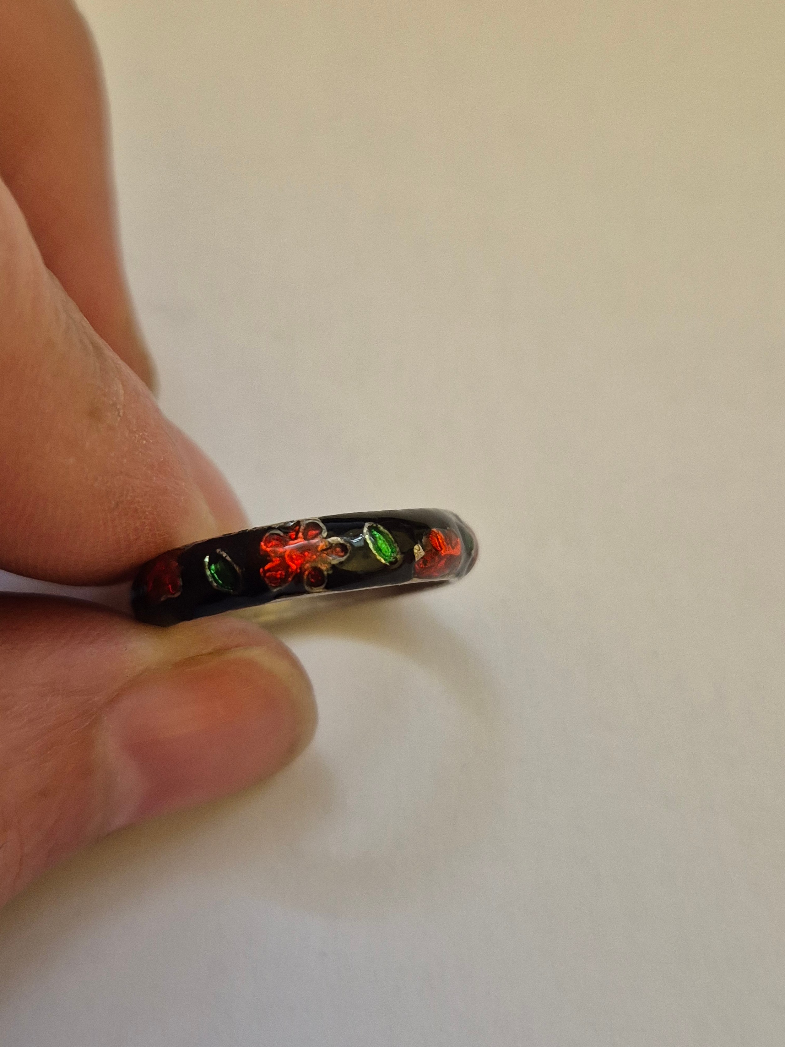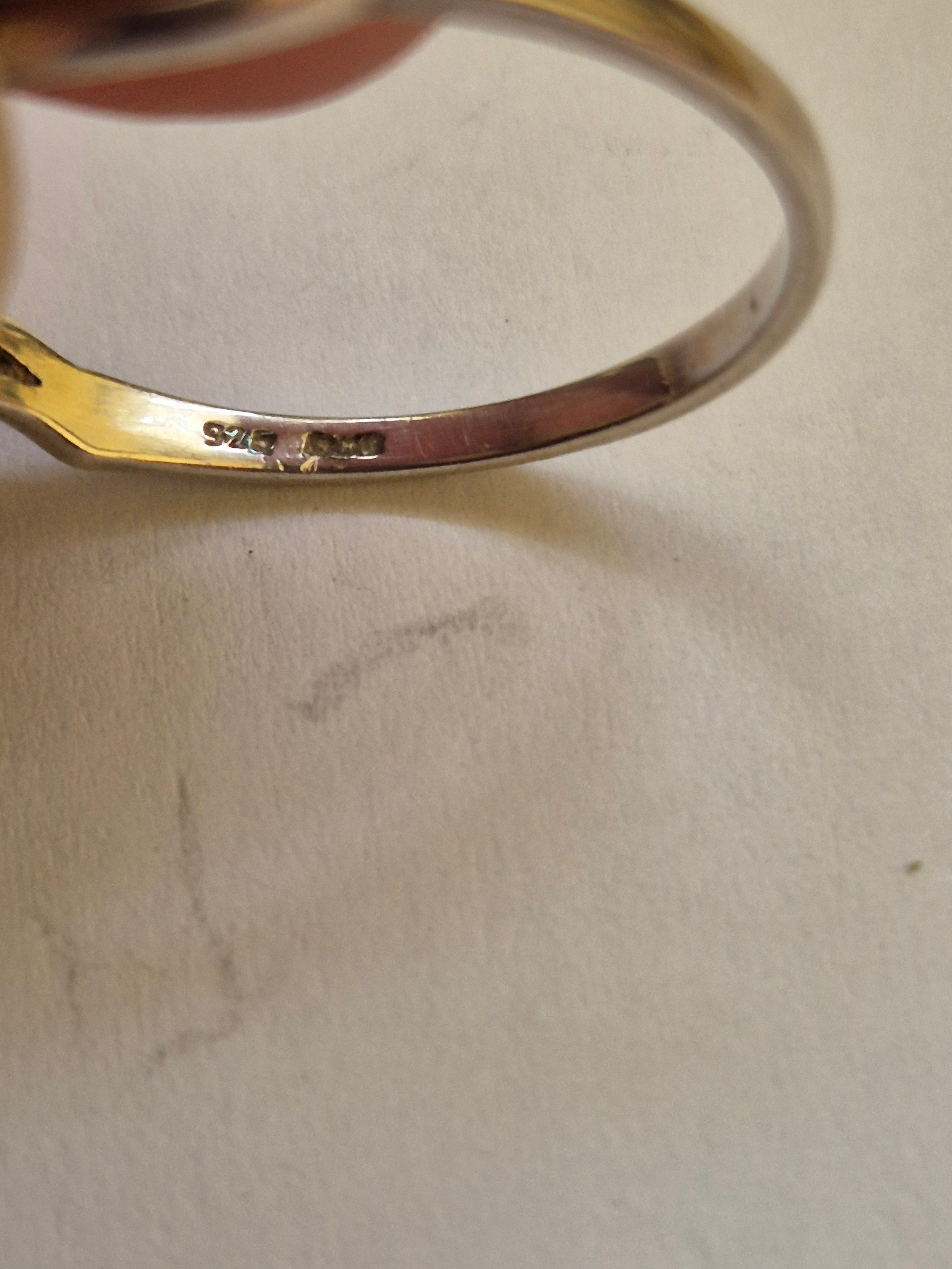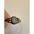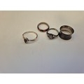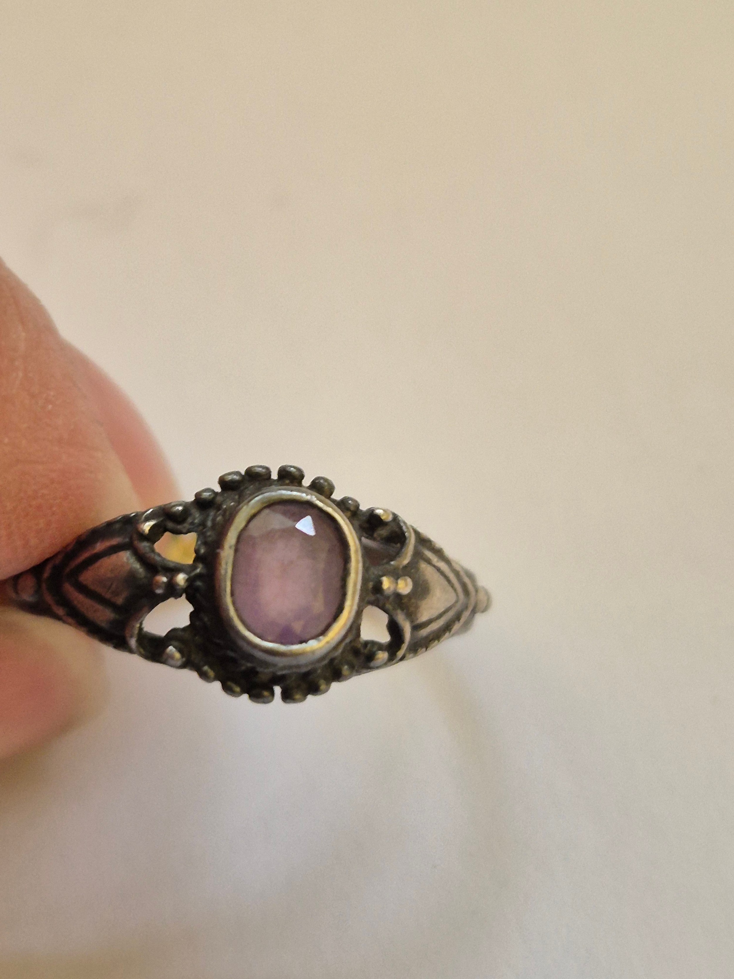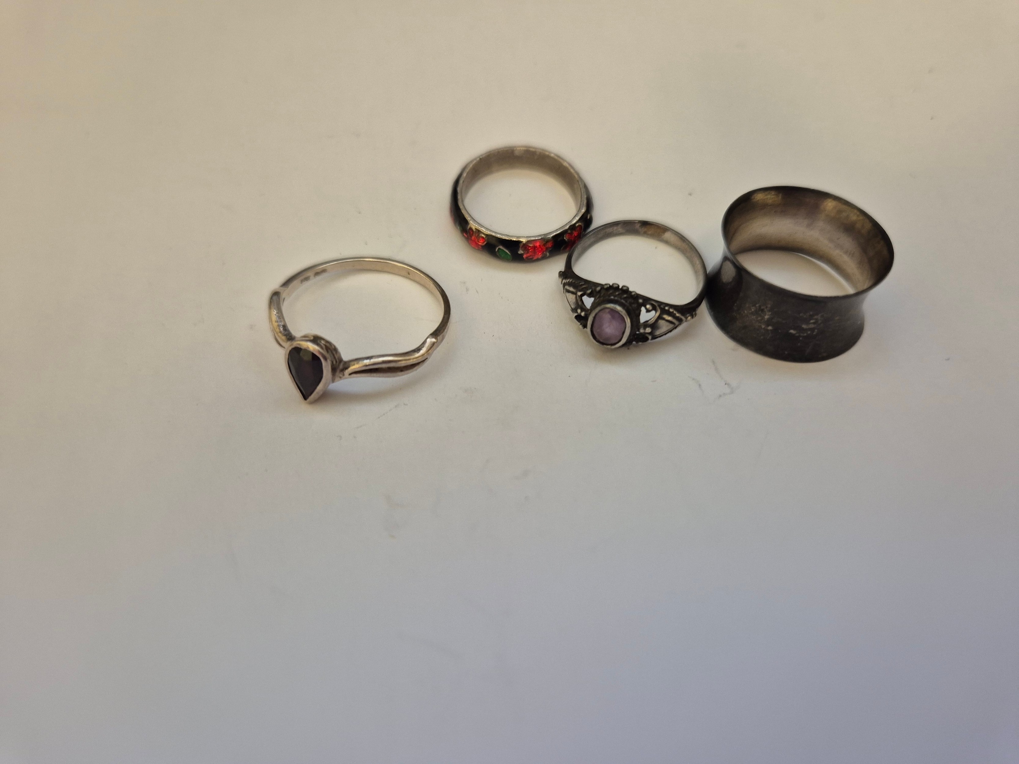 3 vintage silver rings with 925 marks, one with lilac coloured stone and a fourth ring in white metal with red, green & black enamelling but unmarked