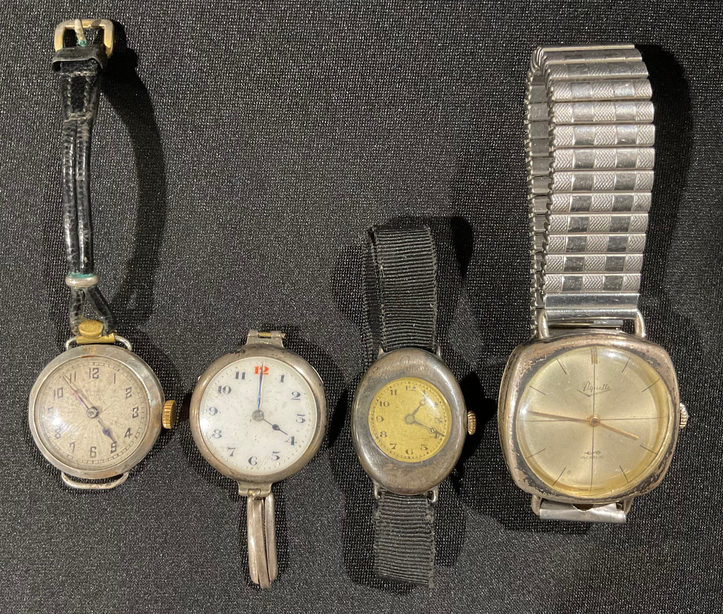 A Piquette Sterling silver gentlemen’s wristwatch, silvered dial, thin baton markers, 31mm tv style case, fixo-flex strap; others, three ladies silver wristwatches (4)
