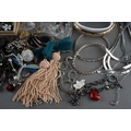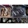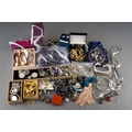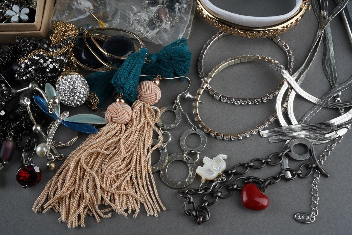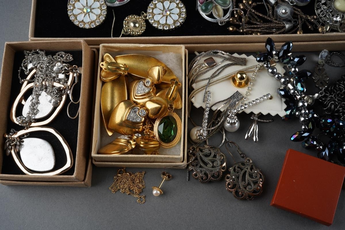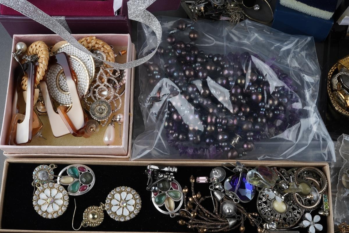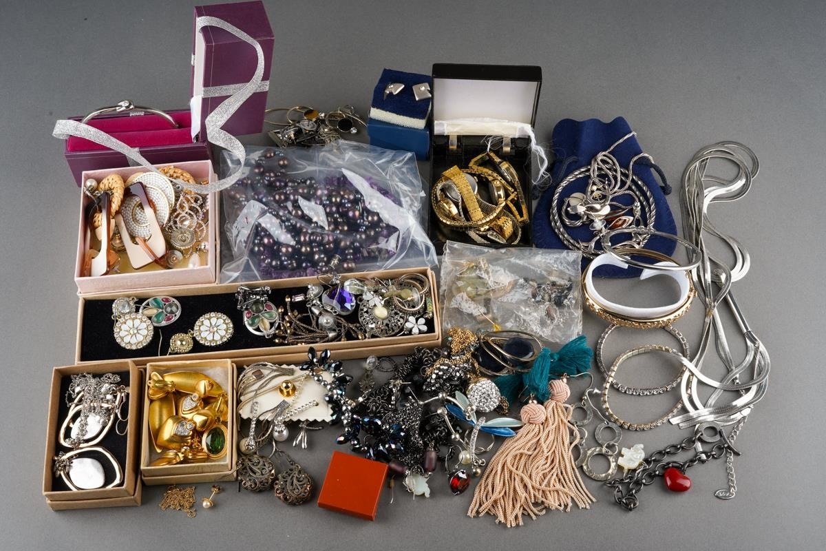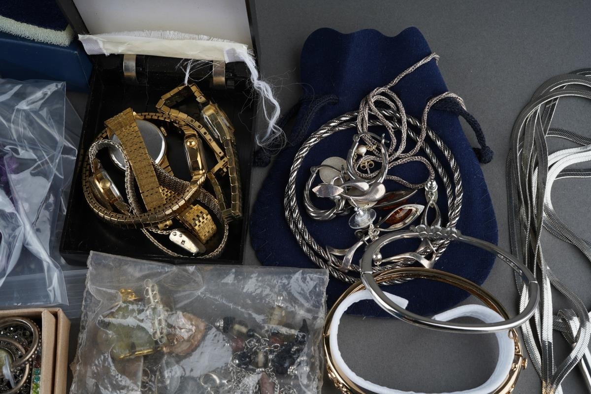 Collection of silver earrings, white metal bangle, long honora pearl necklace, costume jewellery, watches plus 15ct gold (marked 585) necklace, gross weight approx. 1.4g,