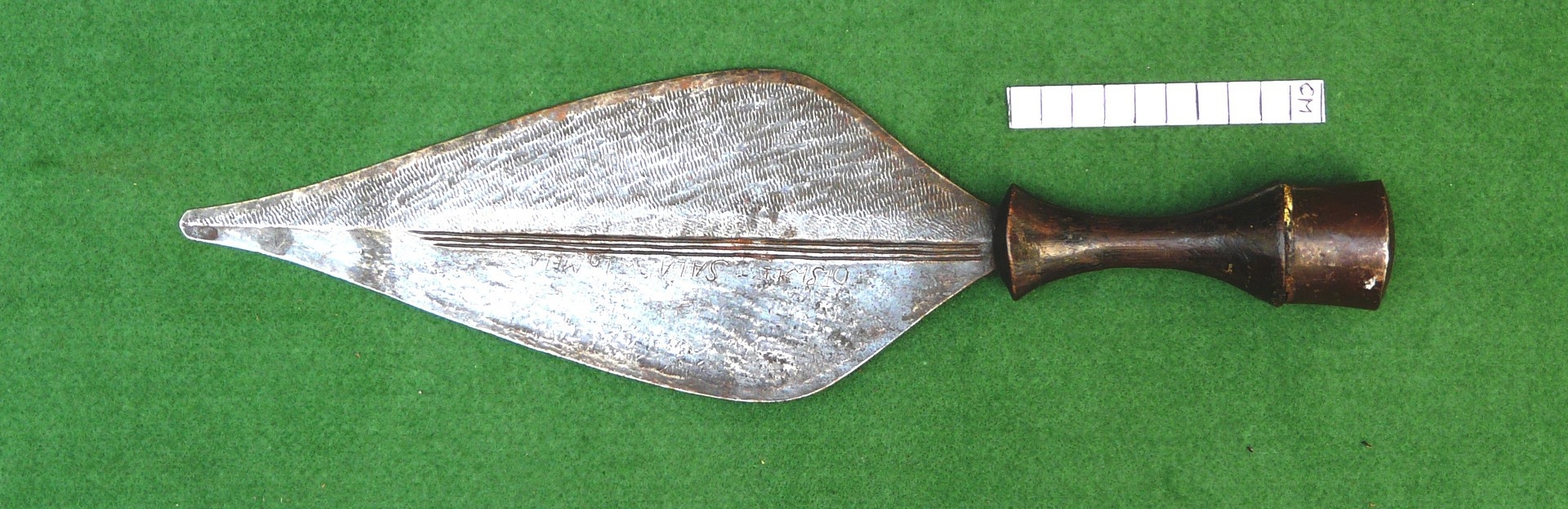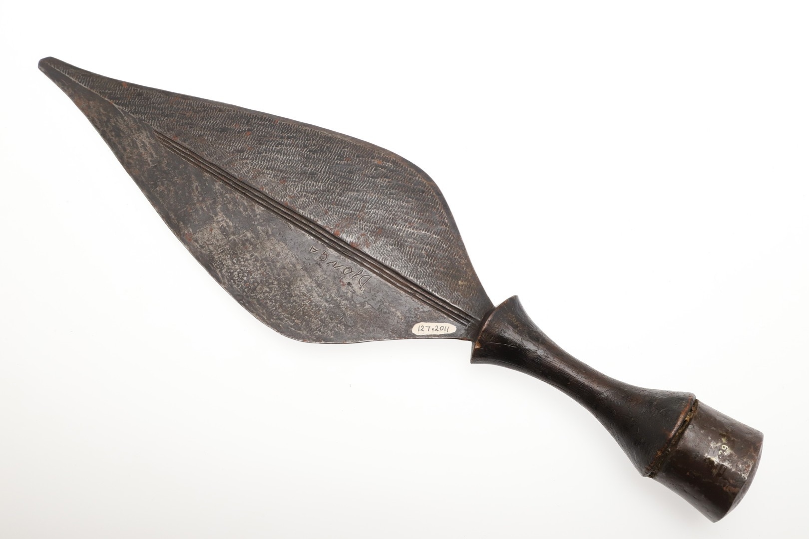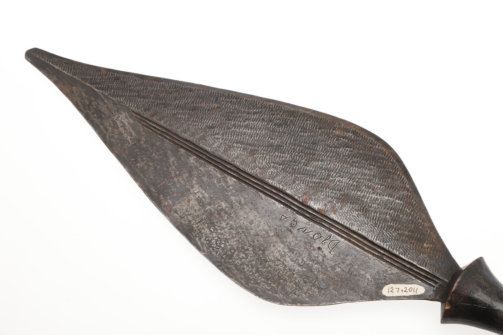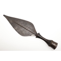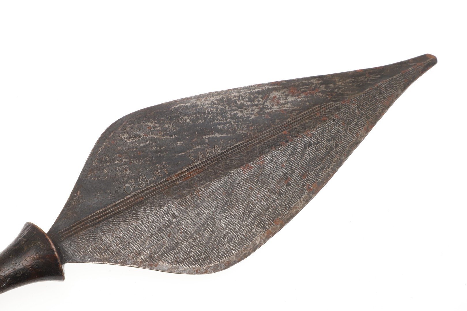 AN AFRICAN KNIFE OF THE NGALA A BANTU OR BANGALA PEOPLE. The 26 cm spear shaped blade with three narrow off-centre fullers, the blade textured to one side and engraved ''DJONGA' and 'DISLI SALA LOMELA'. On a short brass handle. 38 cm.