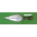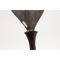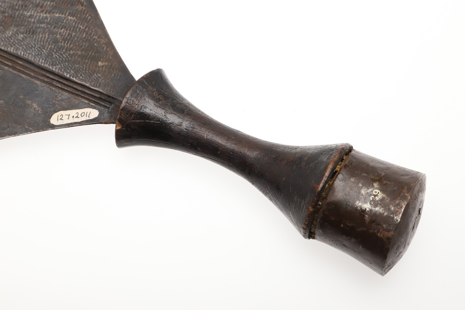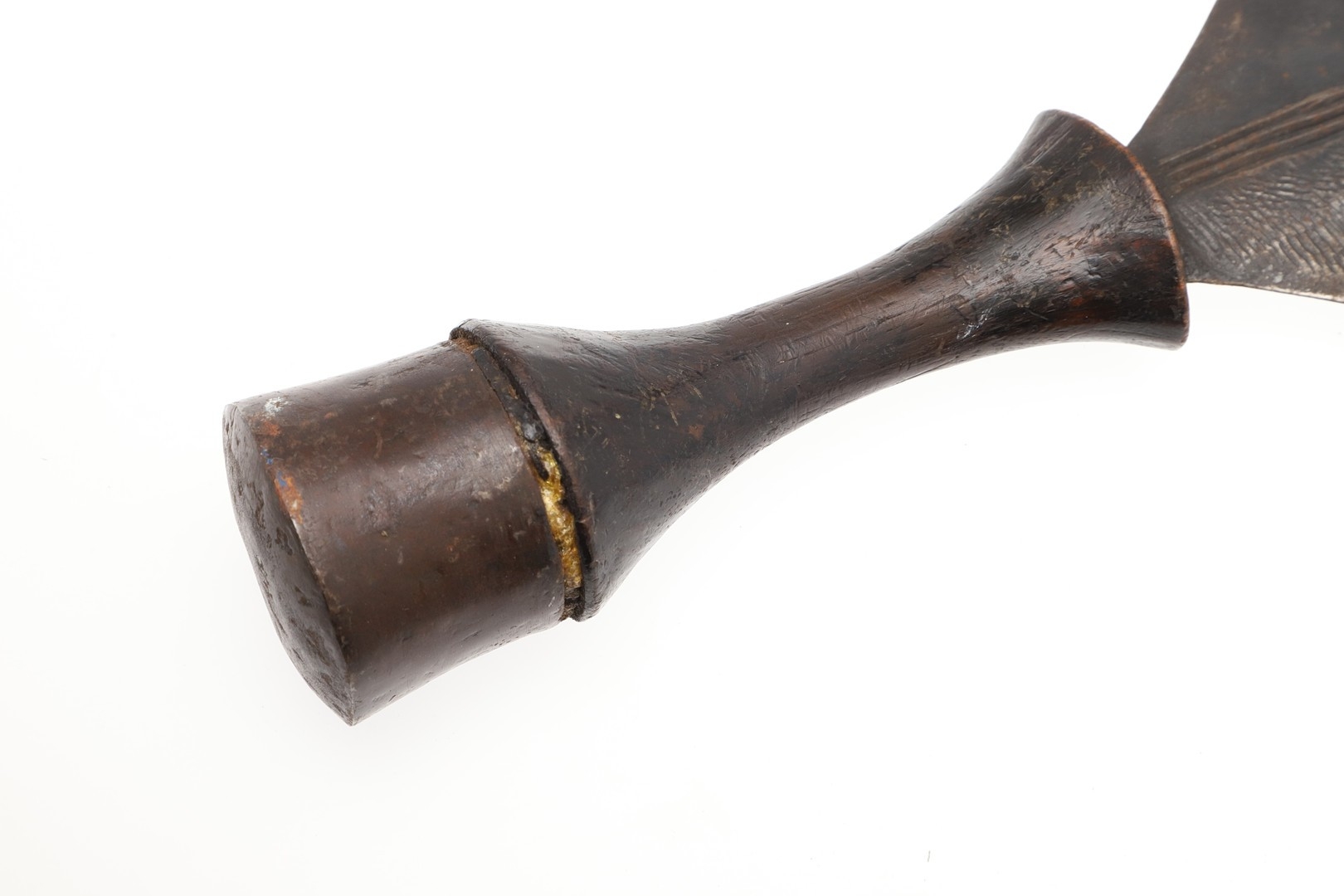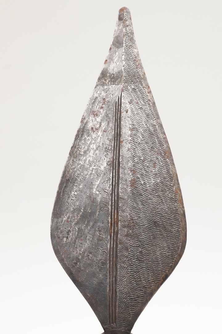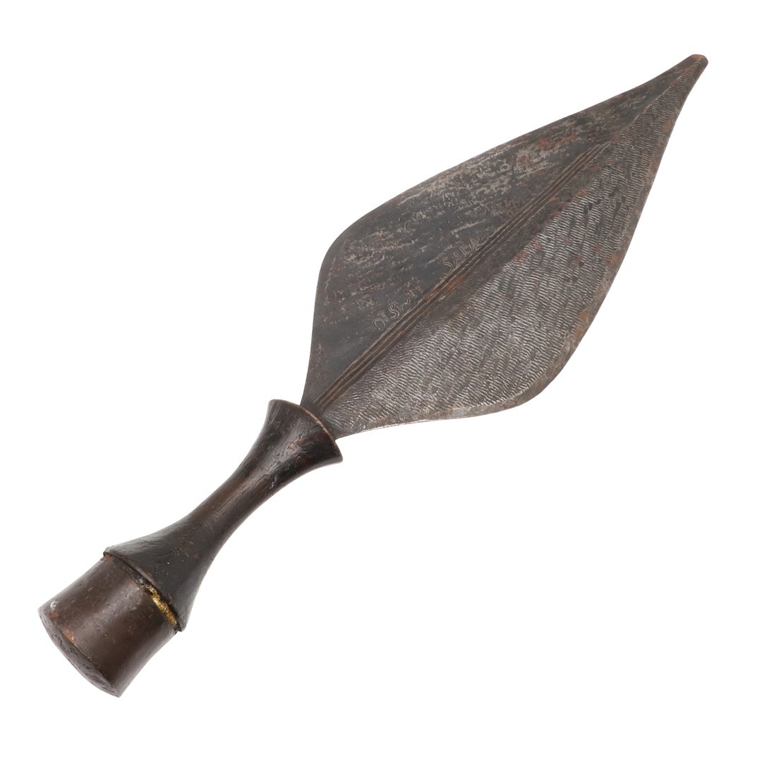 AN AFRICAN KNIFE OF THE NGALA A BANTU OR BANGALA PEOPLE. The 26 cm spear shaped blade with three narrow off-centre fullers, the blade textured to one side and engraved ''DJONGA' and 'DISLI SALA LOMELA'. On a short brass handle. 38 cm.
