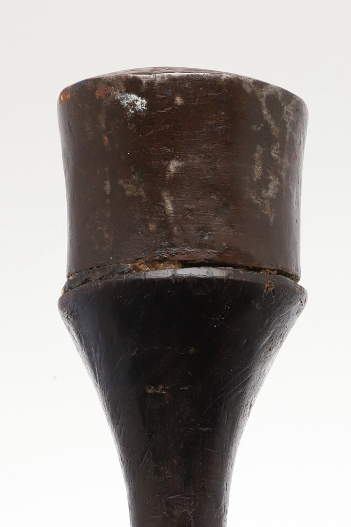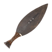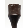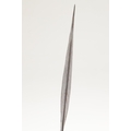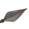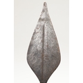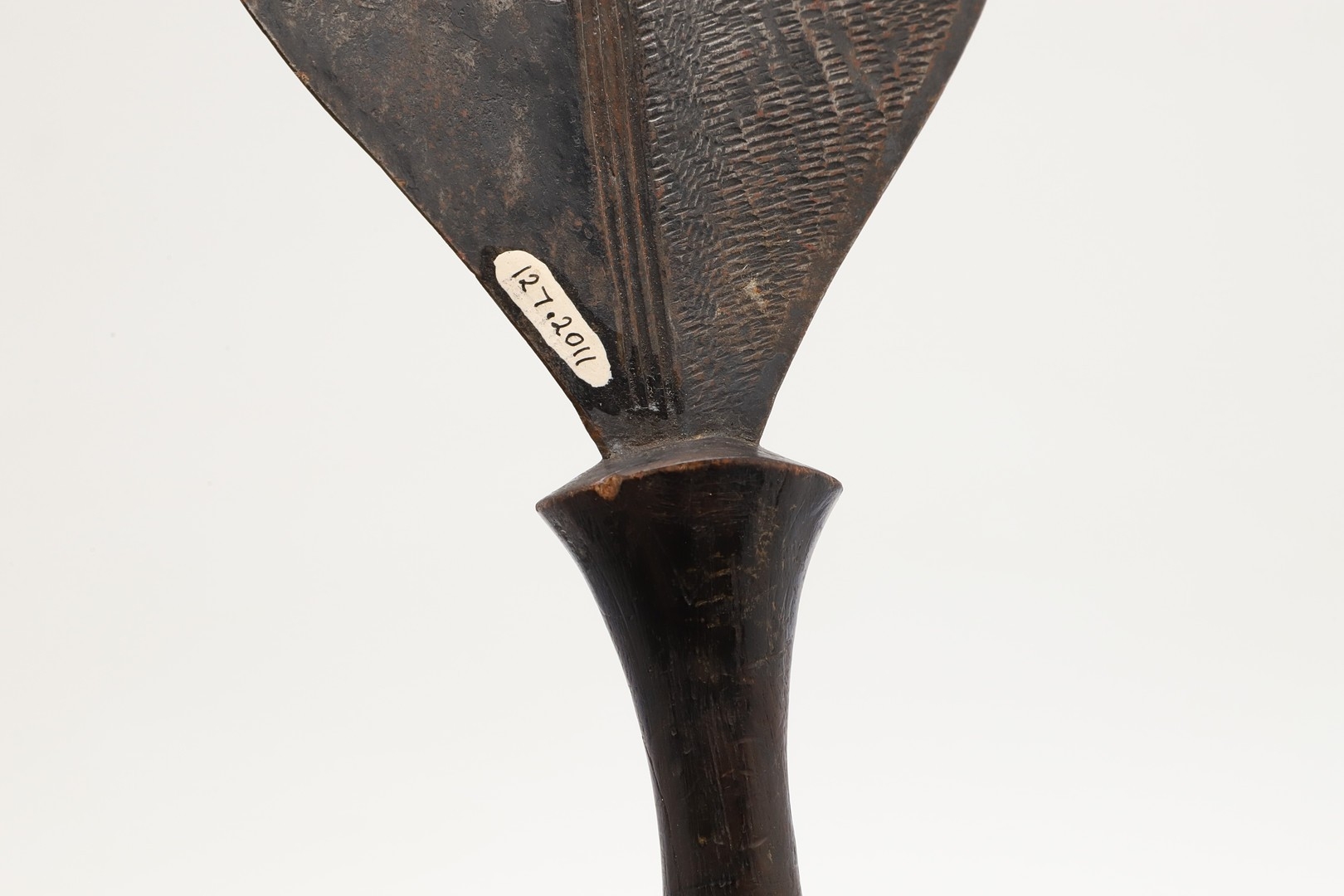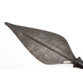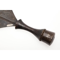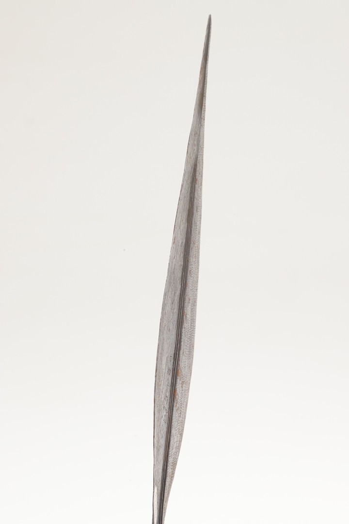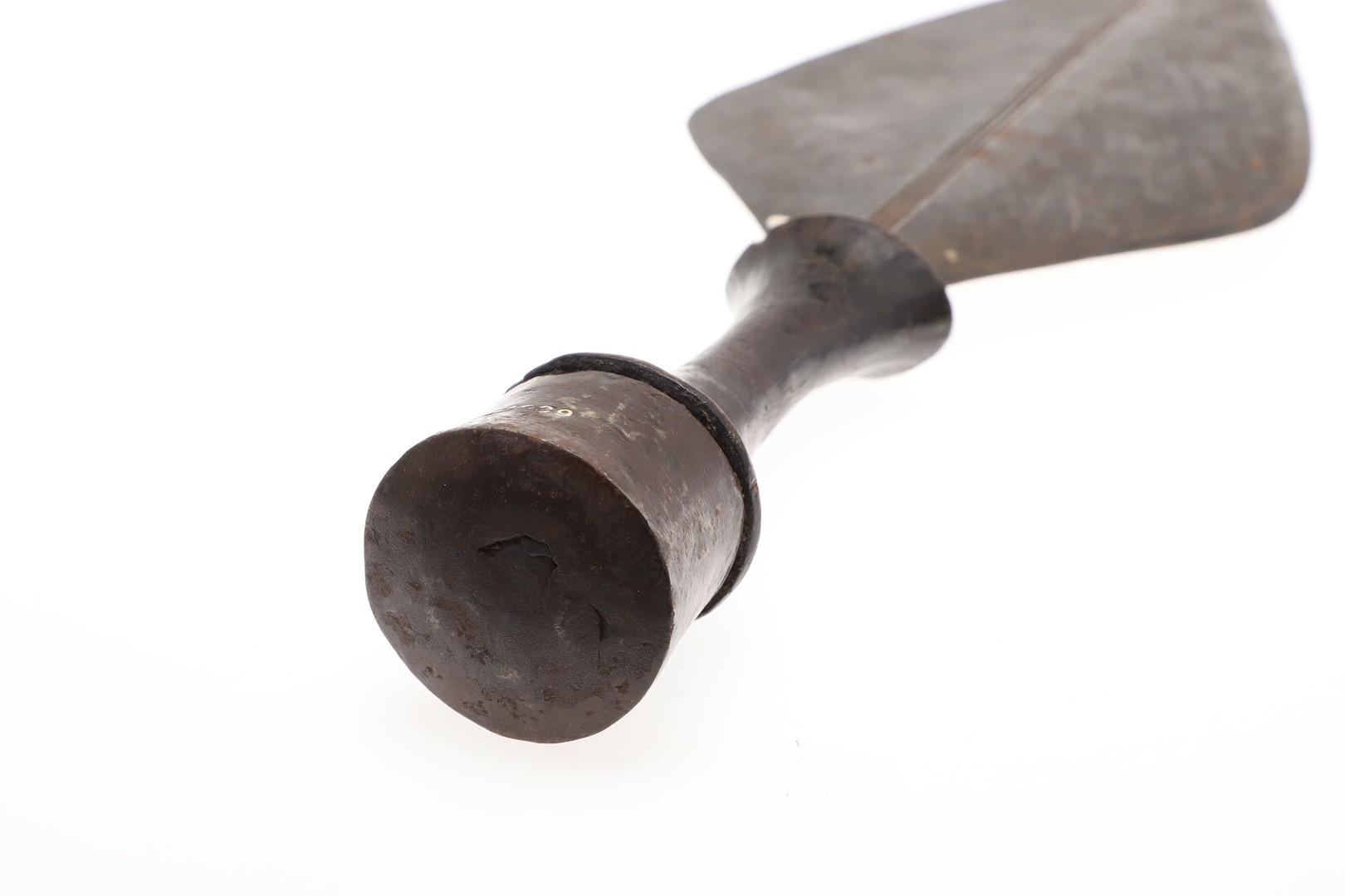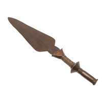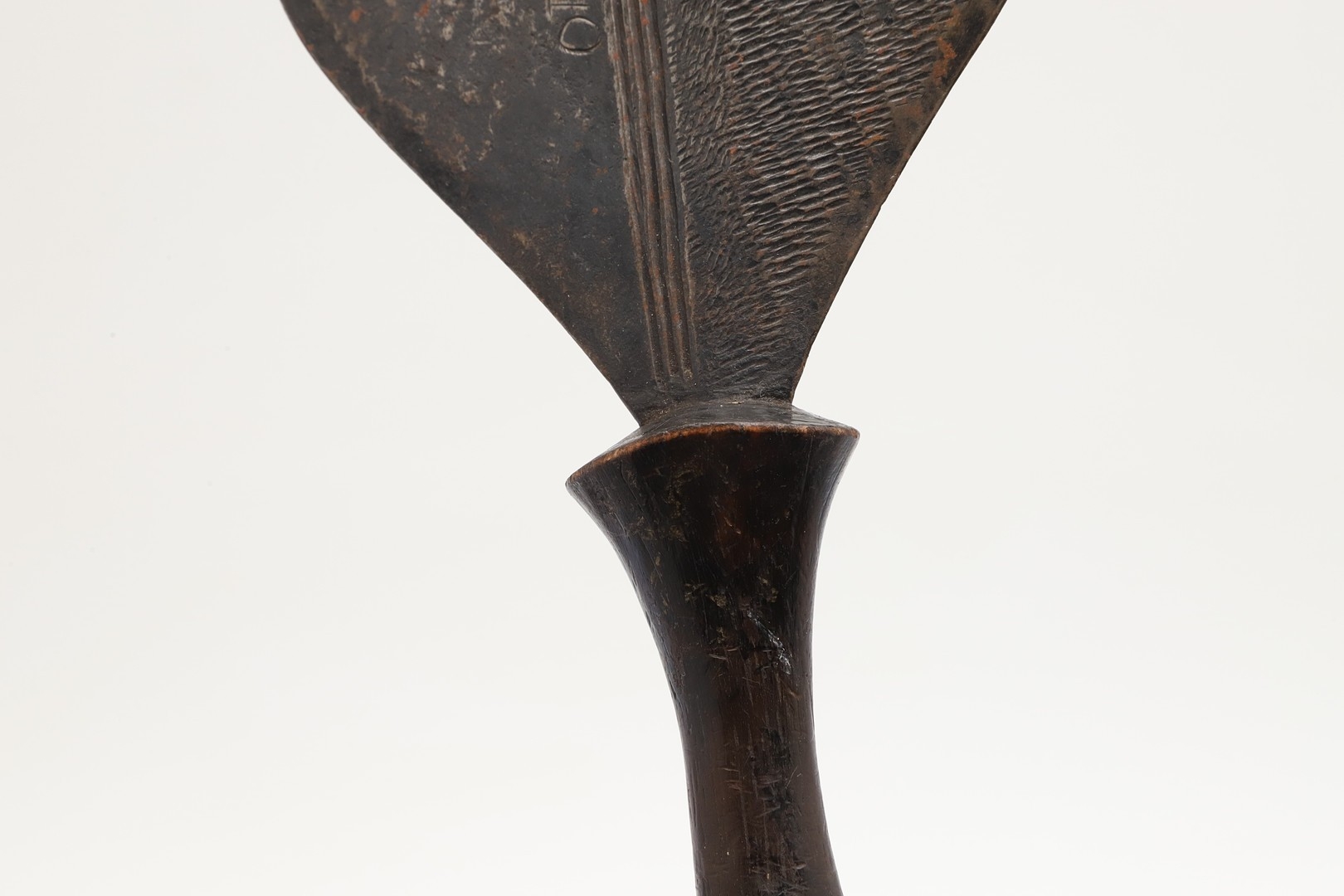 AN AFRICAN KNIFE OF THE NGALA A BANTU OR BANGALA PEOPLE. The 26 cm spear shaped blade with three narrow off-centre fullers, the blade textured to one side and engraved ''DJONGA' and 'DISLI SALA LOMELA'. On a short brass handle. 38 cm.