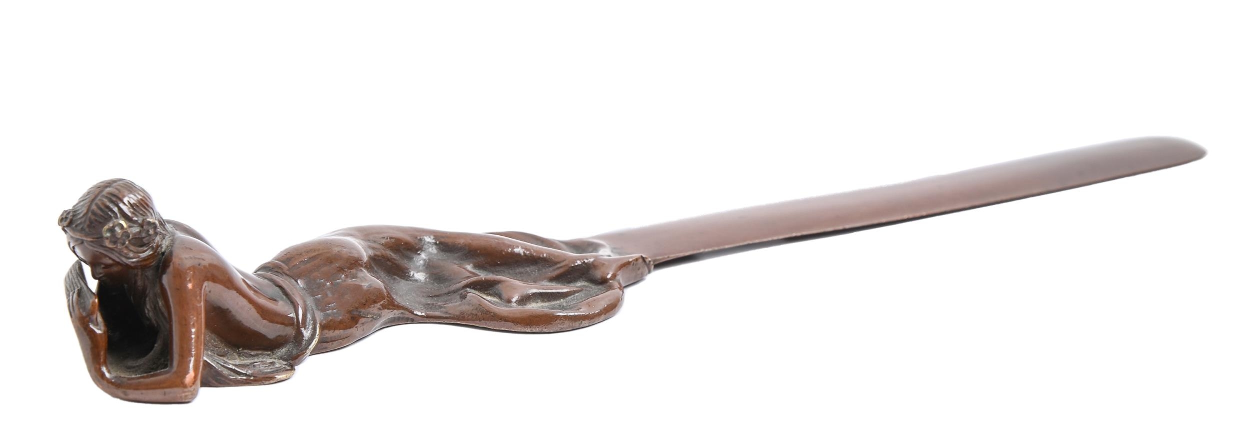 An Art Nouveau bronze figural letter knife, c1900, the handle in the form of a reclining nymph, rich brown patina, 28.5cm l