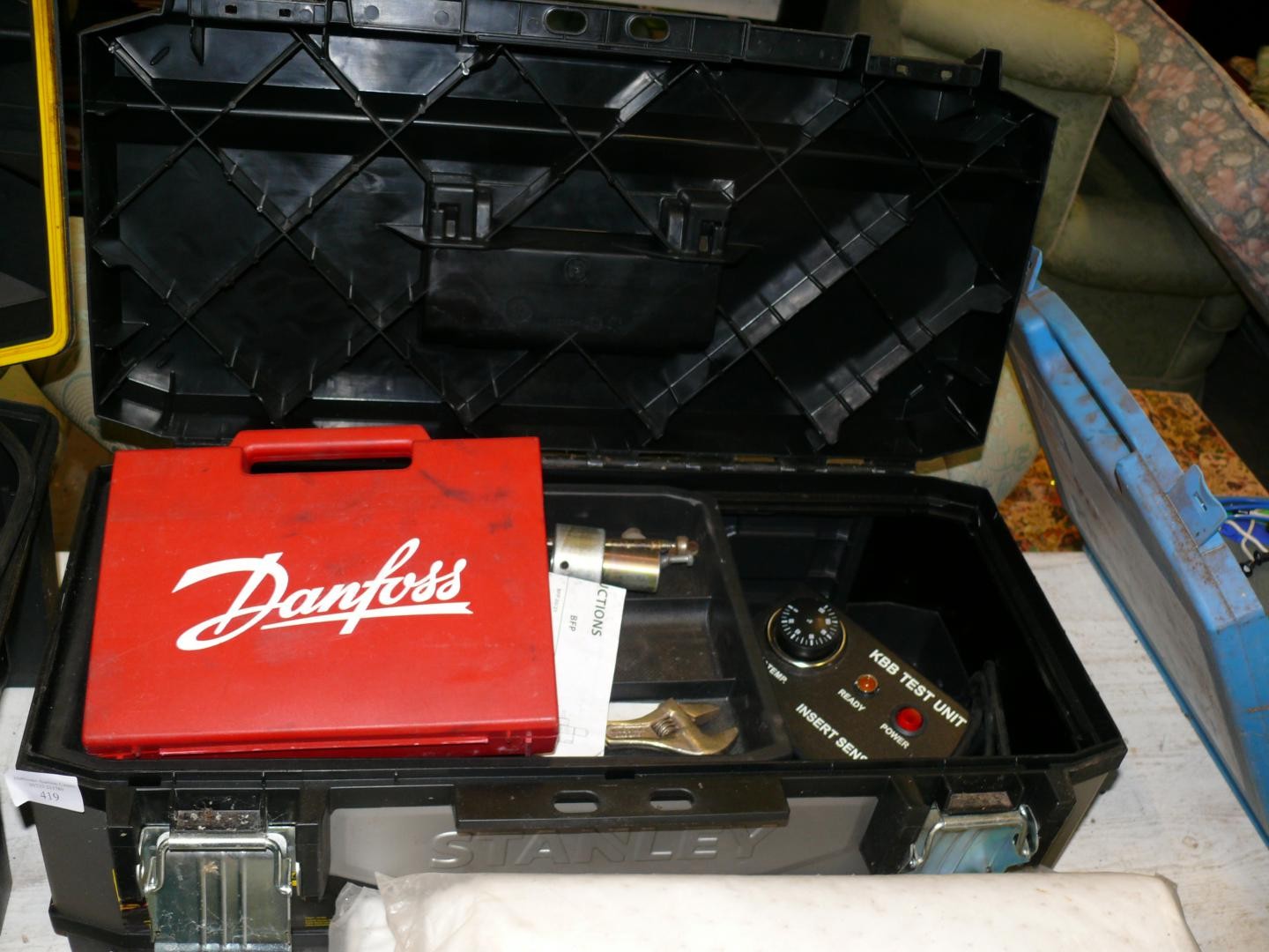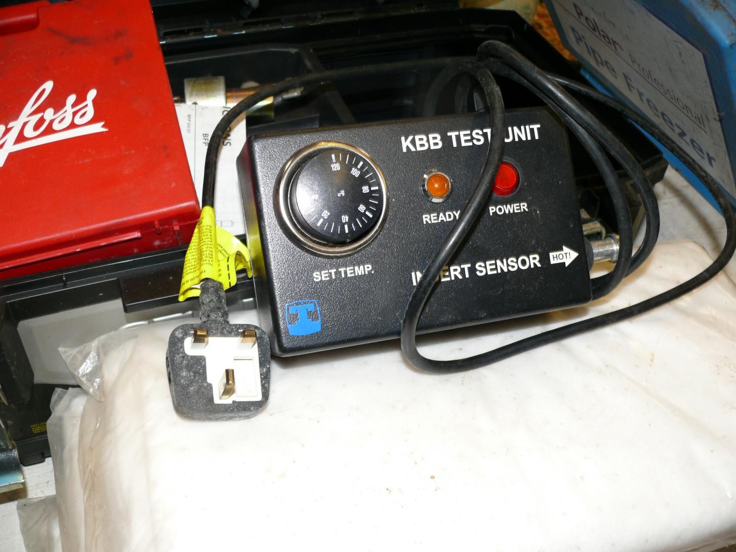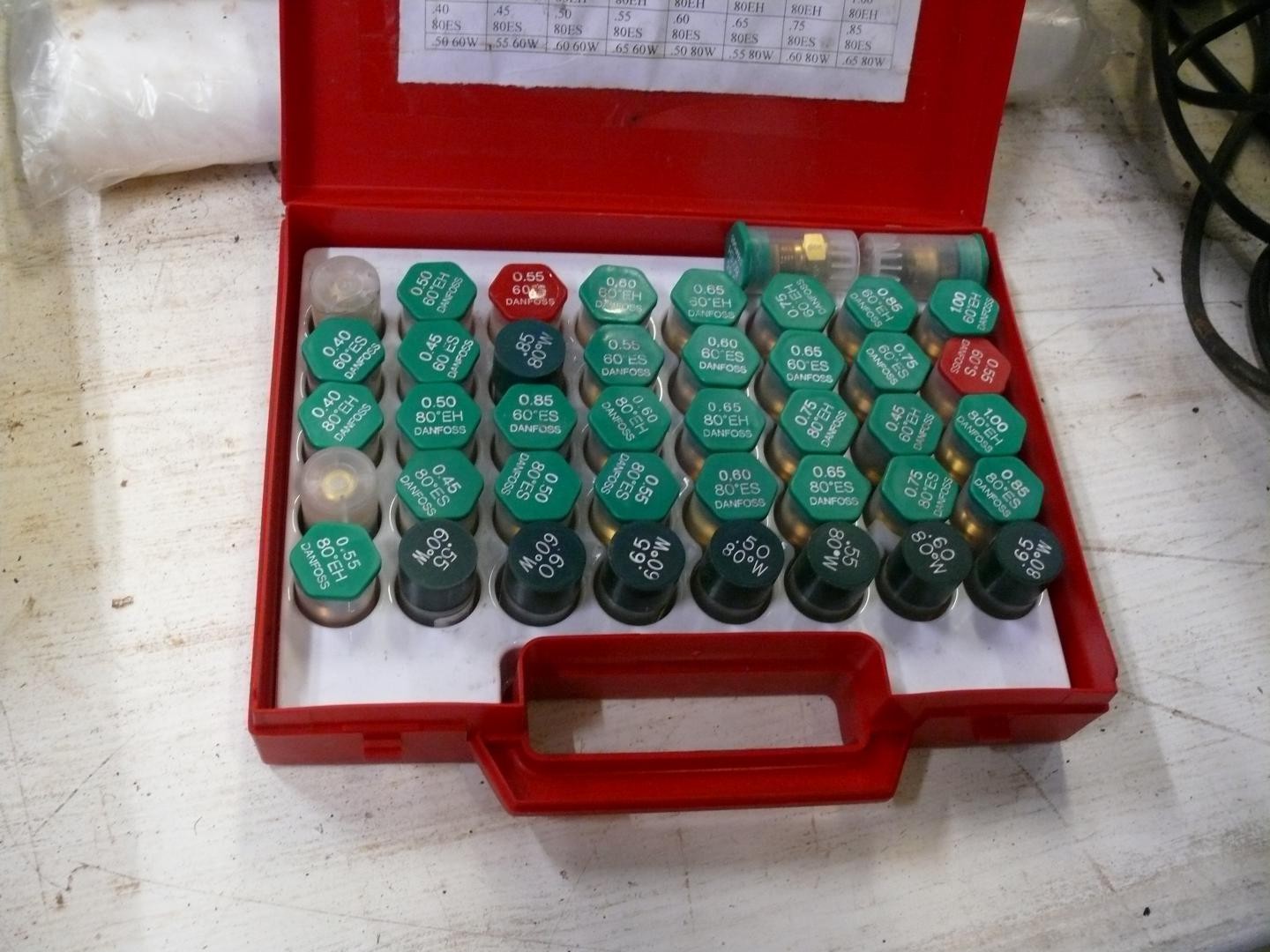 ENGINEERS TEST KIT TO INCLUDE KBB TEST UNI, OIL PRIMING PUMP, SET OF 42 BRAND NEW PRESSURE JET NOSSLES FOR OIL BOILERS BY DANFOSS AND FAN PULLER PLUS 3 OIL SPILL PADS