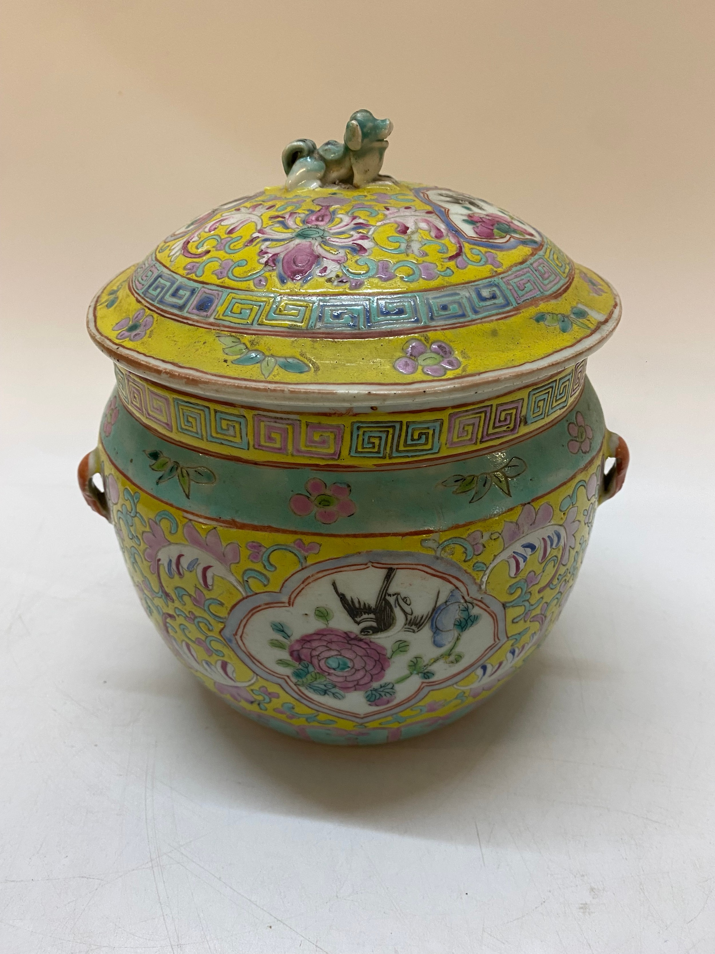 A 19th Century Chinese bowl and cover, turquoise and yellow with floral decoration, Dog of Fo to the lid - 9in. high