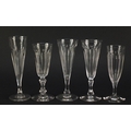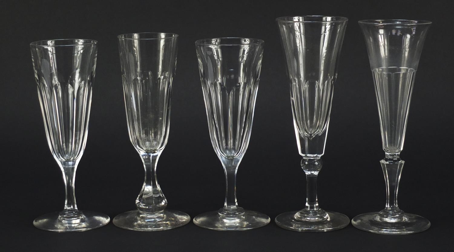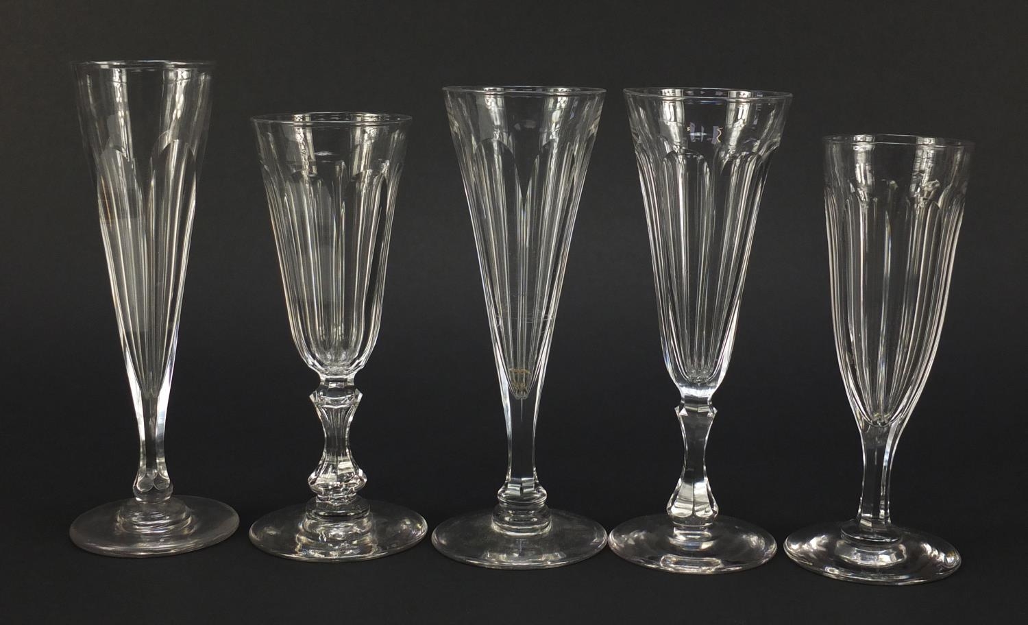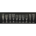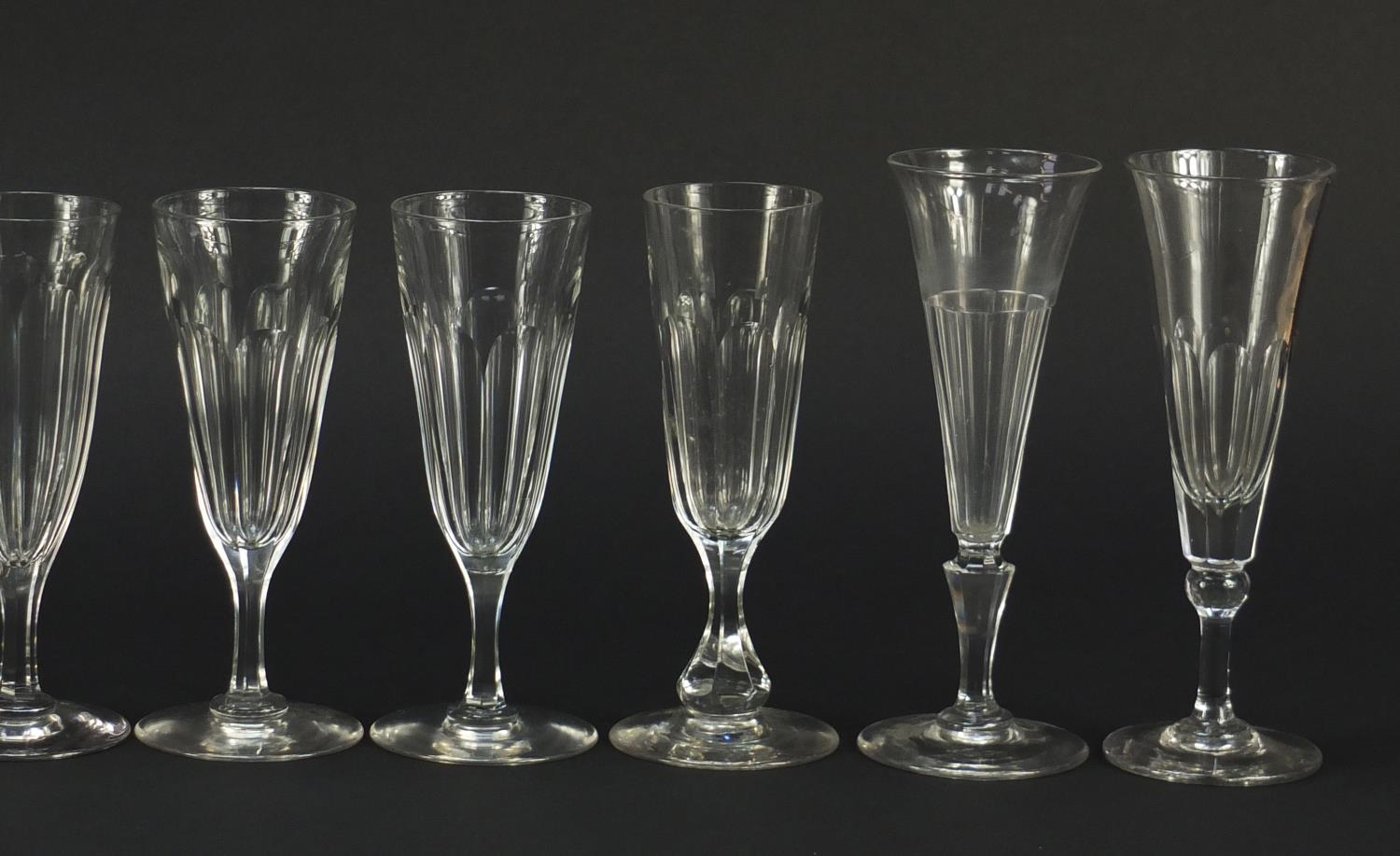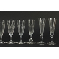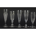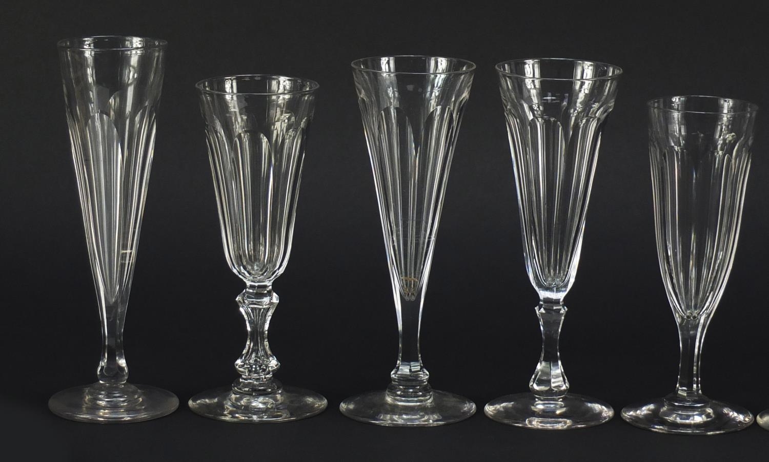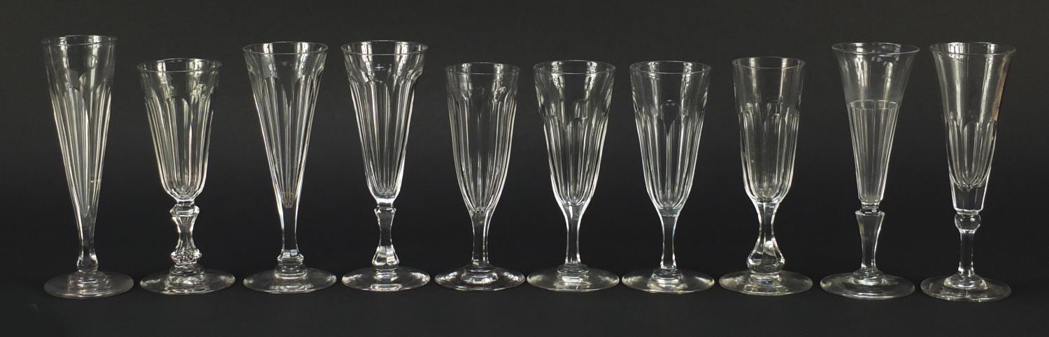 Ten 18th/19th century faceted Champagne flutes, the largest 18.5cm high