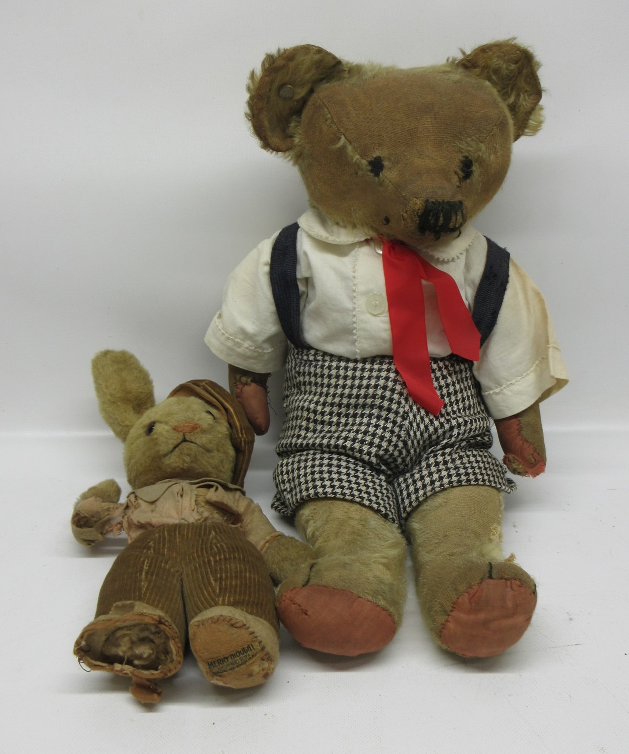 Merrythought blond mohair bear with houndstooth dungarees white shirt and red ribbon tie, merrythought button to left ear, A/F and a vintage bunny stuffed toy, blond mohair glass eyes corduroy trousers, felt shirt and beret, max H38cm approx
