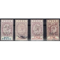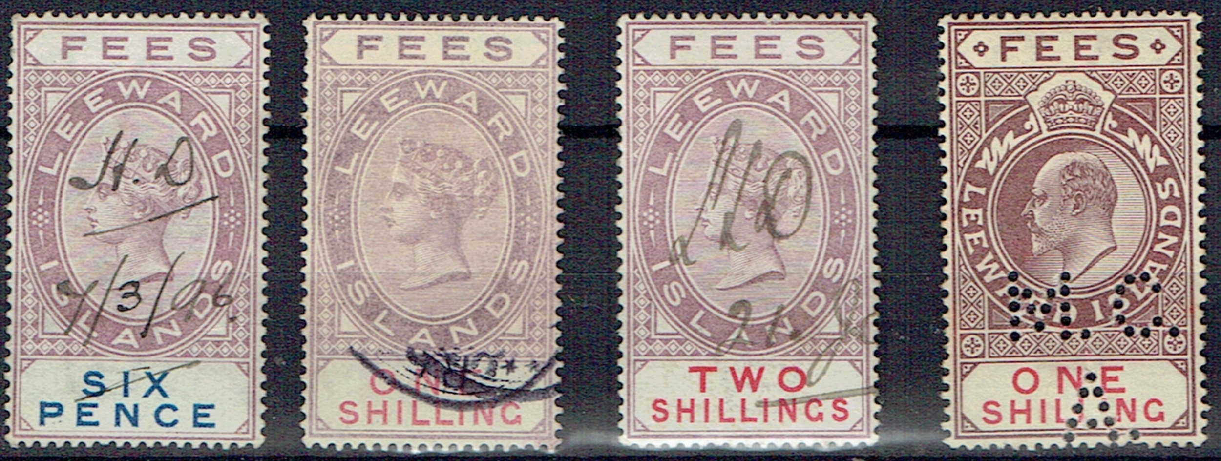 REVENUES & CINDERELLA - Leeward Islands: Fees 1882 6d, 1s & 2s, 1902 1s all neatly used, scarce. Barefoot 1/3, 7. (4).