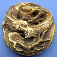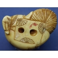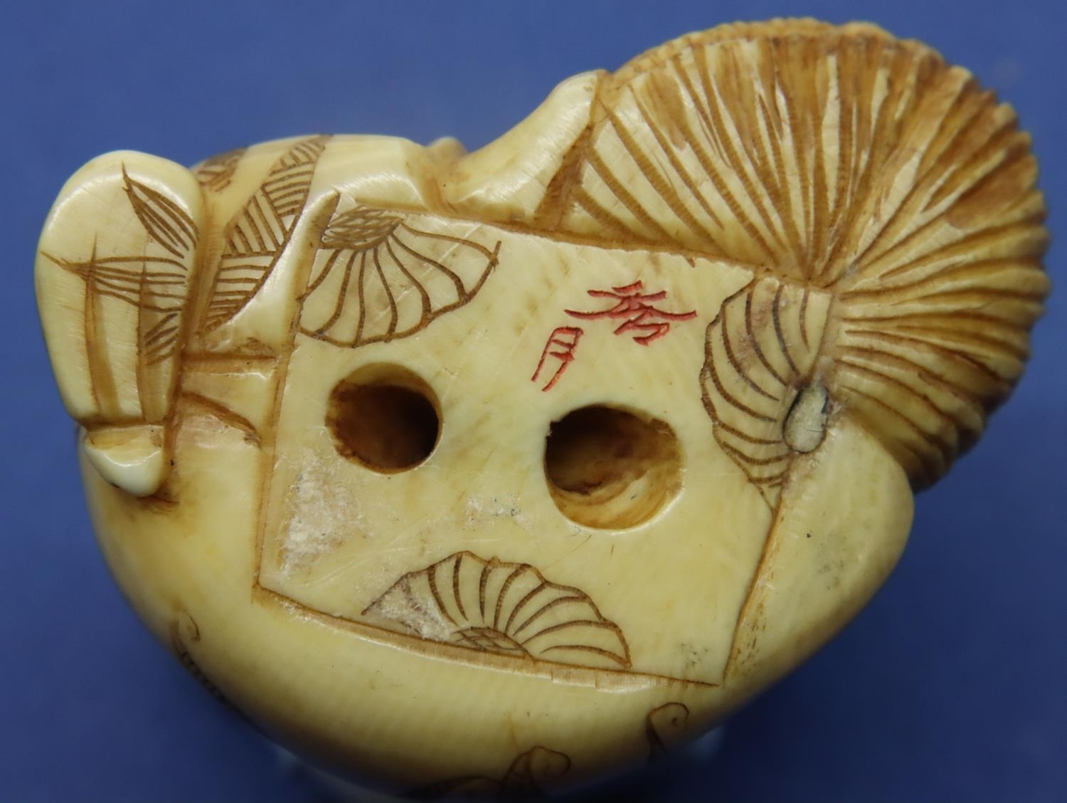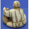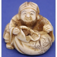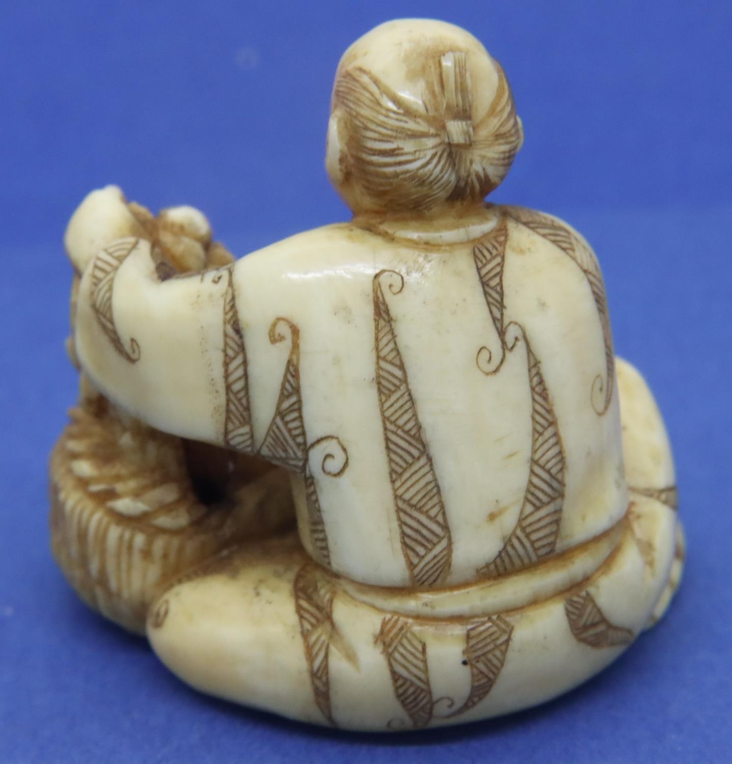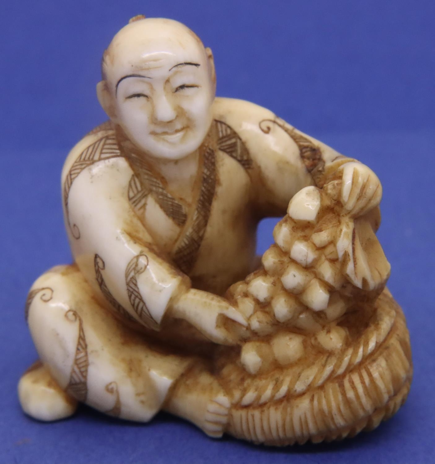Ivory carved netsuke in the form of a seated man with fruit in a basket, H: 35 mm, signed to base. P&P Group 1 (£14+VAT for the first lot and £1+VAT for subsequent lots)