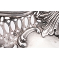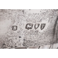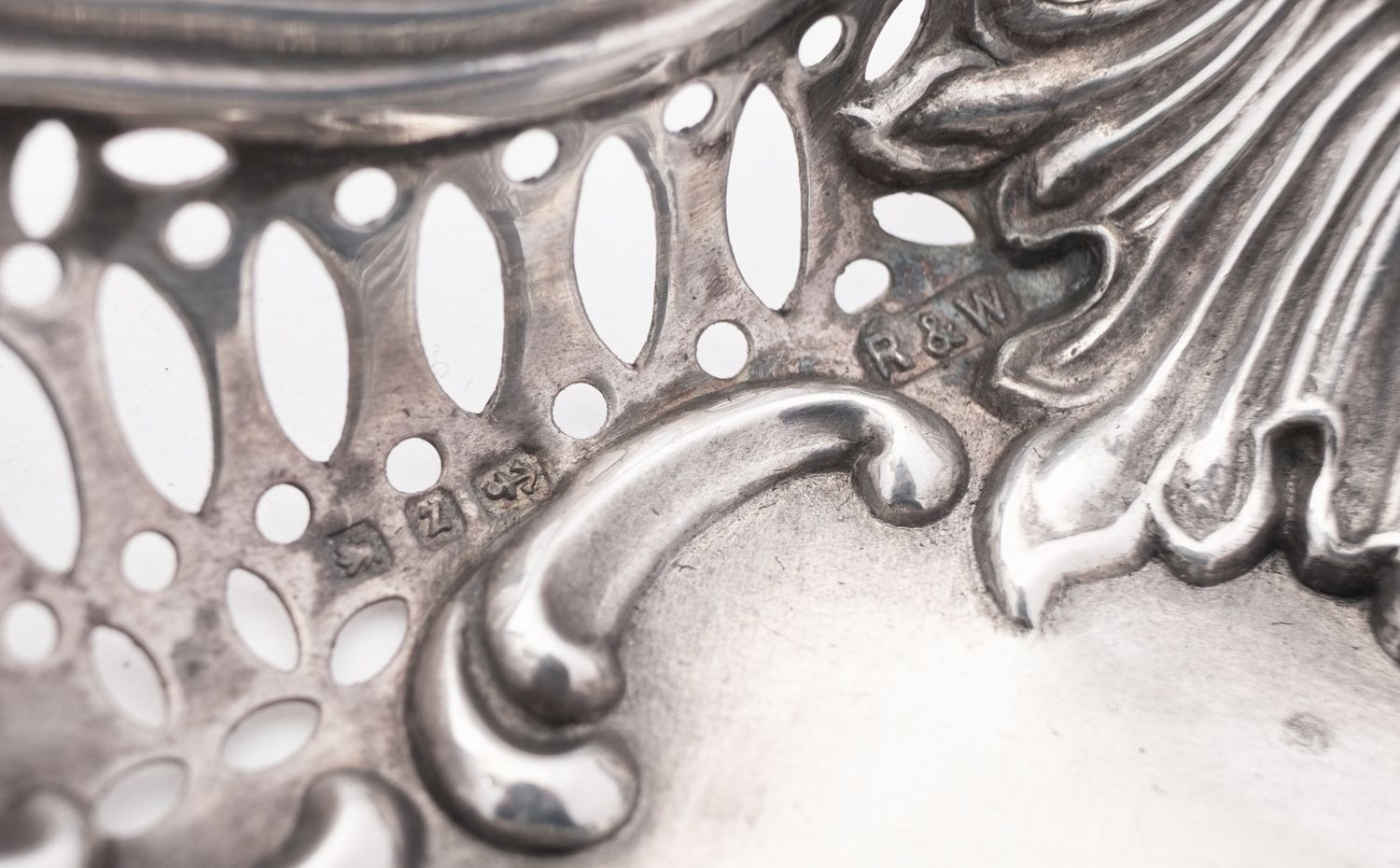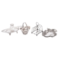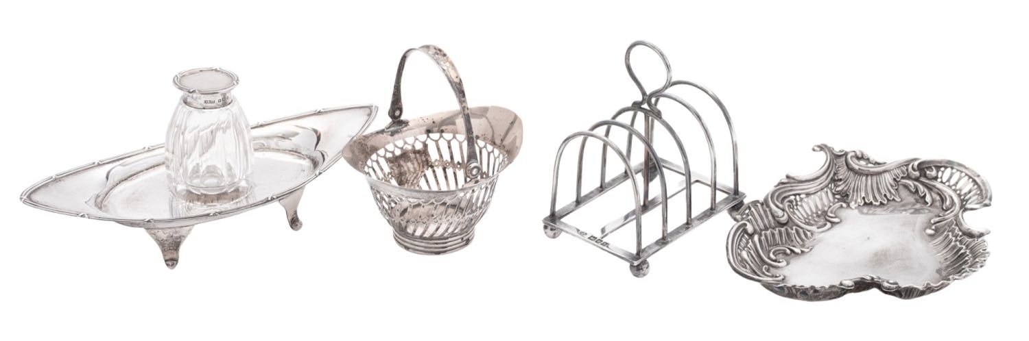 A mixed lot of silver, to include a navette-shaped inkwell, a dish decorated in the Rococo manner, a small swing-handled basket and a toast rack, mixed makers & dates; the dish 6'' (15.2cm) long; 8.5ozt (4)