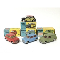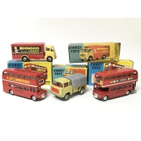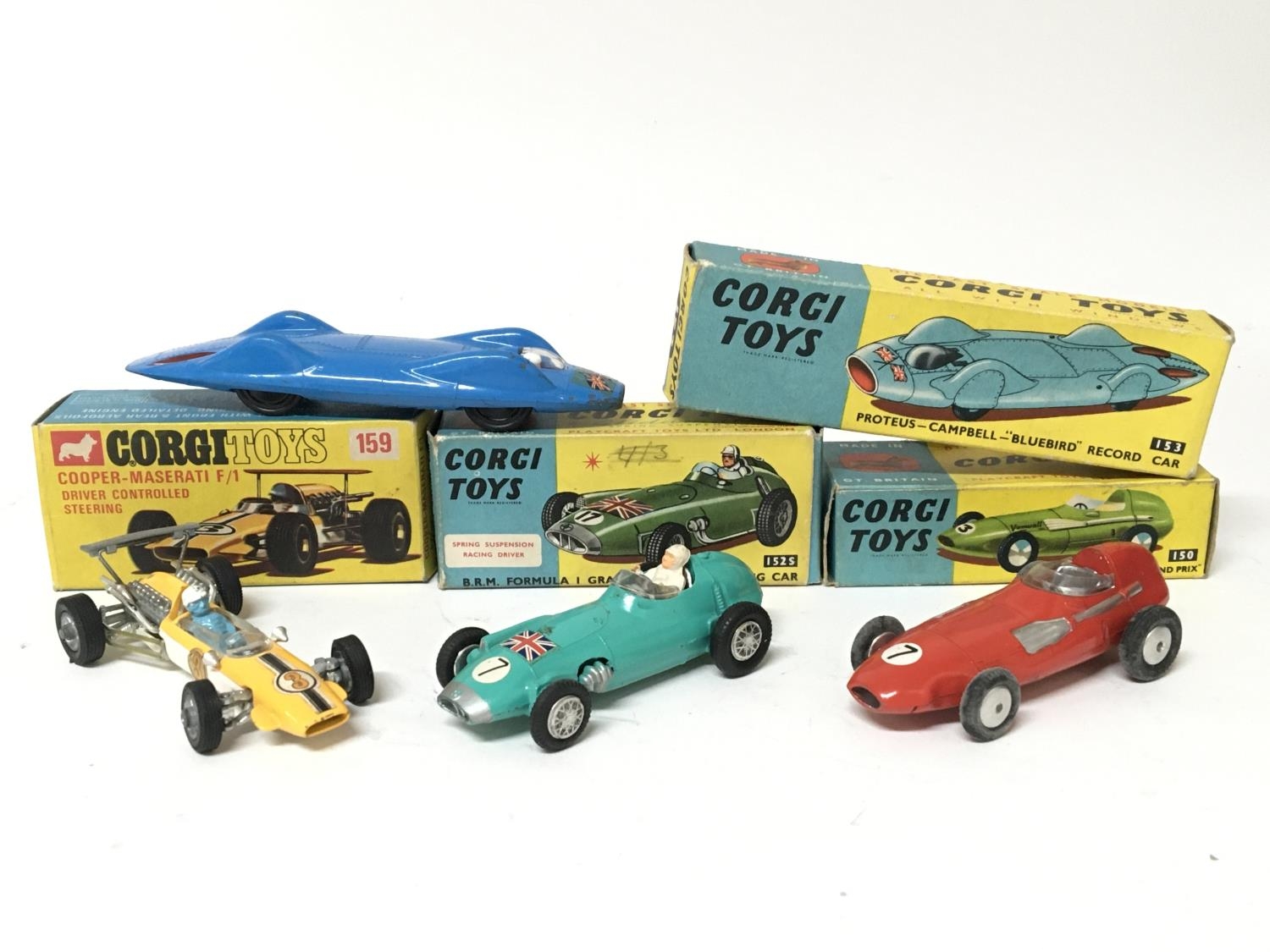 Corgi toys, #153 Proteus Campbell Bluebird record car, #150 Vanwall F1 Grand Prix, #152S BRM F1 Grand Prix racing car and #159 Cooper Maserati F1, boxed