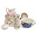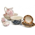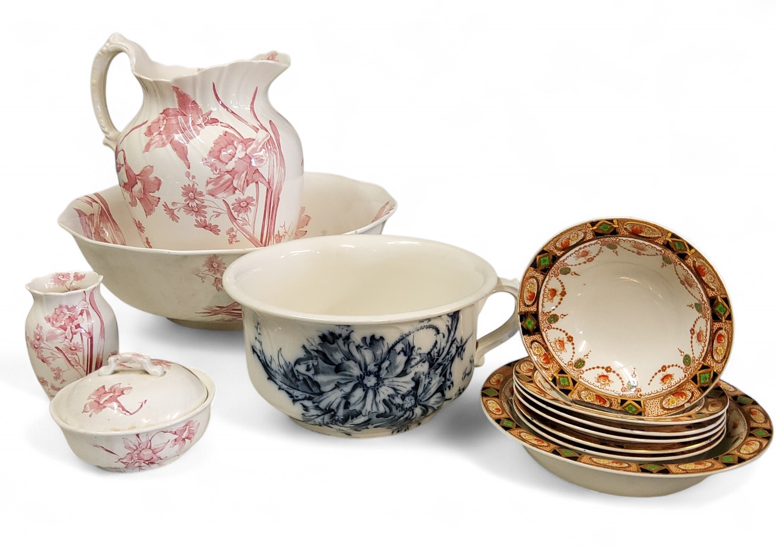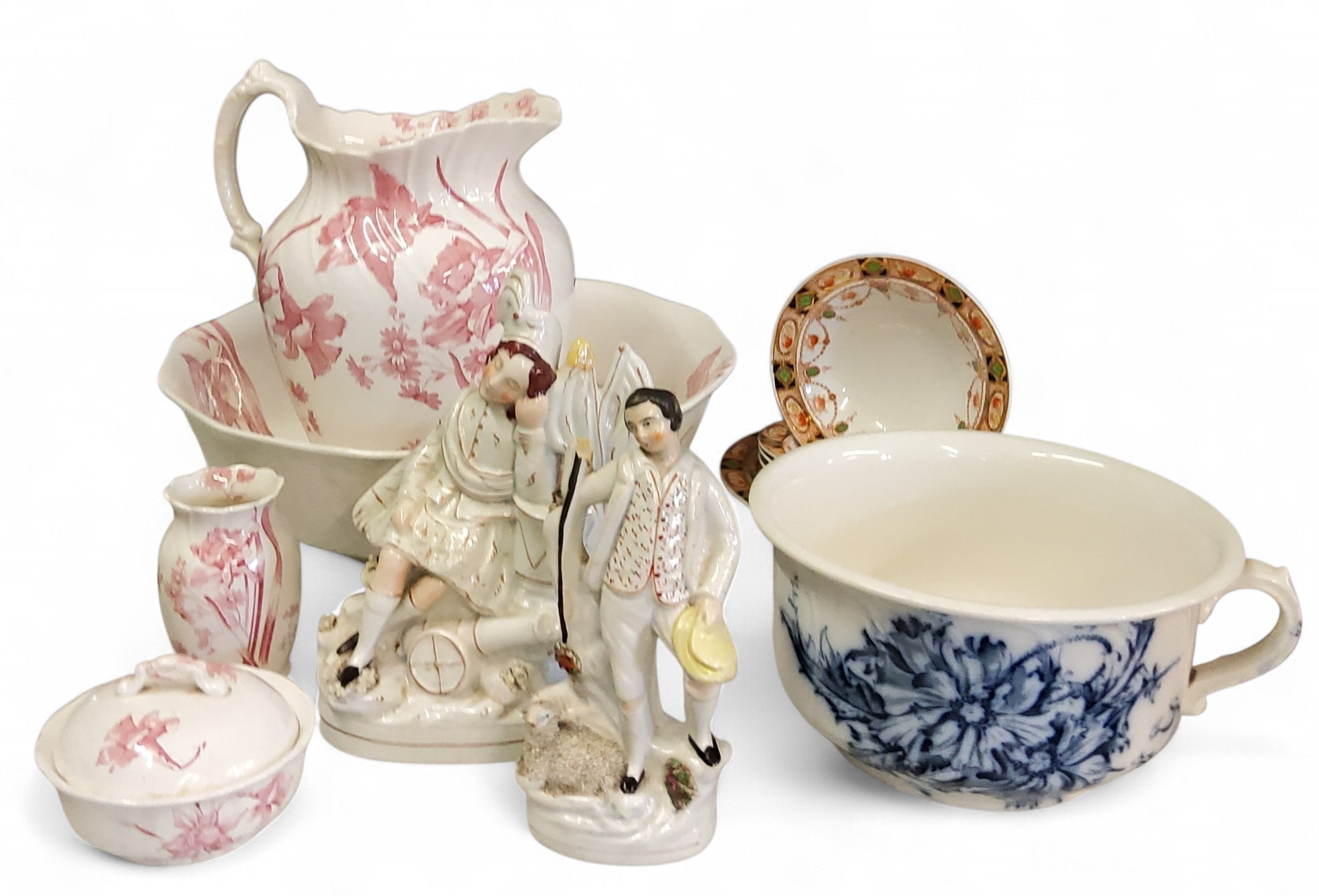 An early 20th century Furnival's wash jug, bowl, soap dish and vase, transfer printed in pink with tulips, the bowl 40cm diam, registration number; a Victorian flow blue Adelaide pattern chamber pot; a Staffordshire flat back, The Soldier's Dream, picked out in gilt, 27cm high, c.1880; another; Devon pattern dessert set; etc
