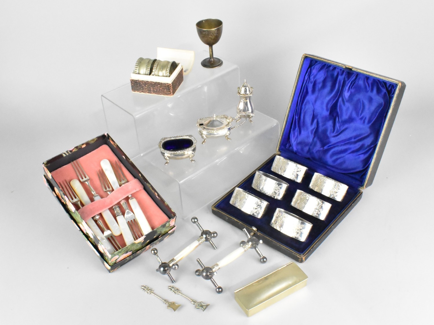 A Collection of Silver Plate to include Knife Rests, Cake Forks, Cruet, Napkin Rings Etc
