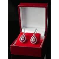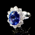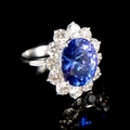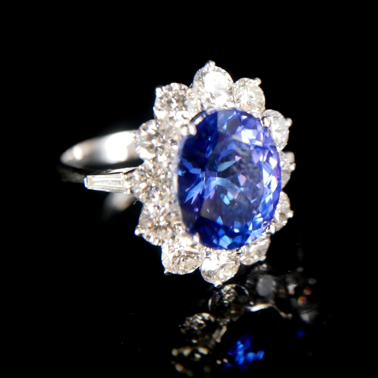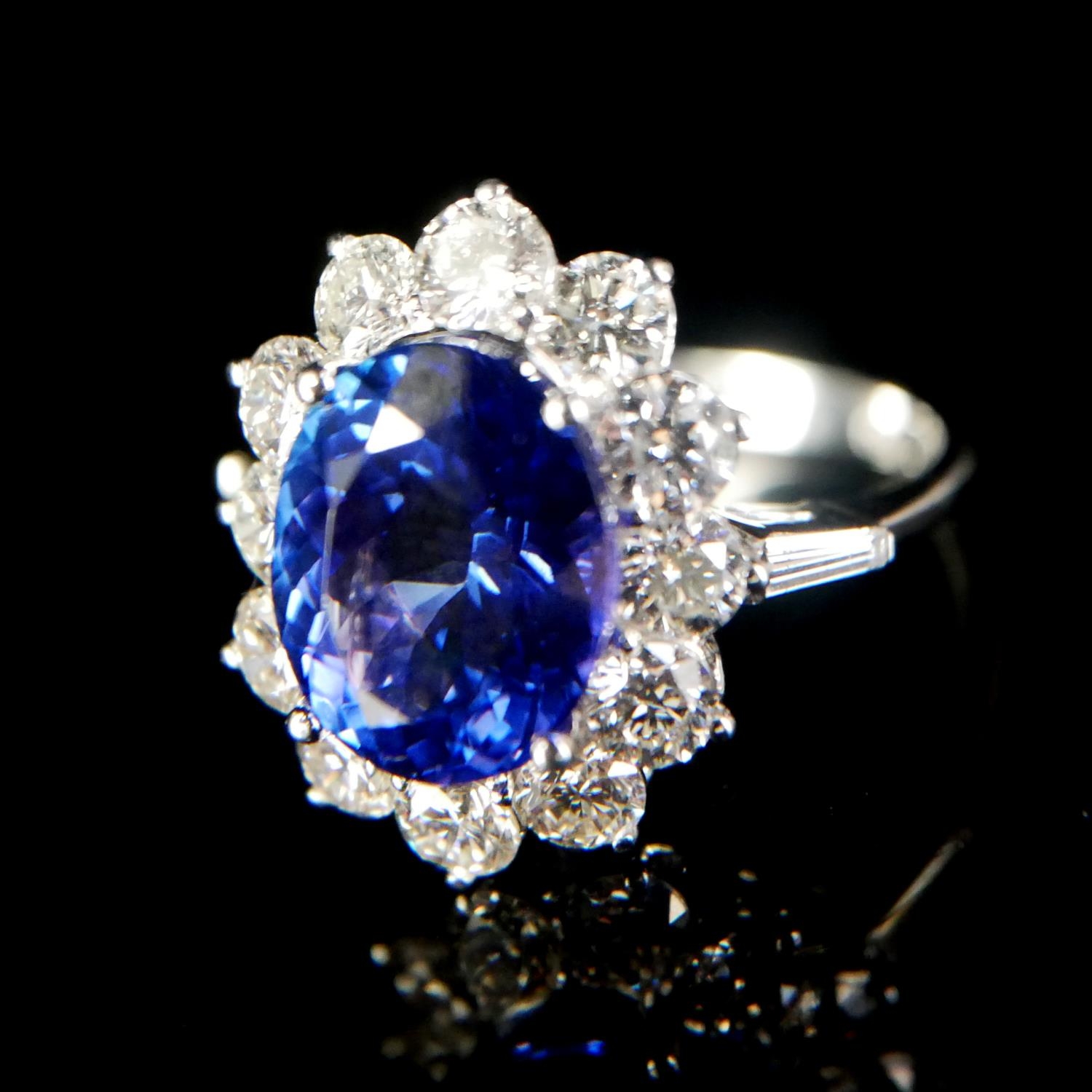 AN 18CT WHITE GOLD, OVAL AAA TANZANITE AND ROUND BRILLIANT CUT DIAMOND CLUSTER RING.