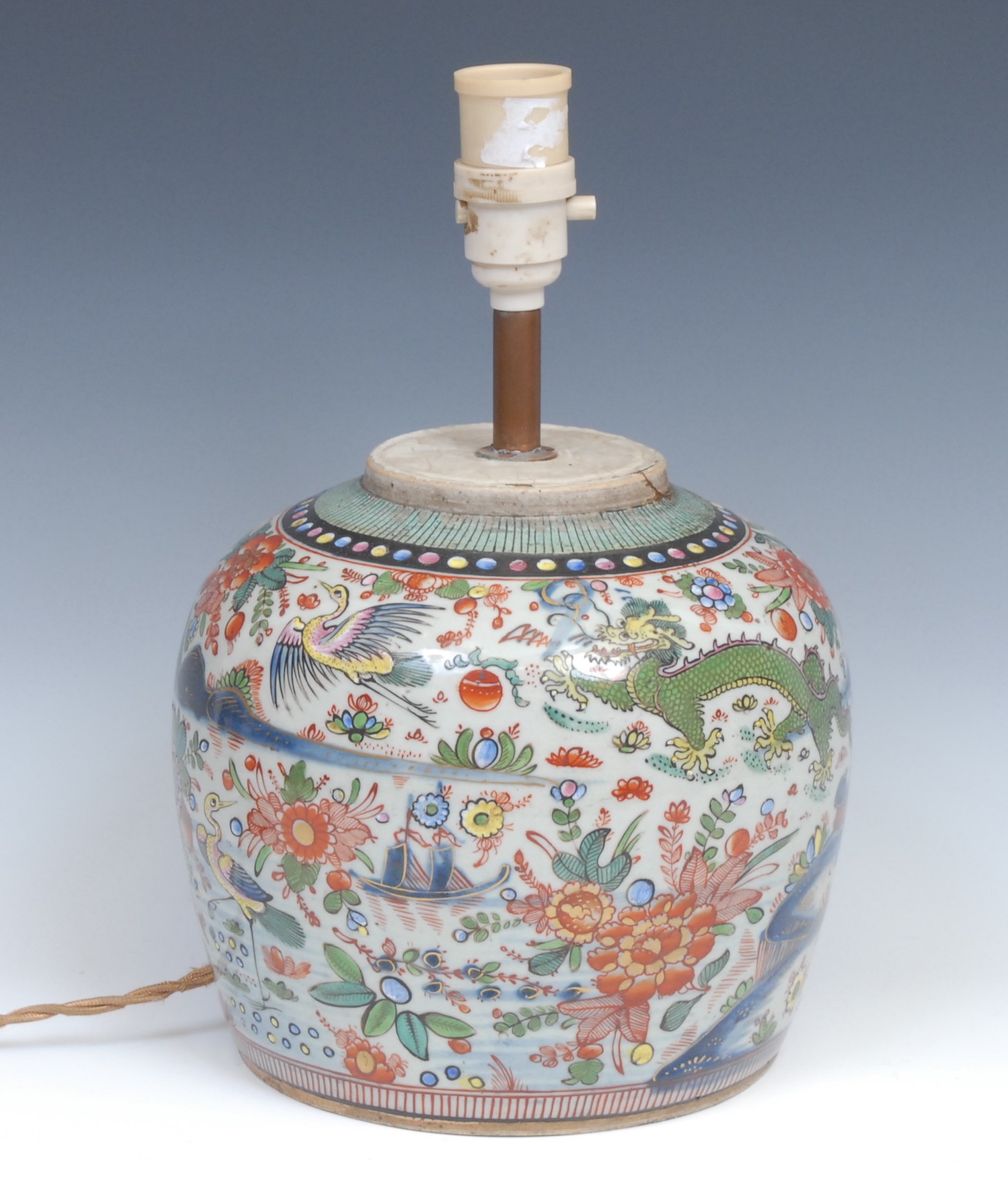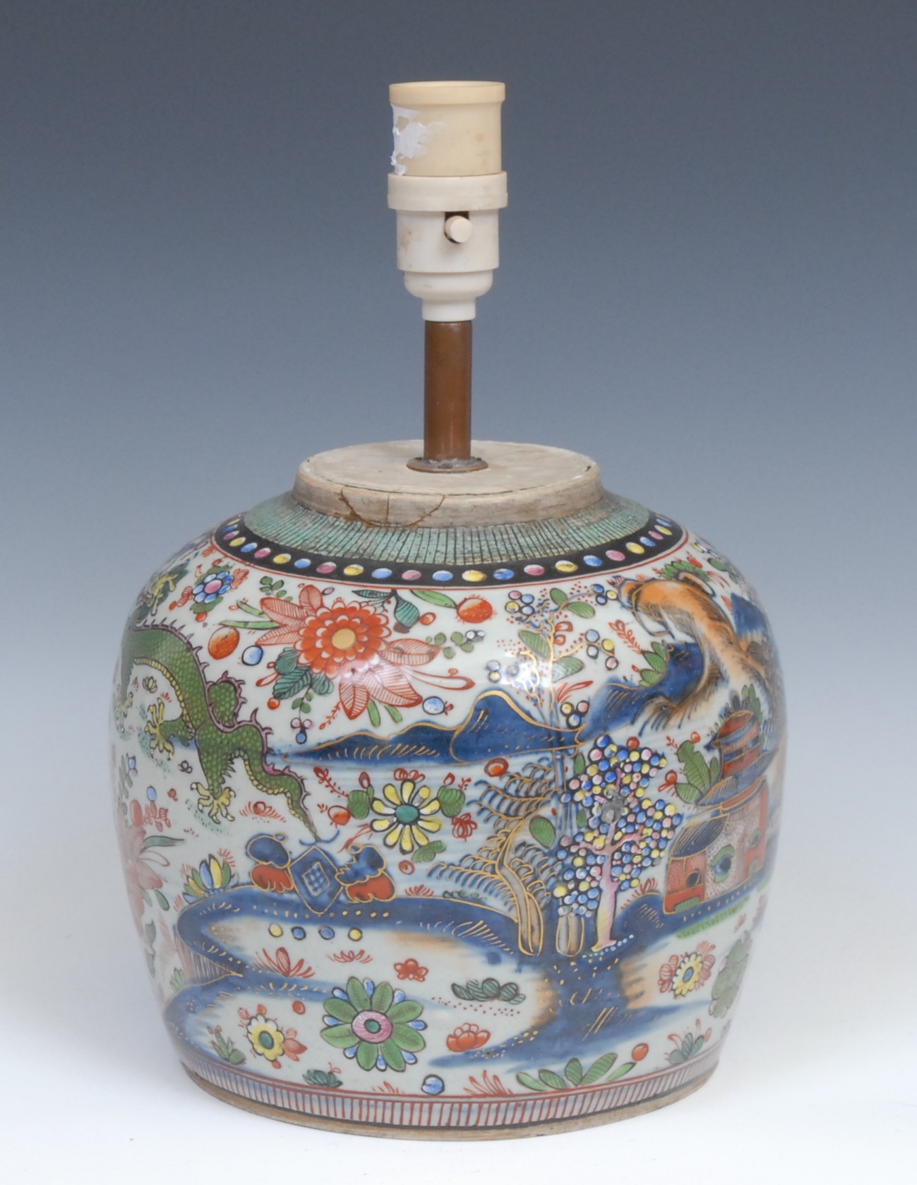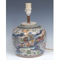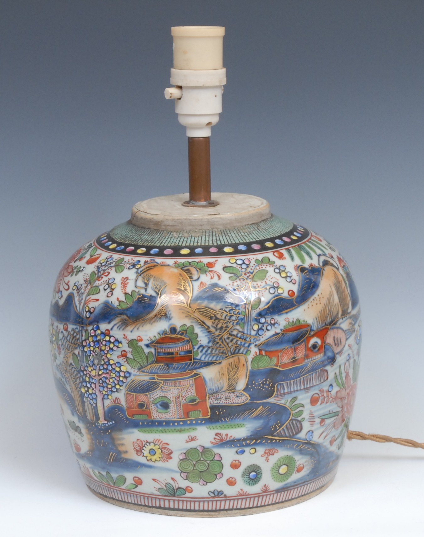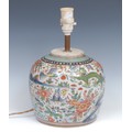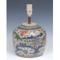 A Chinese ovoid doucai ginger jar, painted with a monumental landscape, clobbered in gilt, 20cm high, later fitted as a table lamp, 19th century