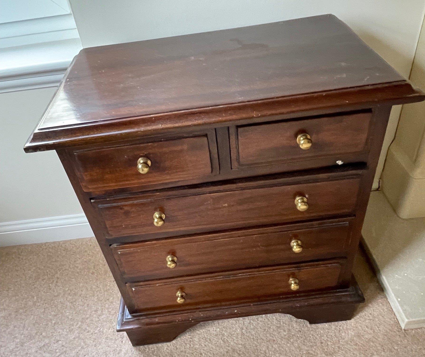 A beautiful wee low drawer unit with 2 over 3 drawers with brass button handles. An ideal storage solution for collections etc, 2ftH x 2ftW x 18"D approx