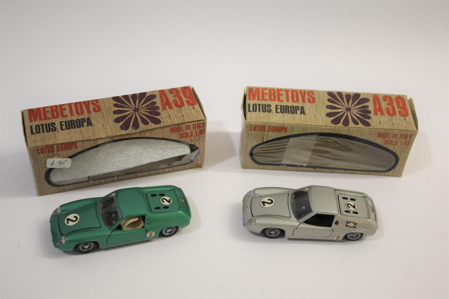 MEBETOYS (ITALY) - LOTUS EUROPA 2 boxed models, 1/43 scale A39 Lotus Europa, one in silver and the other in metallic green. (2)