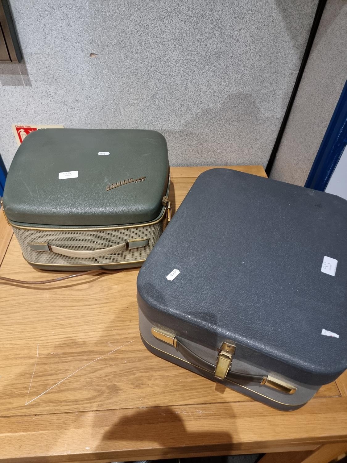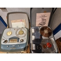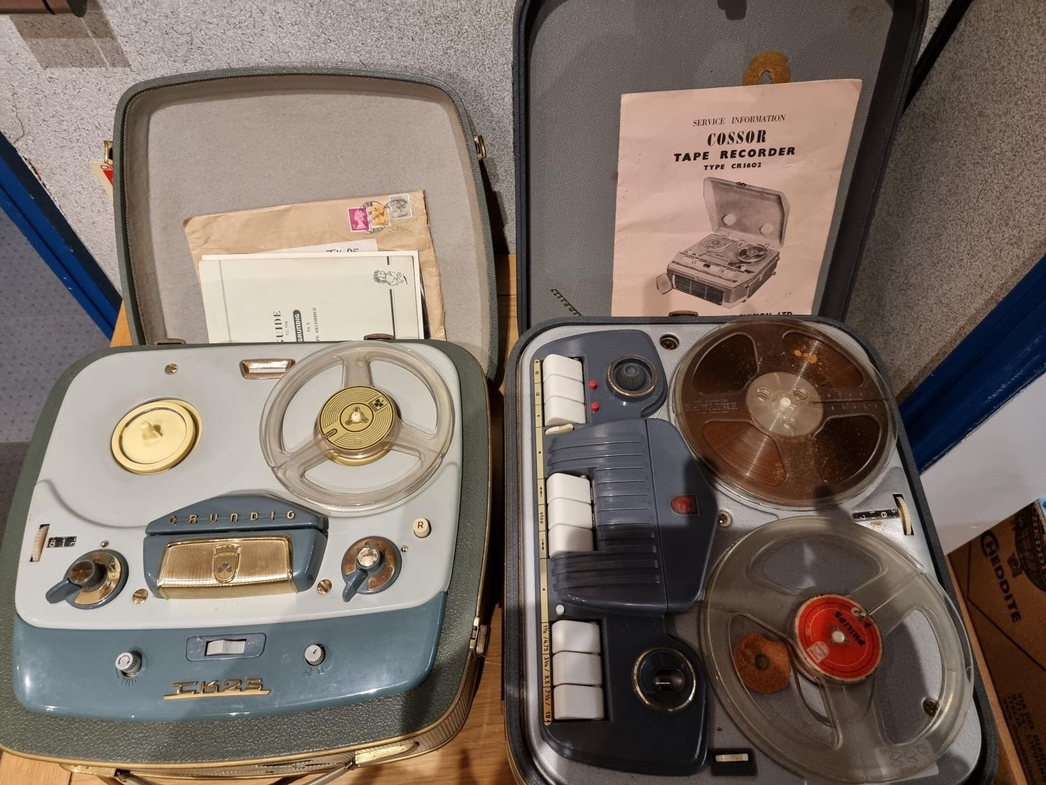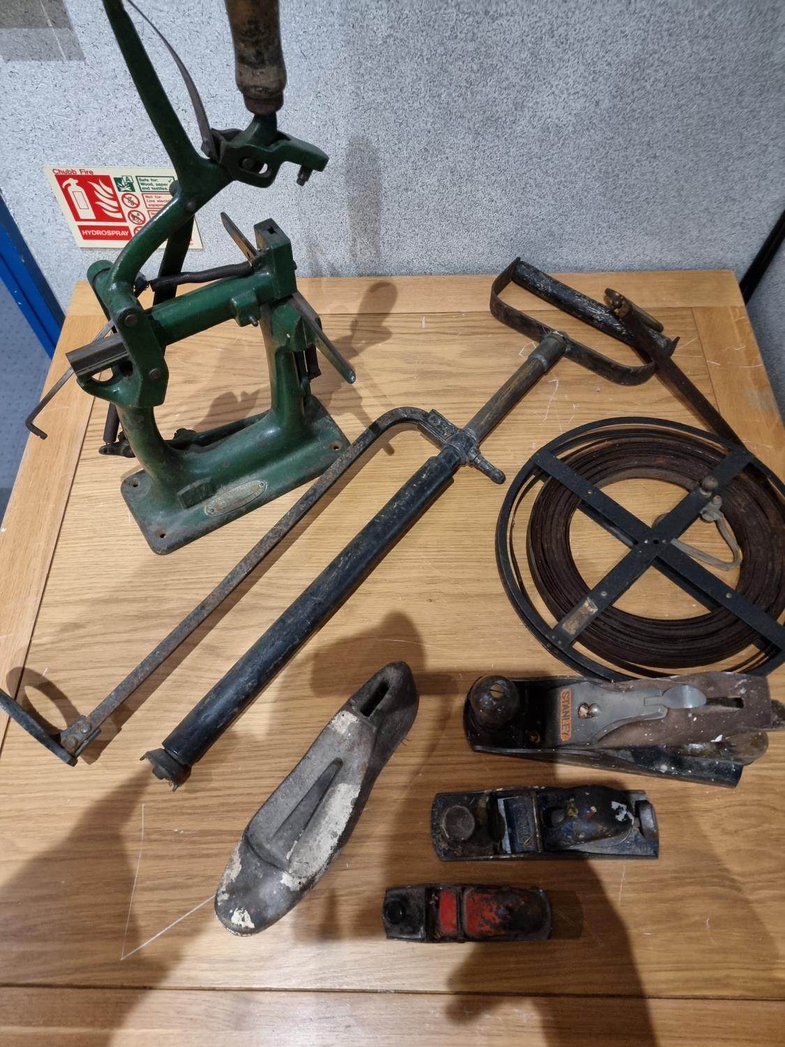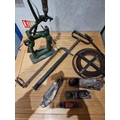 A Bristol stirrup hand pump together with Stanley & Record planes and a German made cast iron bench punch and a Grundig TK25 tape recorder and a Cossor type CR1602 tape recorder.