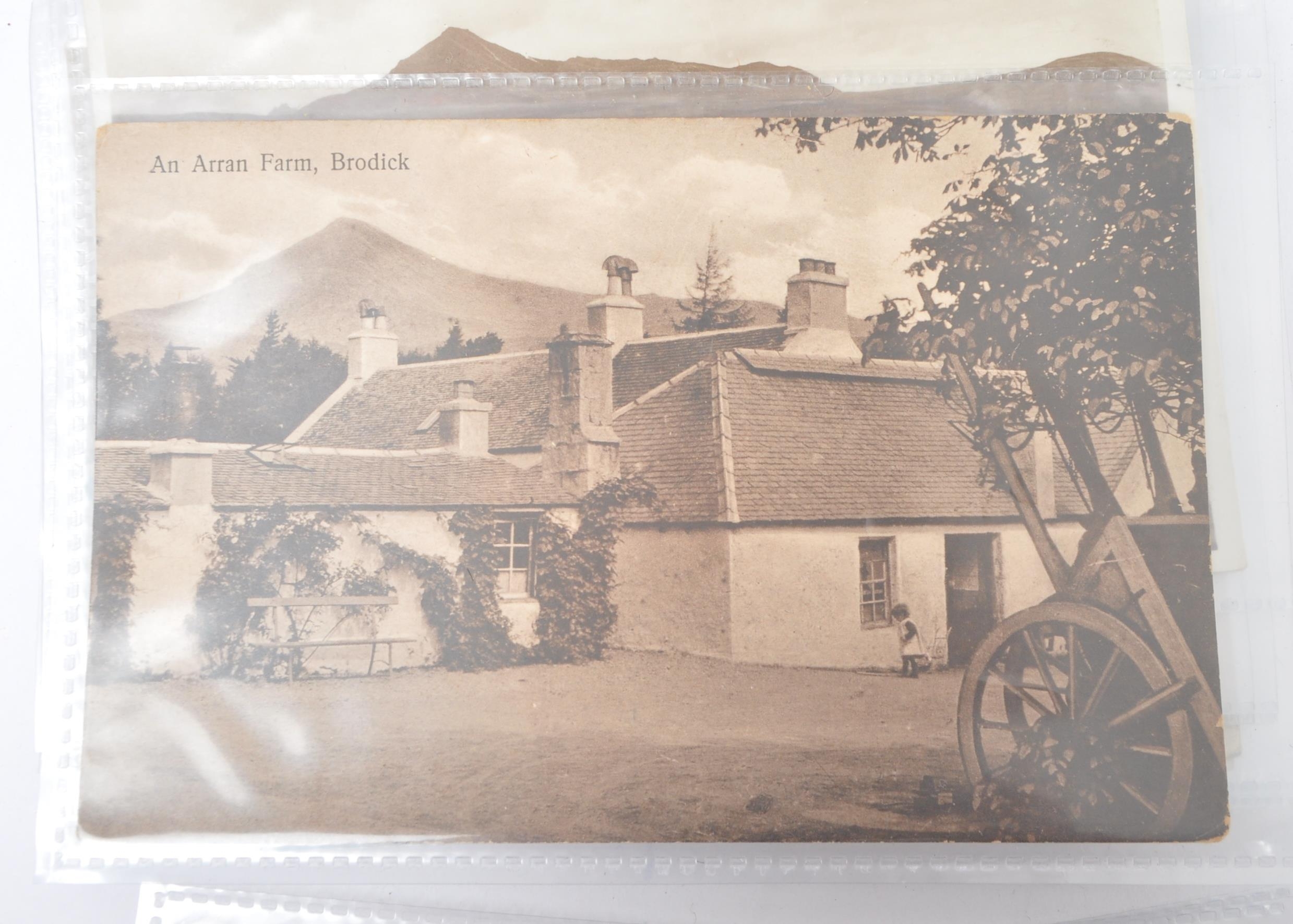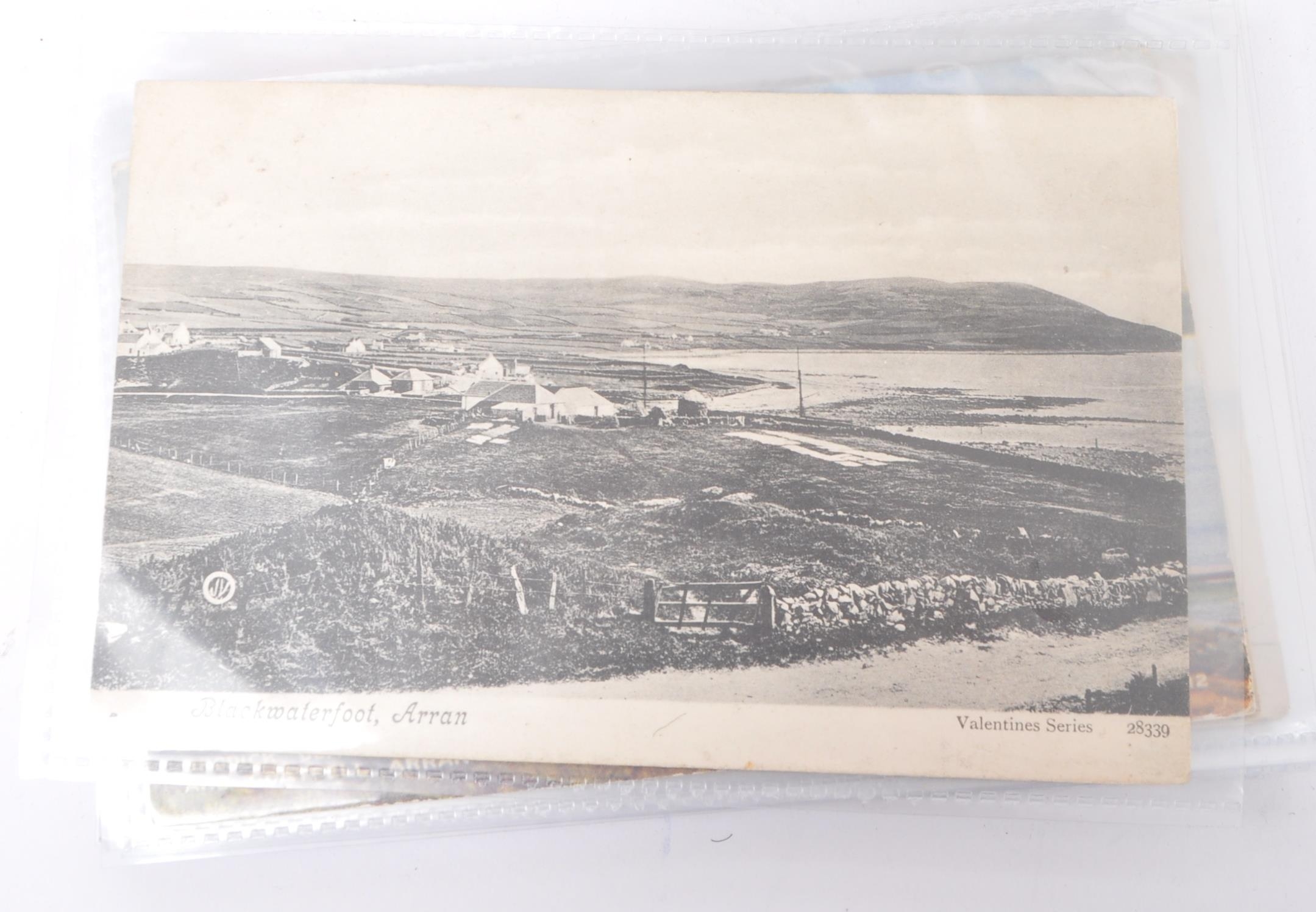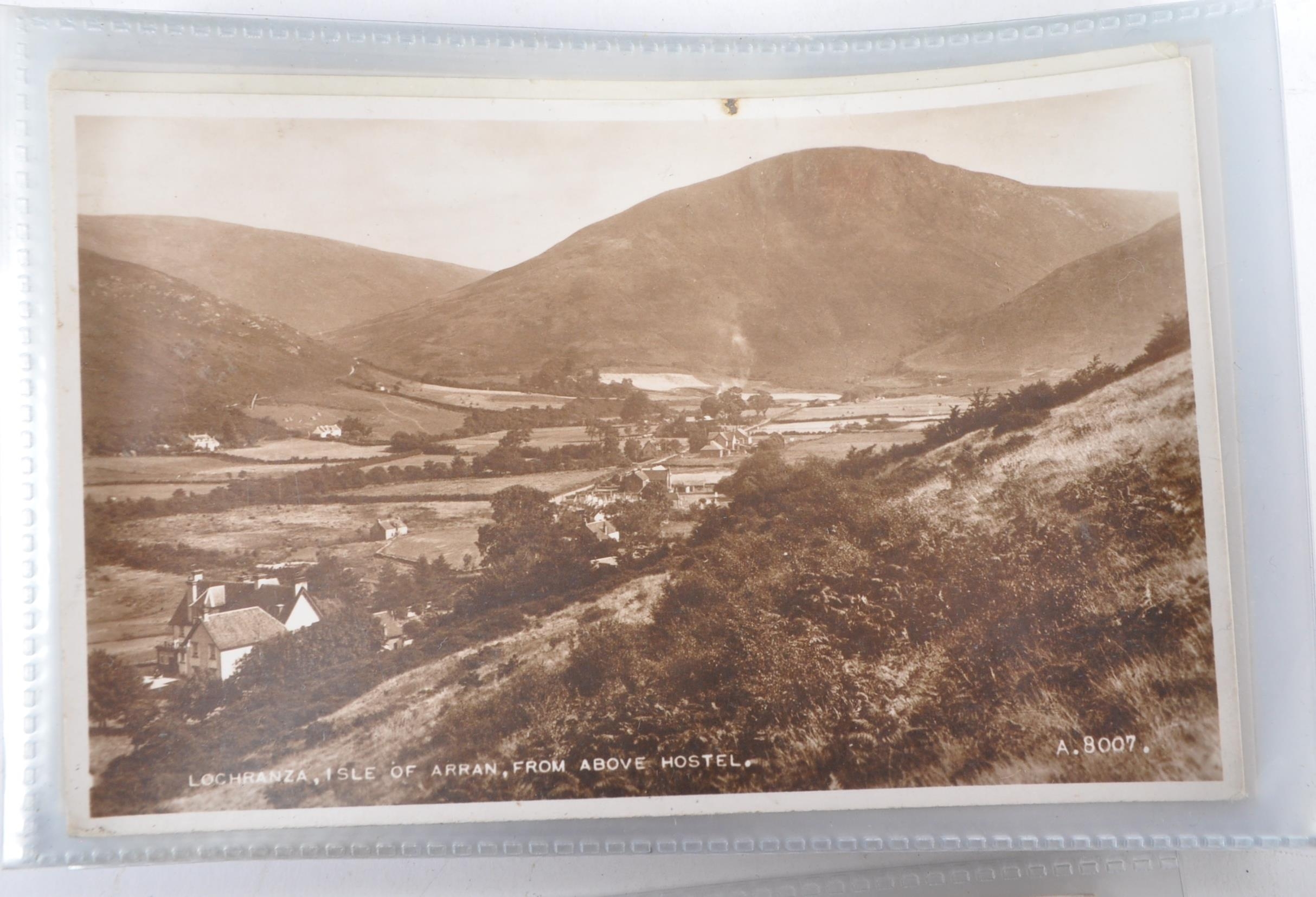 A collection of early to mid 20th century Scottish postcards. Majority landscape scenes, including places and locations, Arran, Whiting Bay, Pirnmill, Machrie, Dougrie, Corrie, Catacol, Brodick, Kildonan, Lamlash, Kings Cross, Goatfell and Glen Sannox. Present and categorised in three boxes.