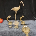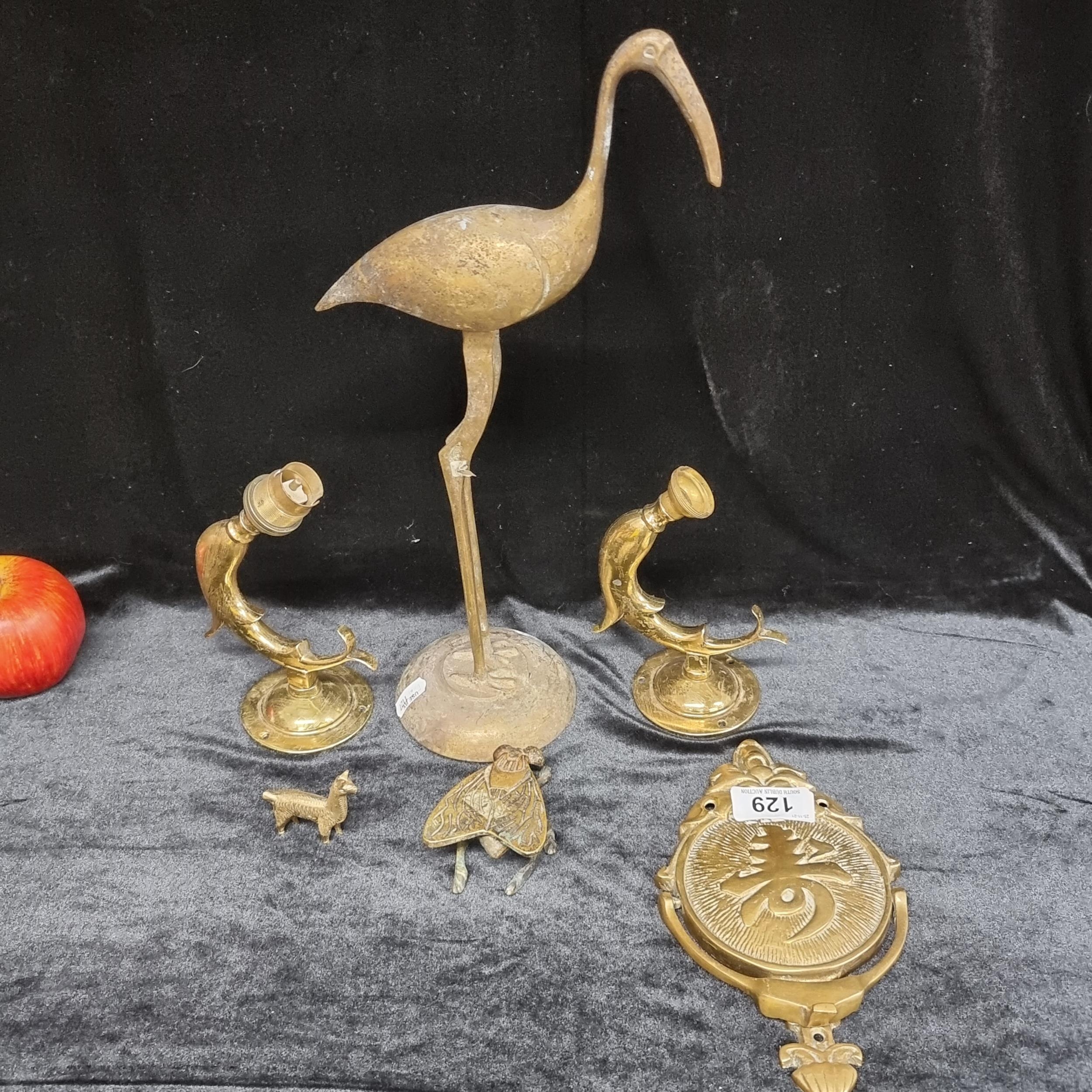 Six brass items including a large unusual brass doorknocker with Chinese symbol , two wall sconces and a tall flamingo sculpture, Fly box and alpaca with lovely patina.